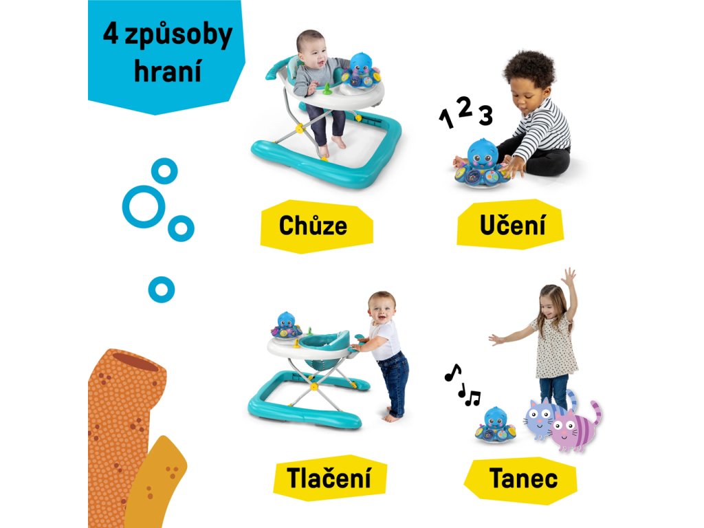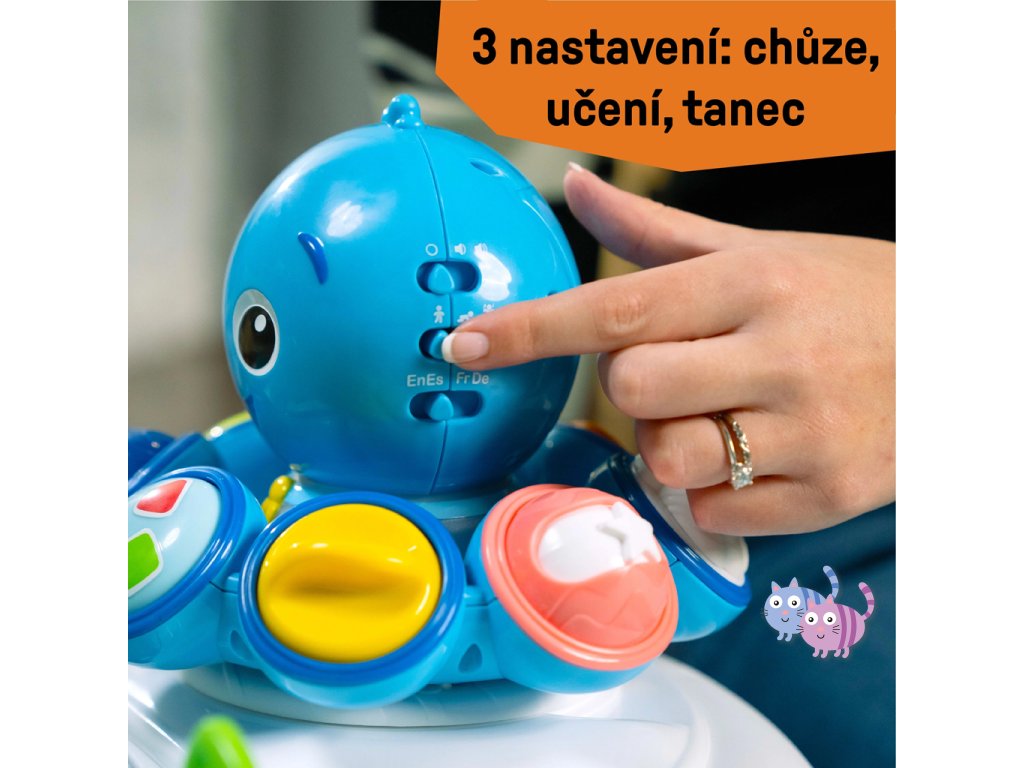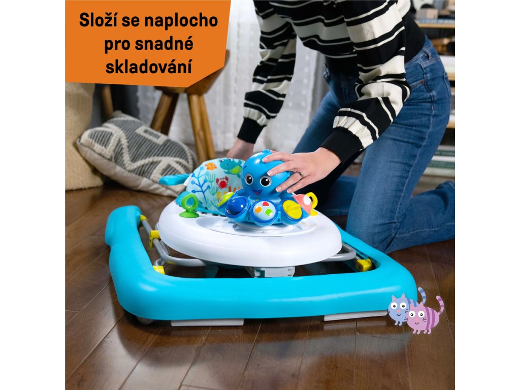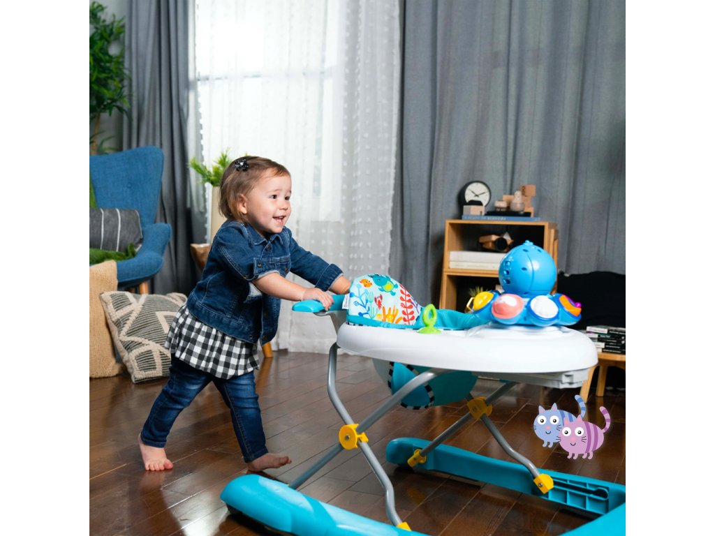 3 režimy objevování pro dětičky ve věku od 6 měsíců do 2 let: V prostředí Walking se každý krok v chodítku nebo za ním otáčí Opus a hraje melodie ze série Ocean Explorers. Ve vzdělávacím prostředí odpojte pro hru na podlaze, aby se děťátko mohlo učit barvy, čísla a tvary ve 4 jazycích – angličtině, španělštině, francouzštině a němčině. Dancing Setting umožňuje děťátku objevovat hudbu a zvuky oceánu. Chodítko se skládá naplocho a má 3 výškové polohy, aby děťátku perfektně sedělo. Sedací podložka je omyvatelná v pračce.