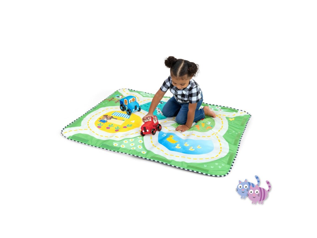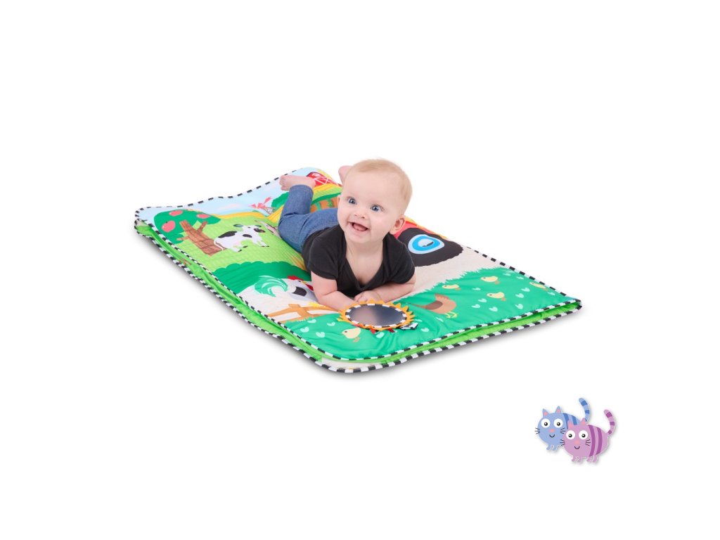 Objevte hrací deku, která roste spolu s vaším dítětem od narození až po předškolní věk! Deka na hraní nabízí až 4 herní režimy, které podporují vývoj dítěte od 0 měsíců do 4+ let. Tato extra velká a měkká podložka je ideální pro čas na bříšku, hraní na zádech, sezení i aktivní hru pro batolata. Obsahuje 3 odnímatelné závěsné hračky – zrcátko ve tvaru slunečnice, šustící mrkvičku a plyšového housenkového kamarádka Cala. Dvě hudební autíčka (traktor a pickup) se zvuky farem, zvířat a 30+ melodiemi pomáhají podpořit pohyb a rozvoj motoriky. Pro sedící děti nabízí 3D interaktivní farmu se senzorickým třídičem tvarů a zvedacími klapkami, které ukrývají překvapení. Pro větší děti se podložka rozloží do herní cesty, po které mohou vozit hračkářské autíčka jako na výletě po farmě! Tento hrací set je skvělým dárkem pro každé miminko – podporuje smyslový vývoj, motorické dovednosti a učení formou hry již od prvních dní.