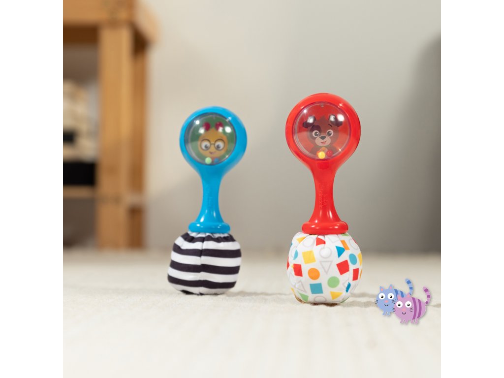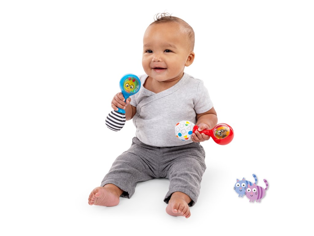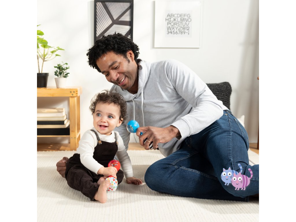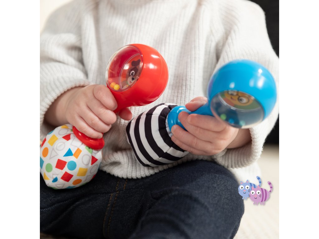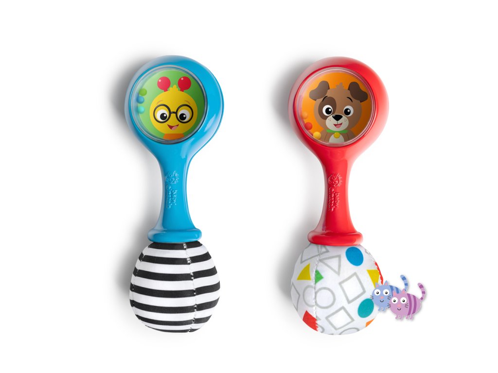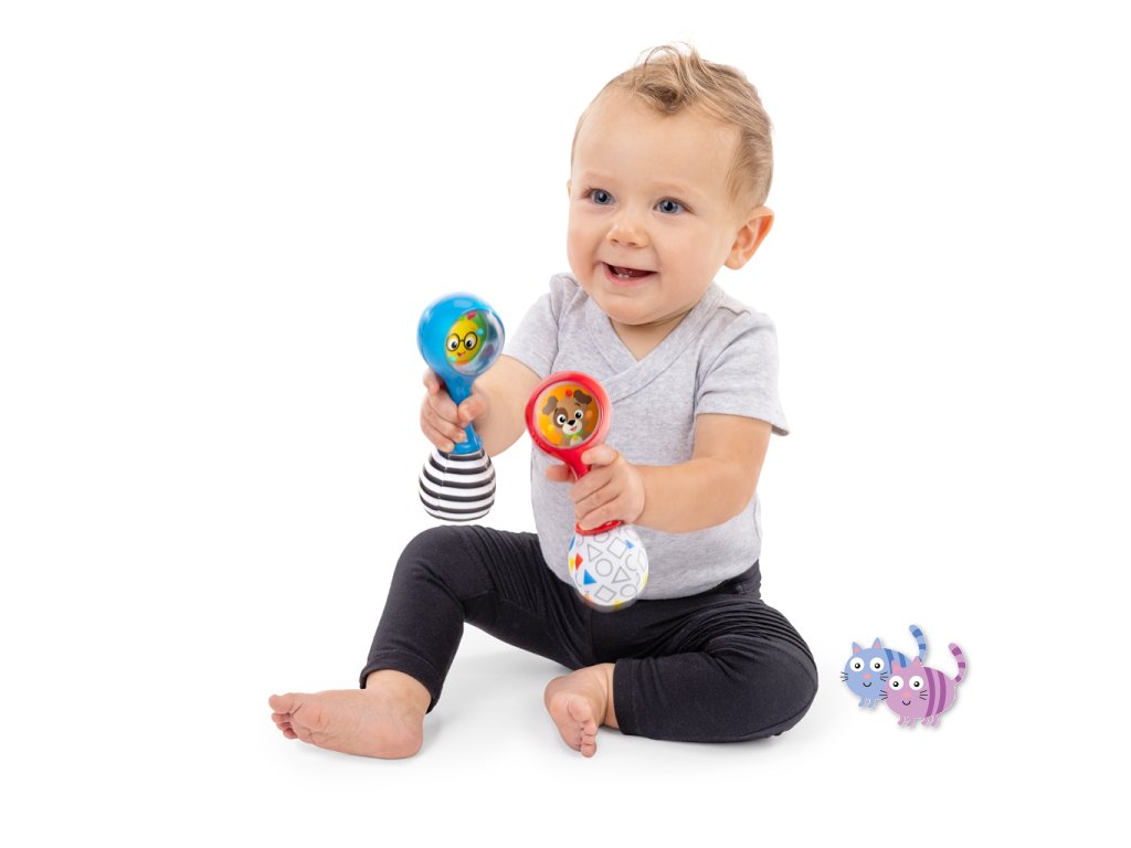 Sada hudebních nástrojů marakas je navržena speciálně pro malé ručičky a pomáhá dětem od 3 měsíců rozvíjet jemnou motoriku, objevovat svět hudby a bavit se. Každým zatřesením děti vidí a slyší barevné chrastící korálky. Měkké plyšové konce vydávají při zmáčknutí šustící zvuk, což stimuluje hmat i sluch. Zrcátko ukryté pod látkovou klapkou podporuje sebeuvědomování. Jeden z plyšových konců má vysokokontrastní černobílý vzor pro rozvoj zraku, druhý zase vzory tvarů a barev na úvod do světa učení. Rumba koule představují oblíbené postavičky pejska Deana a housenku Cala ze světa Baby Einstein. Skvěle doplní další hudební hračky Baby Einstein.