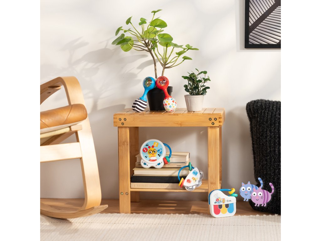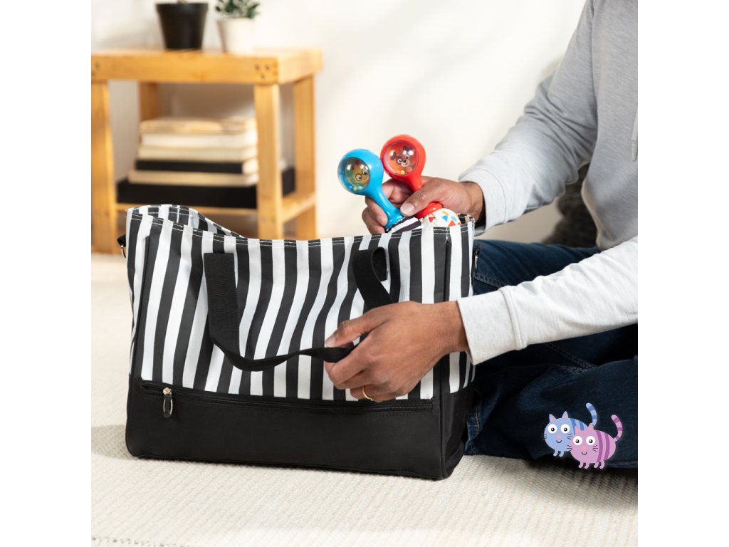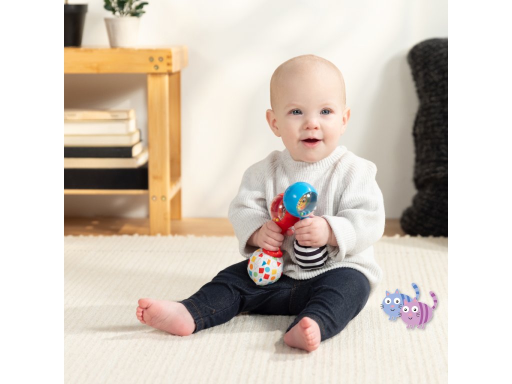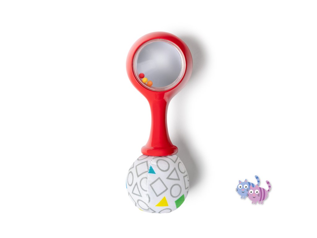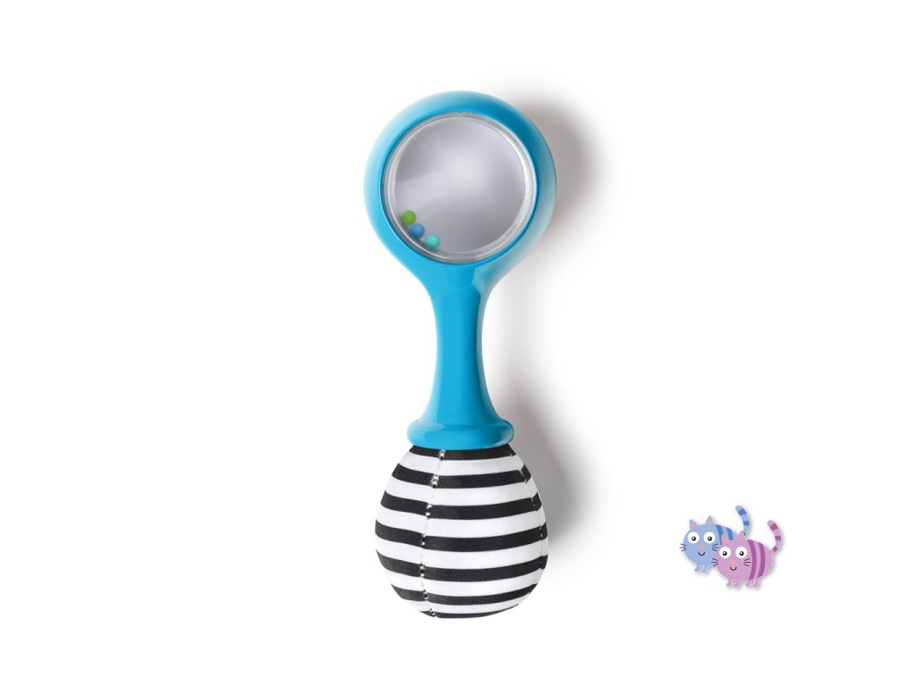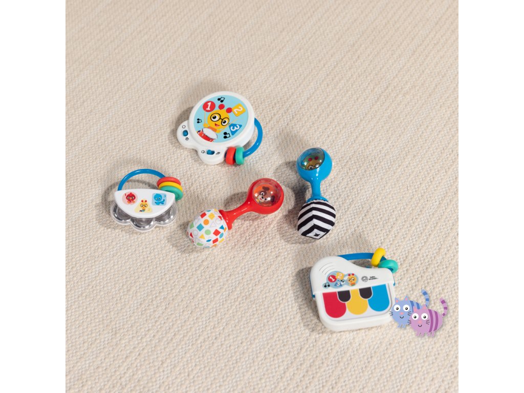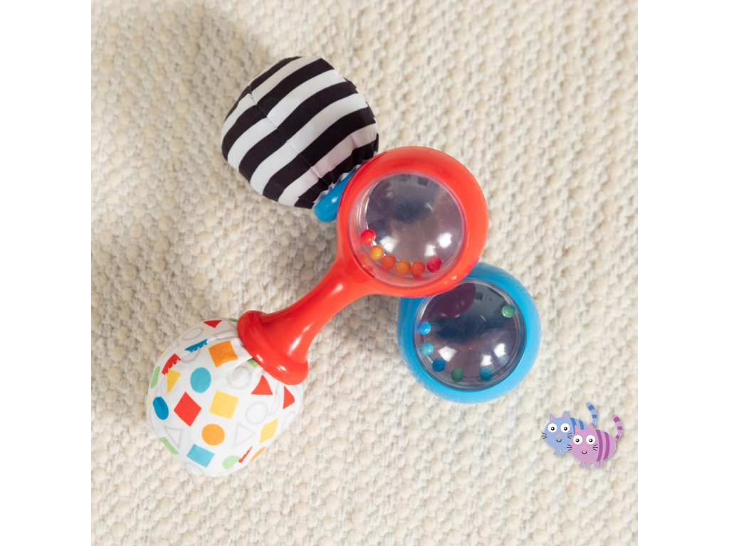 Sada hudebních nástrojů marakas je navržena speciálně pro malé ručičky a pomáhá dětem od 3 měsíců rozvíjet jemnou motoriku, objevovat svět hudby a bavit se. Každým zatřesením děti vidí a slyší barevné chrastící korálky. Měkké plyšové konce vydávají při zmáčknutí šustící zvuk, což stimuluje hmat i sluch. Zrcátko ukryté pod látkovou klapkou podporuje sebeuvědomování. Jeden z plyšových konců má vysokokontrastní černobílý vzor pro rozvoj zraku, druhý zase vzory tvarů a barev na úvod do světa učení. Rumba koule představují oblíbené postavičky pejska Deana a housenku Cala ze světa Baby Einstein. Skvěle doplní další hudební hračky Baby Einstein.