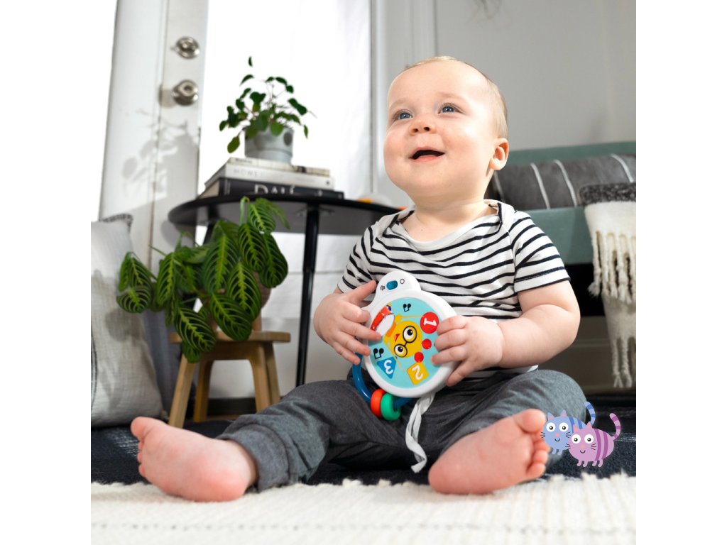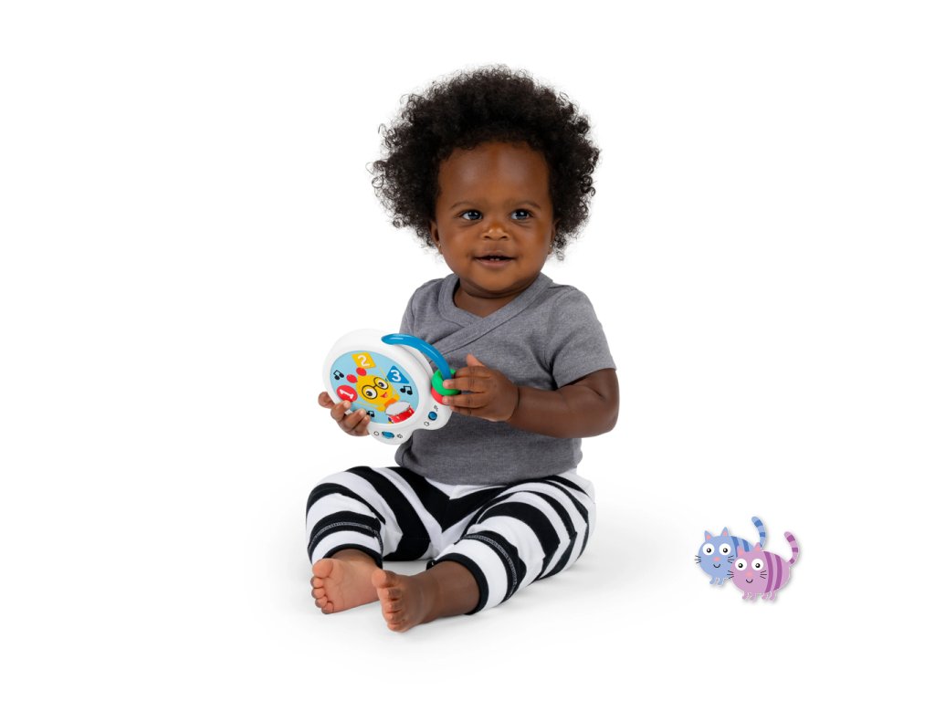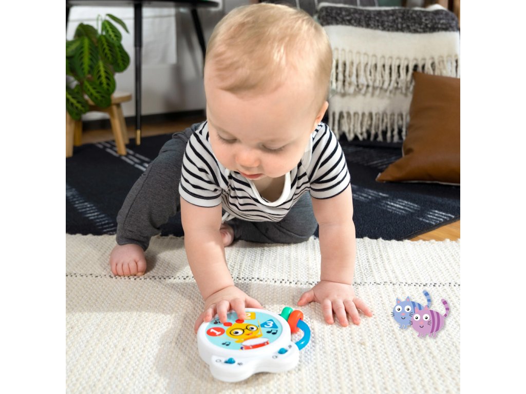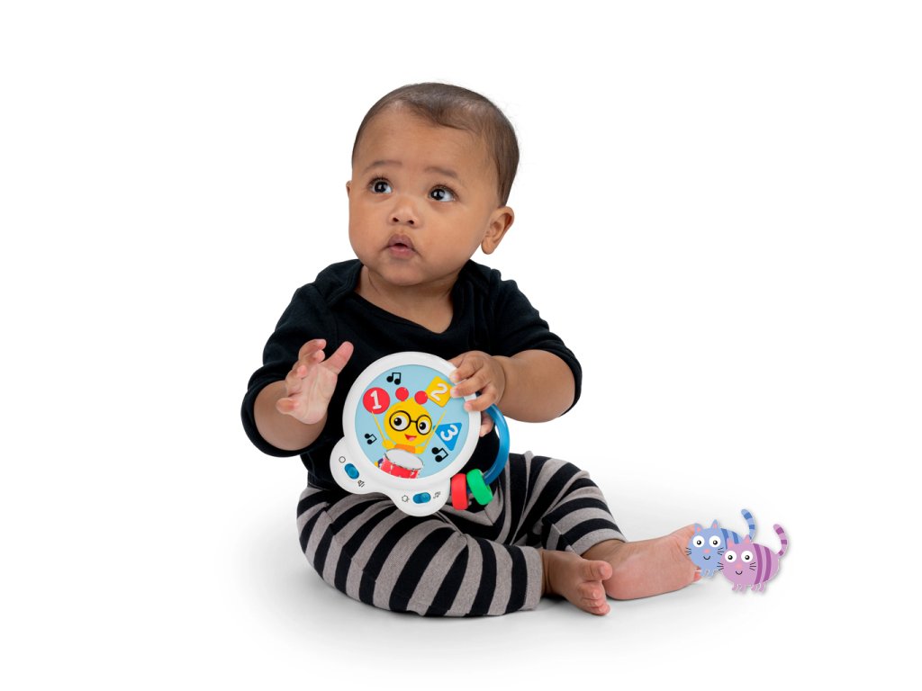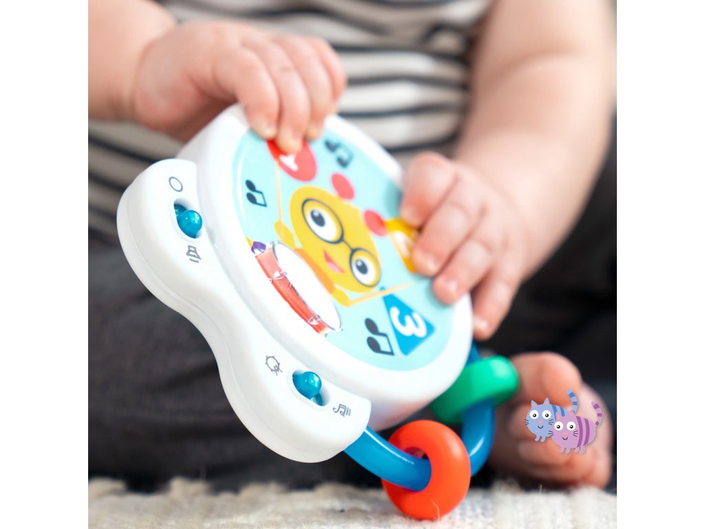 Pomozte miminku objevovat hudbu s hudební hračkou – bubnem Tiny Tempo. Tento lehký a přenosný buben obsahuje 21 reálných zvuků nástrojů, 6 klasických melodií a dvojitý prstenec s korálky, který podporuje hudební objevování, učení se principu příčina–následek a rozvoj jemné motoriky. Díky dvěma herním režimům může miminko v režimu Drum Play vytvářet jedinečné rytmy pouhým klepnutím, nebo si v režimu Melody zahrát spolu se 6 klasickými skladbami. Každé ťuknutí podporuje učení příčina-následek. Hračka s korálky pomáhá rozvíjet obratnost a jemnou motoriku. Barevné nálepky seznamují s barvami, čísly a tvary a oblíbený hudební kamarád Cal the Caterpillar z knih a videí Baby Einstein povzbuzuje miminko při hudebním objevování. Buben je ideální pro hudbu na cestách – je malý, lehký, snadno se drží i třese a podporuje hudební zapojení v kočárku, na cestách i při hře doma. Vyžaduje 2 AA baterie. Čistí se jednoduše otřením.