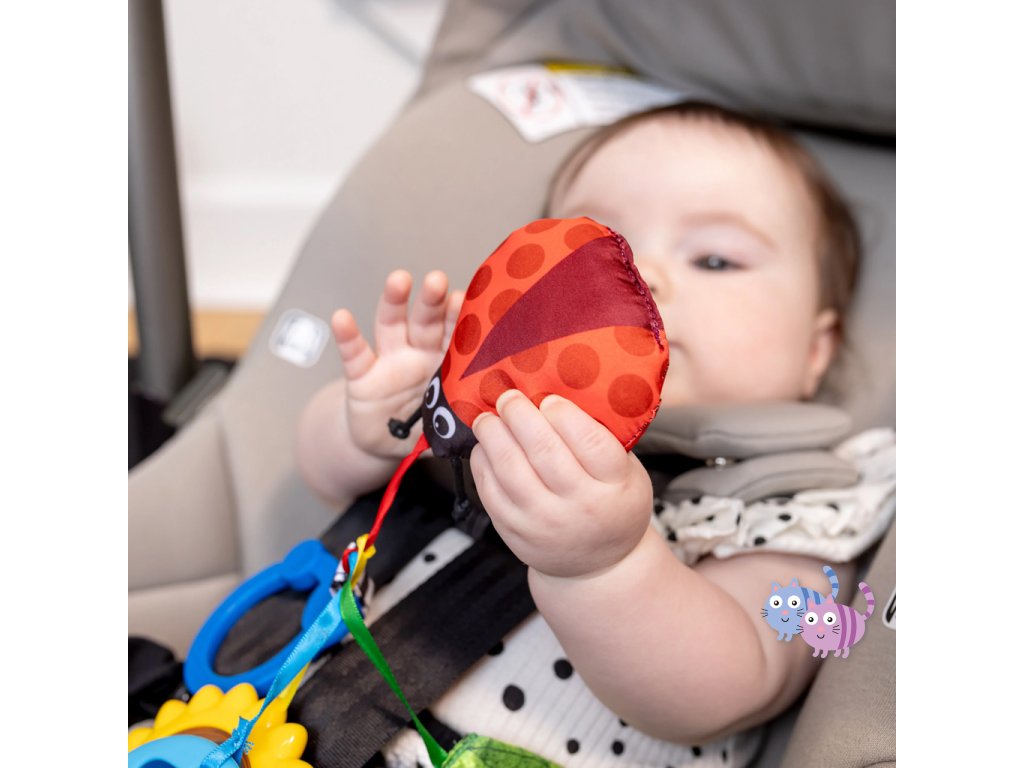 - Obsahuje 4 hračky: berušku se zvukem, sluníčko s chrastícími korálky, texturovanou zeměkouli a šustící lístek s Calom the Caterpillar.