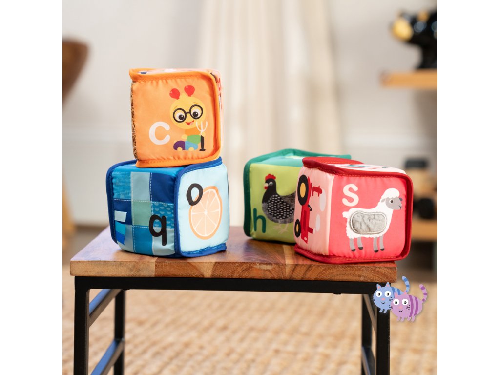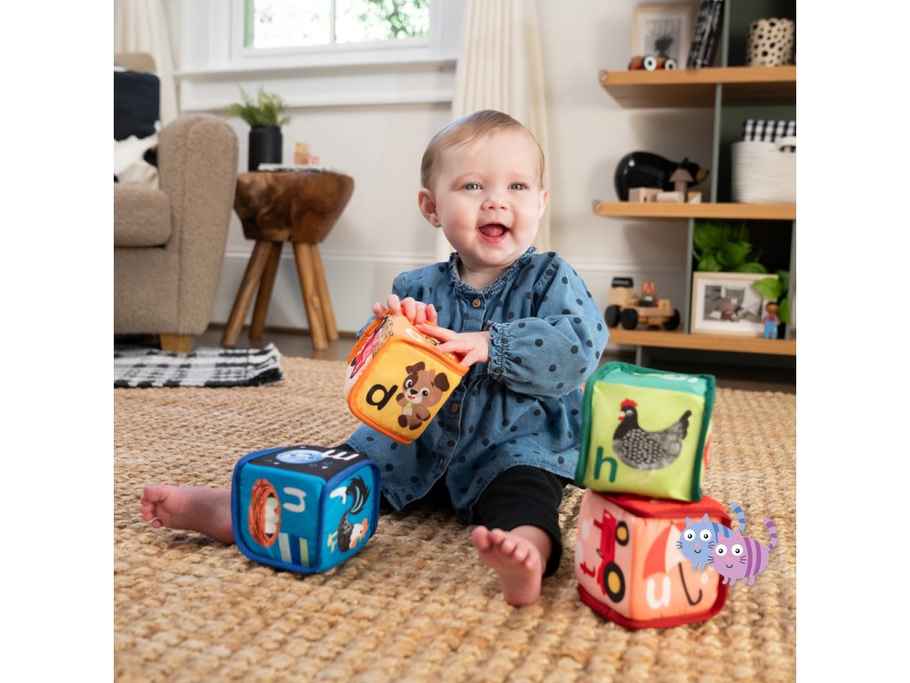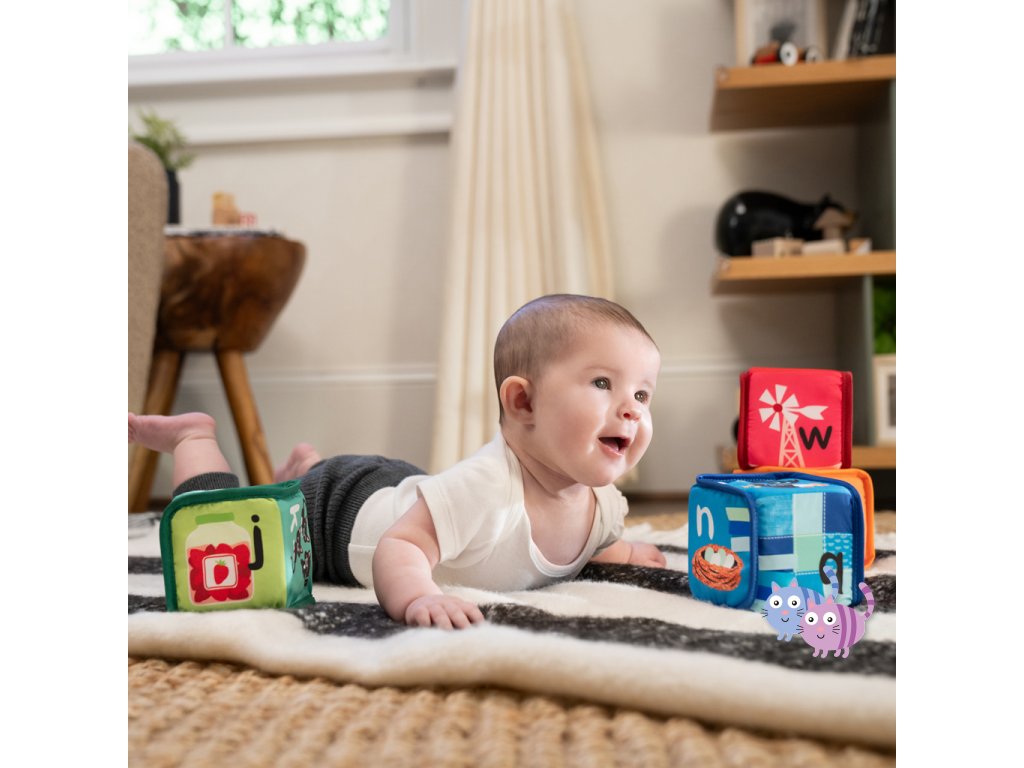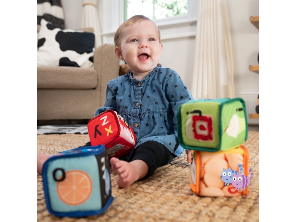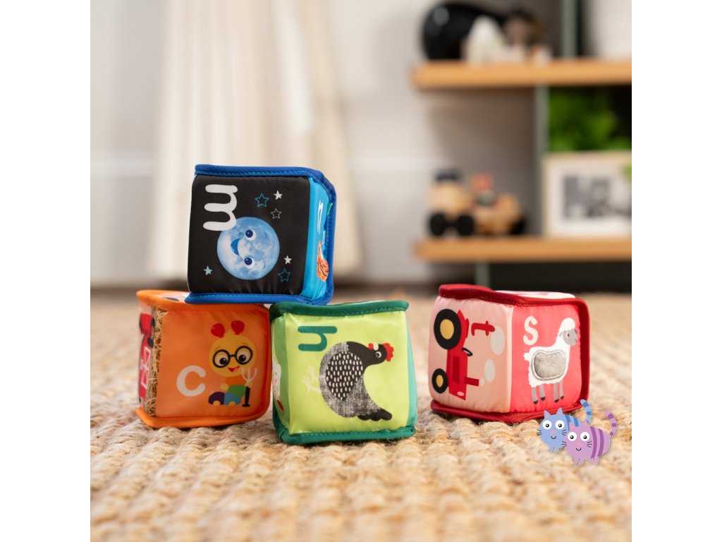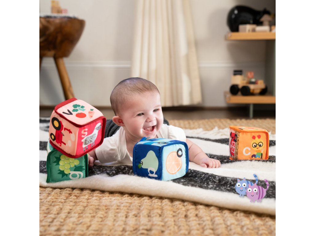 Objevování abecedy a smyslového vnímání ještě nikdy nebylo tak zábavné! Měkké kostky jsou navrženy pro malé rukojeti, které chtějí stavět, házet, mačkat - jednoduše objevovat. Každá ze 4 kostek je plná barev, zvuků a různých textur, které podporují rozvoj jemné motoriky a principu „příčina a následek“ .