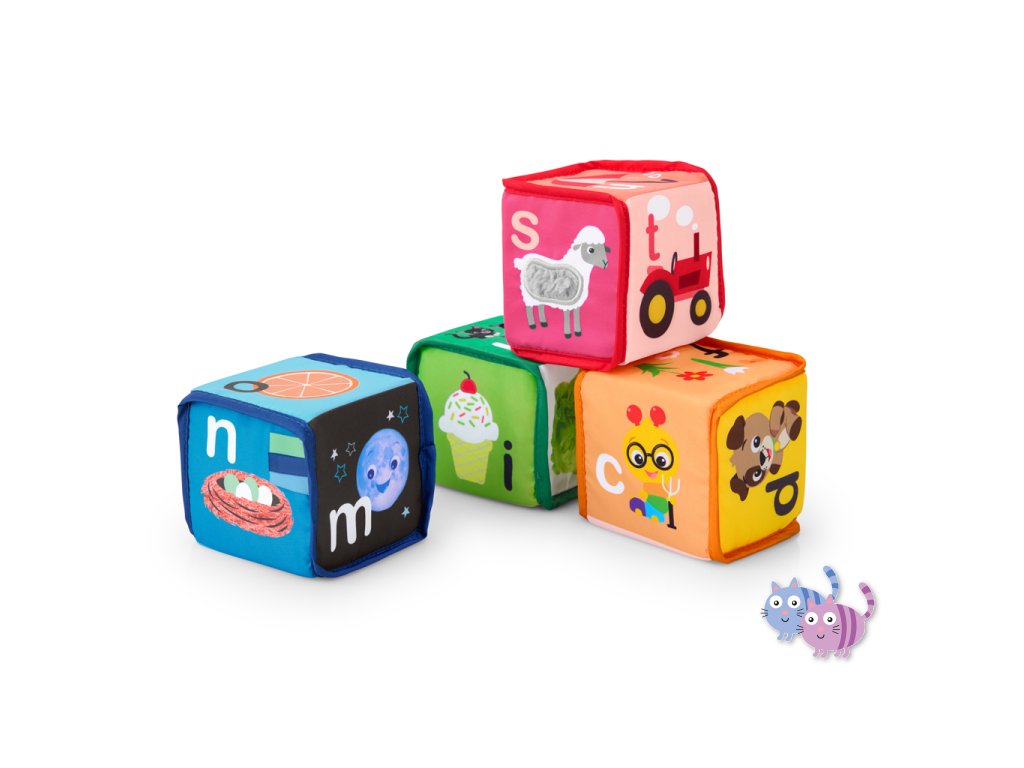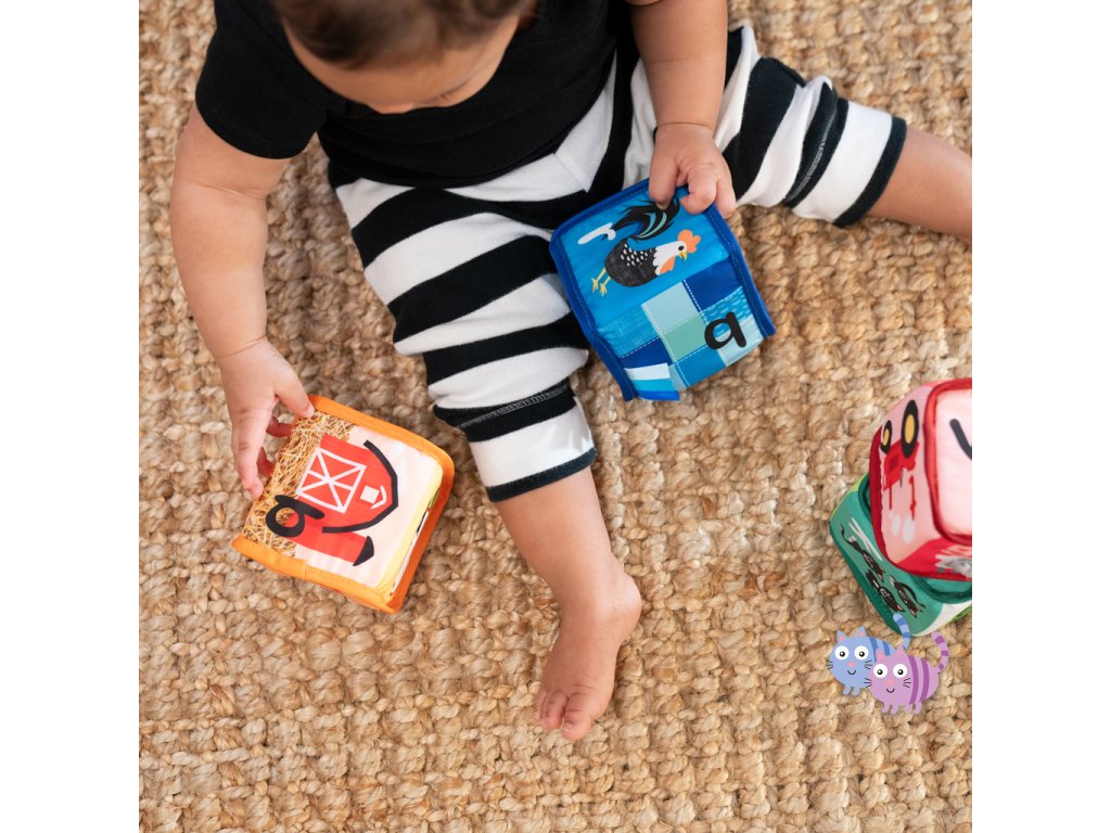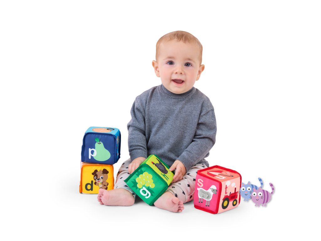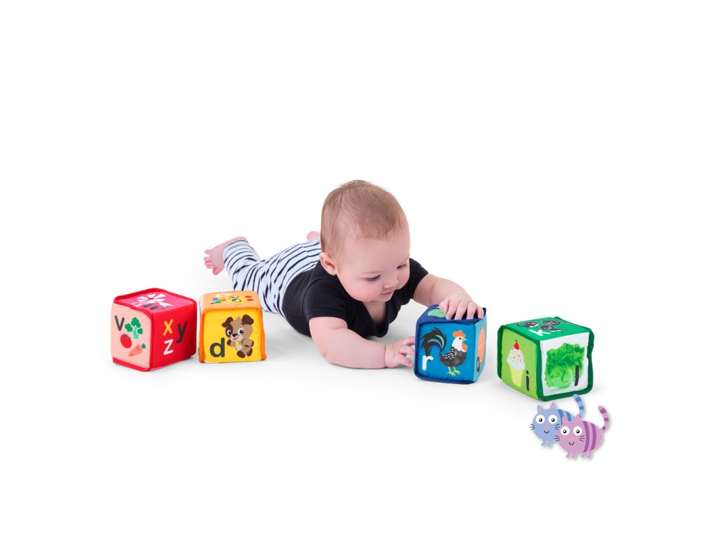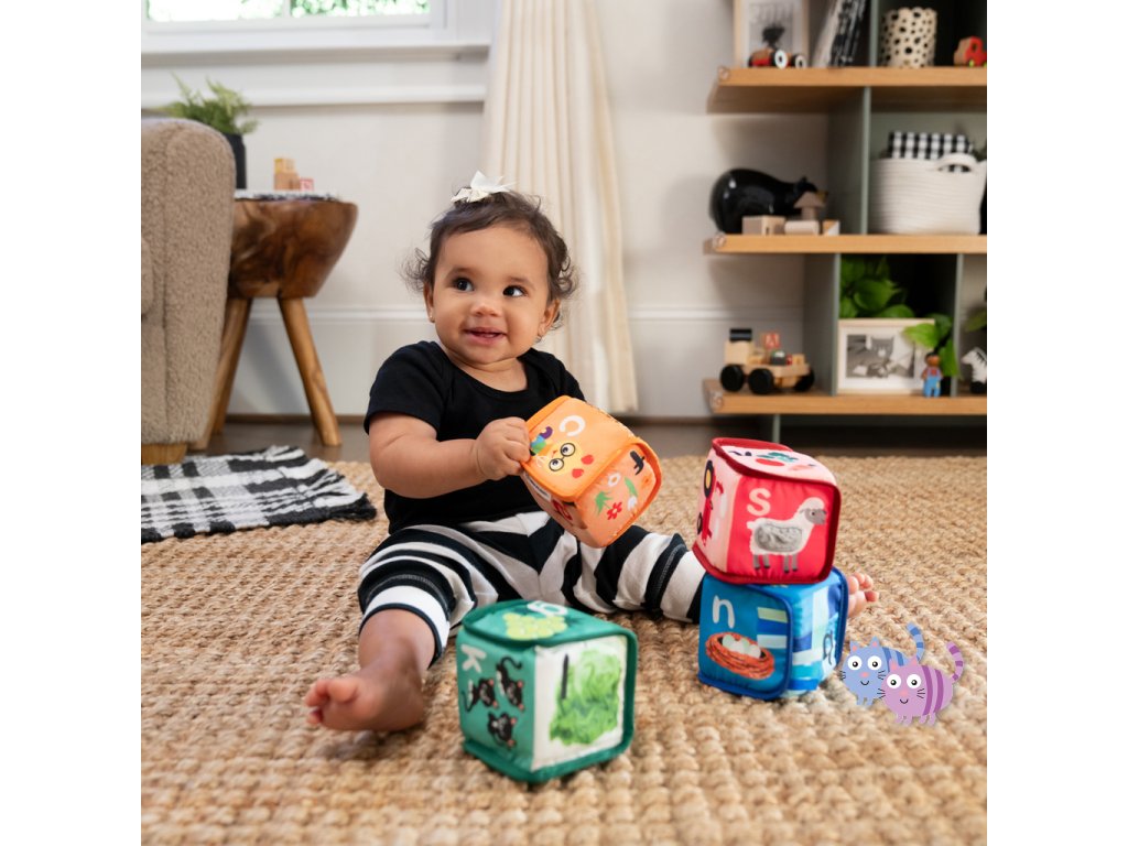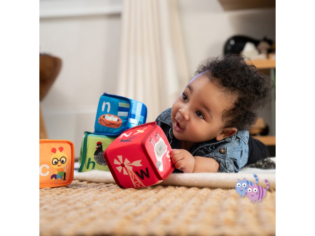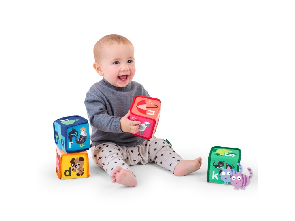 Objevování abecedy a smyslového vnímání ještě nikdy nebylo tak zábavné! Měkké kostky jsou navrženy pro malé rukojeti, které chtějí stavět, házet, mačkat - jednoduše objevovat. Každá ze 4 kostek je plná barev, zvuků a různých textur, které podporují rozvoj jemné motoriky a principu „příčina a následek“ .