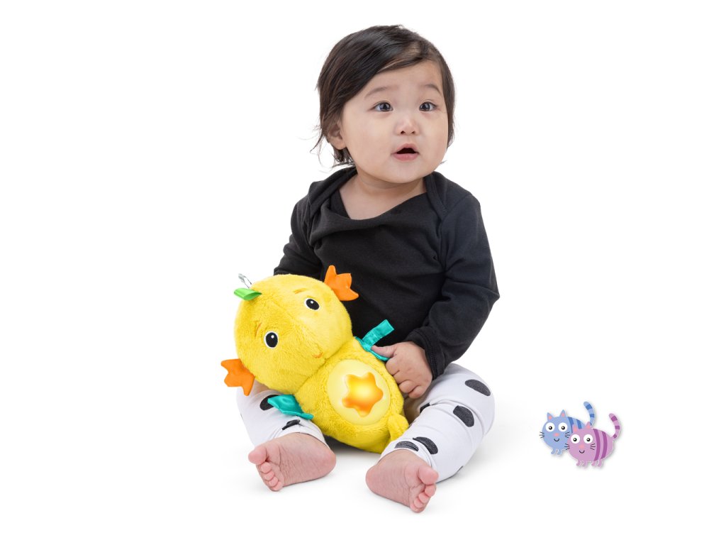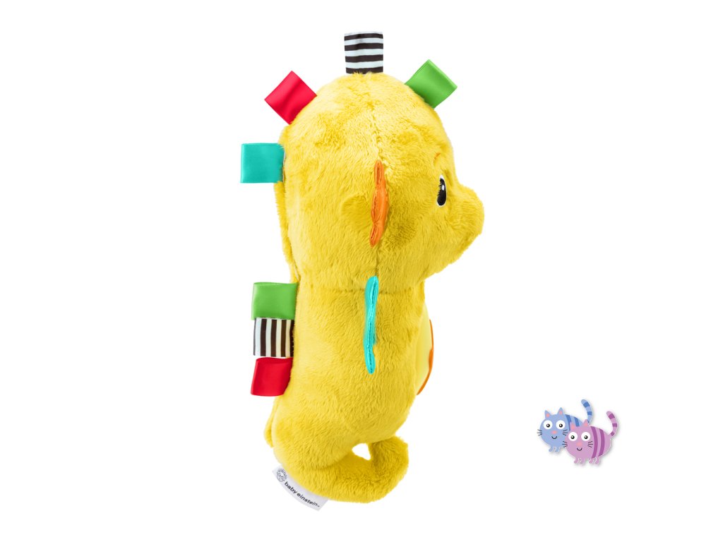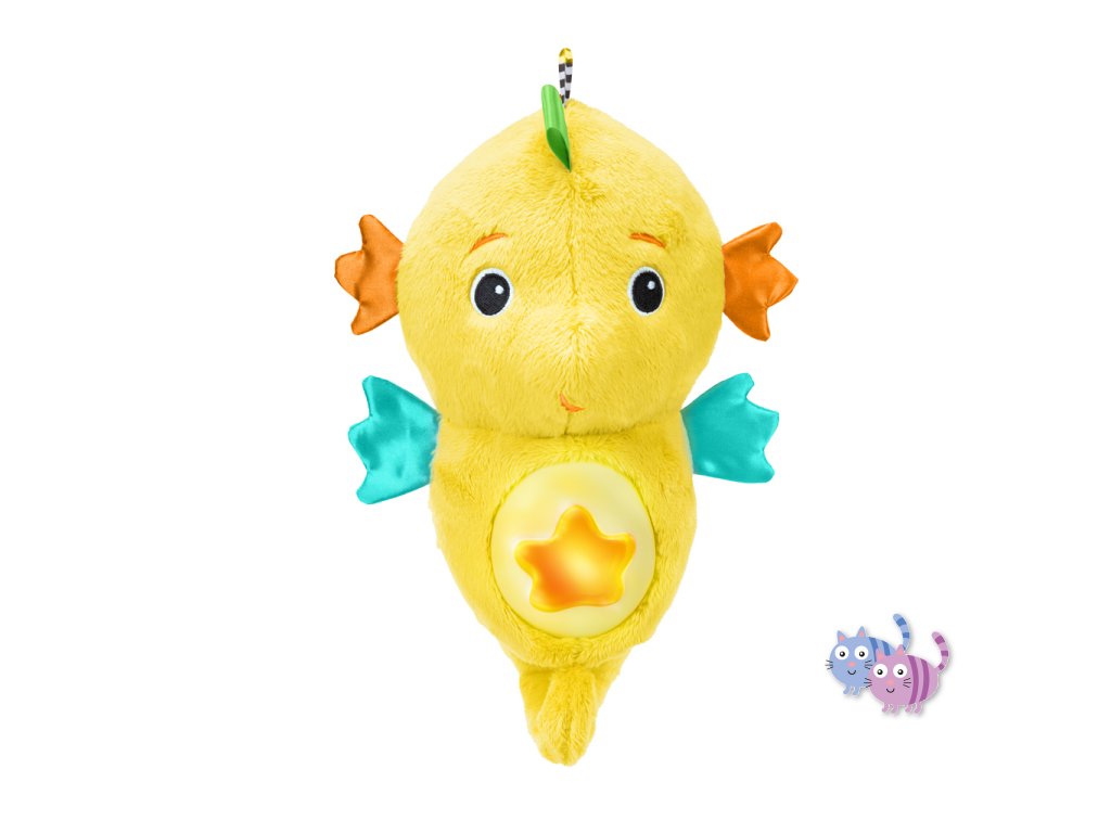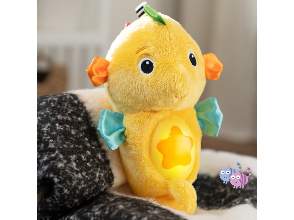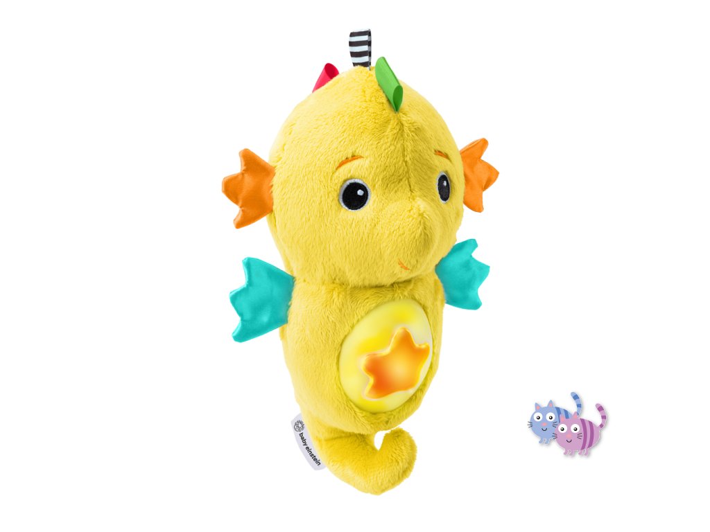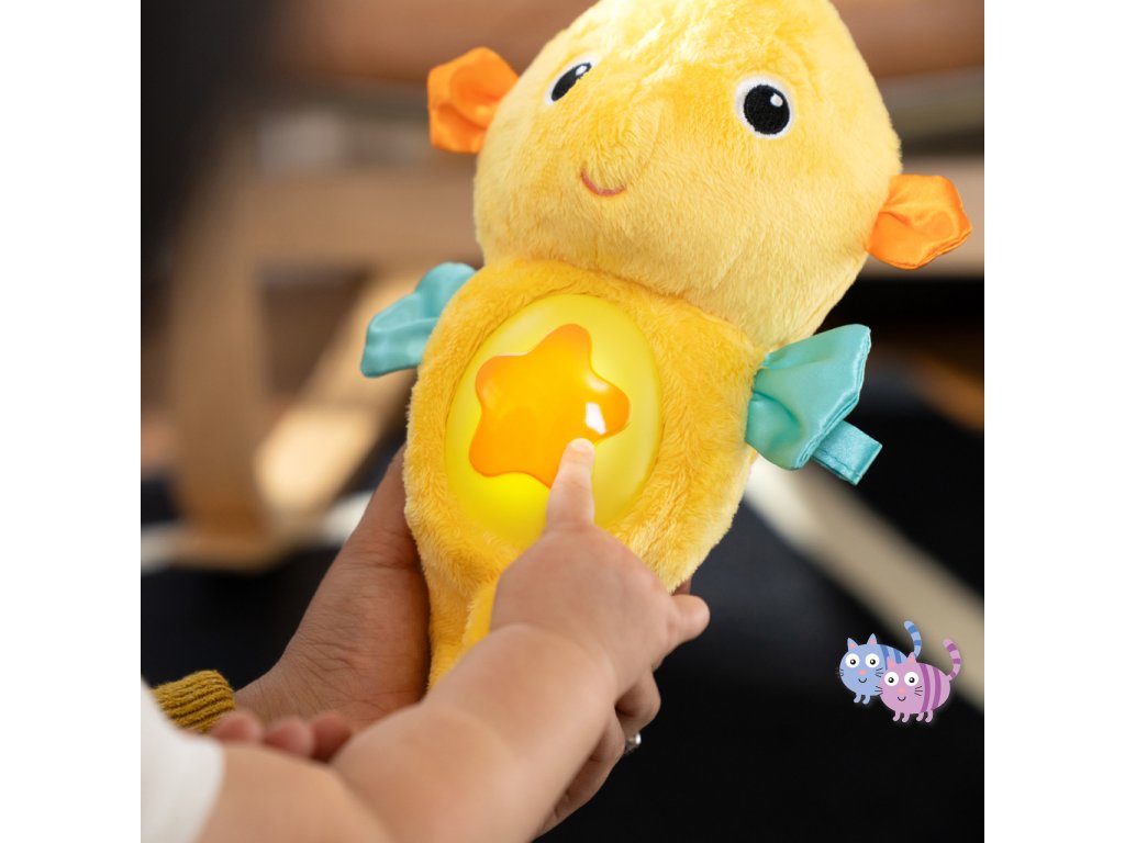 Díky technologii reakce na pláč reaguje mořský koník na pláč dítěte – automaticky spustí až 7 minut melodií nebo zvuků oceánu. Děťátko se může naučit samé uklidnit – stačí jemně zmáčknout hvězdičku na bříšku koníka, a ten zazáří jemnými barvami (až 5 odstínů) nebo přehraje až 15 minut klasické hudby či přírodních zvuků. Na bříšku se nachází i držák na dudlík, aby měl drobeček svůj oblíbený dudlík vždy po ruce. Navíc má koník pestrobarevné stužky, které stimulují hmat a zrak miminka. Ideální dárek pro děti již od narození. Perfektní tip na dárek k narození miminka.