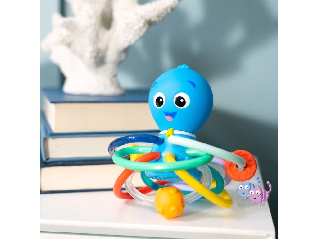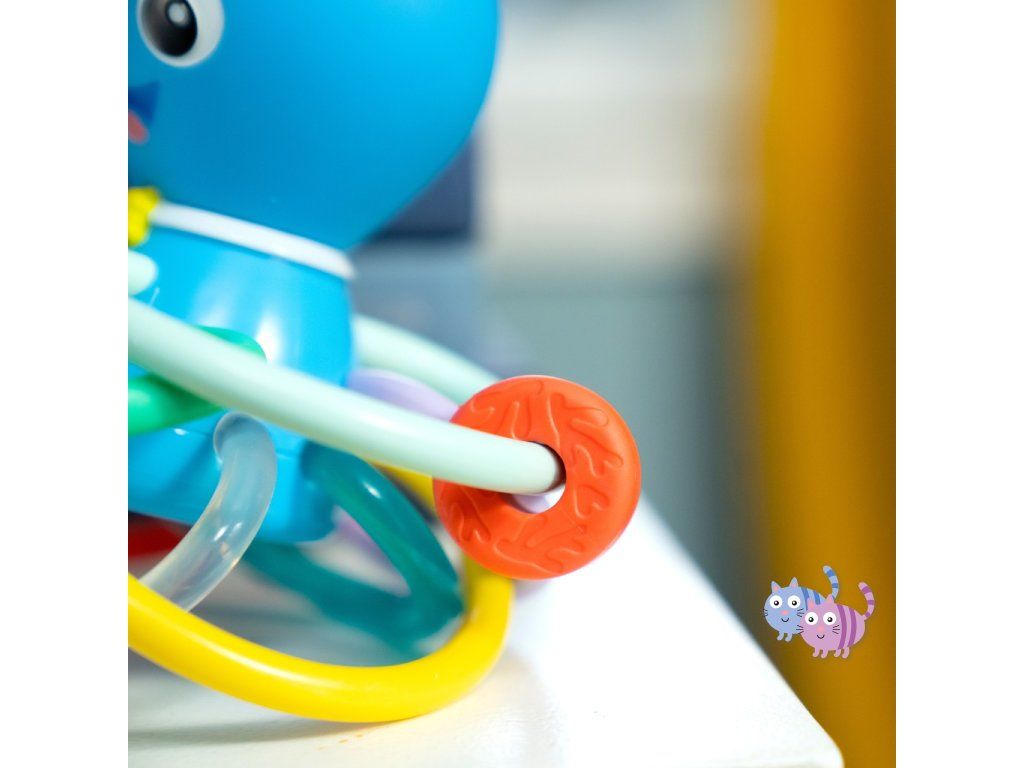 Hračka na kousání a chrastítko Baby Einstein Ocean Explorers pomáhá uklidnit bolavé dásně a stimulovat smysly dítěte díky různým texturám, jasným barvám a skrytému chrastítku. Toto barevné kousátko podporuje rozpoznávání barev a skryté chrastítko odměňuje zvědavost dítěte při každém zatřesení.