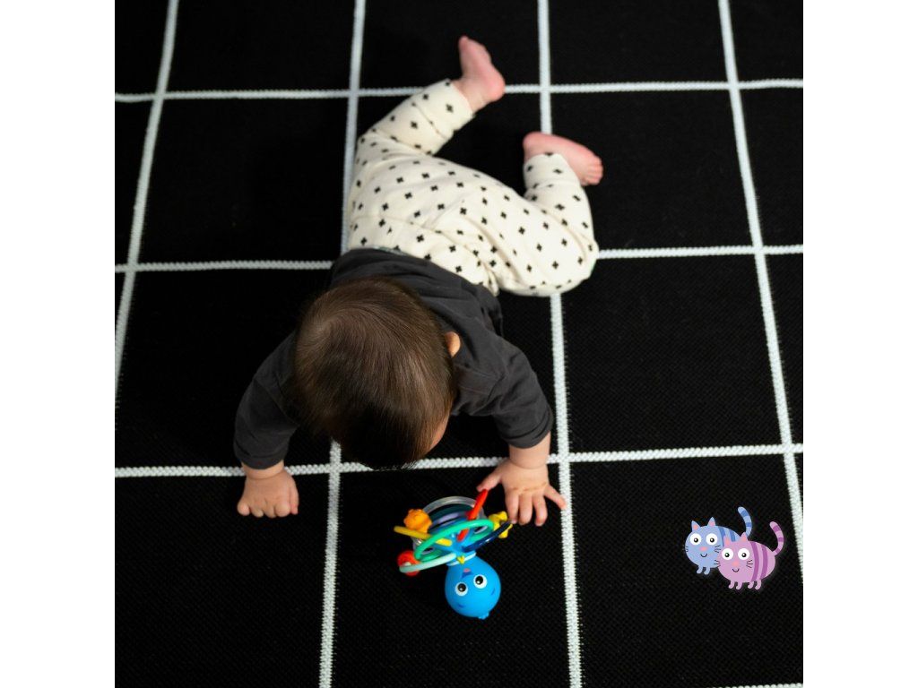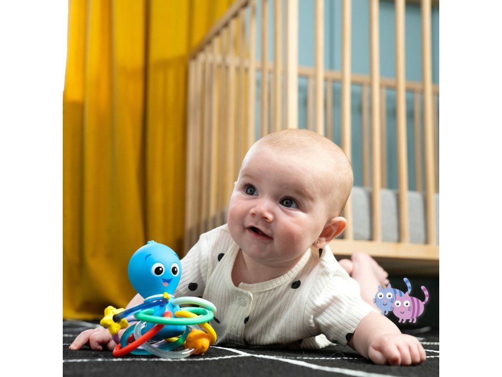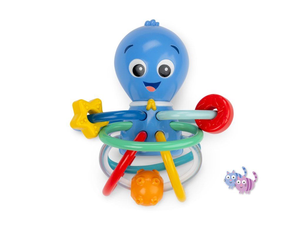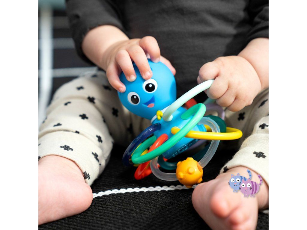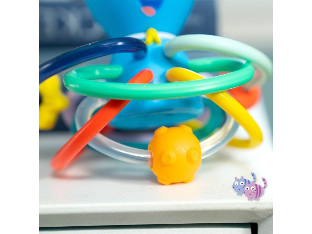 - obsahuje chobotnici, 6 kroužků, honičku s korálky a skryté chrastítko, které zapojují smysly dítěte během hry doma nebo na cestách