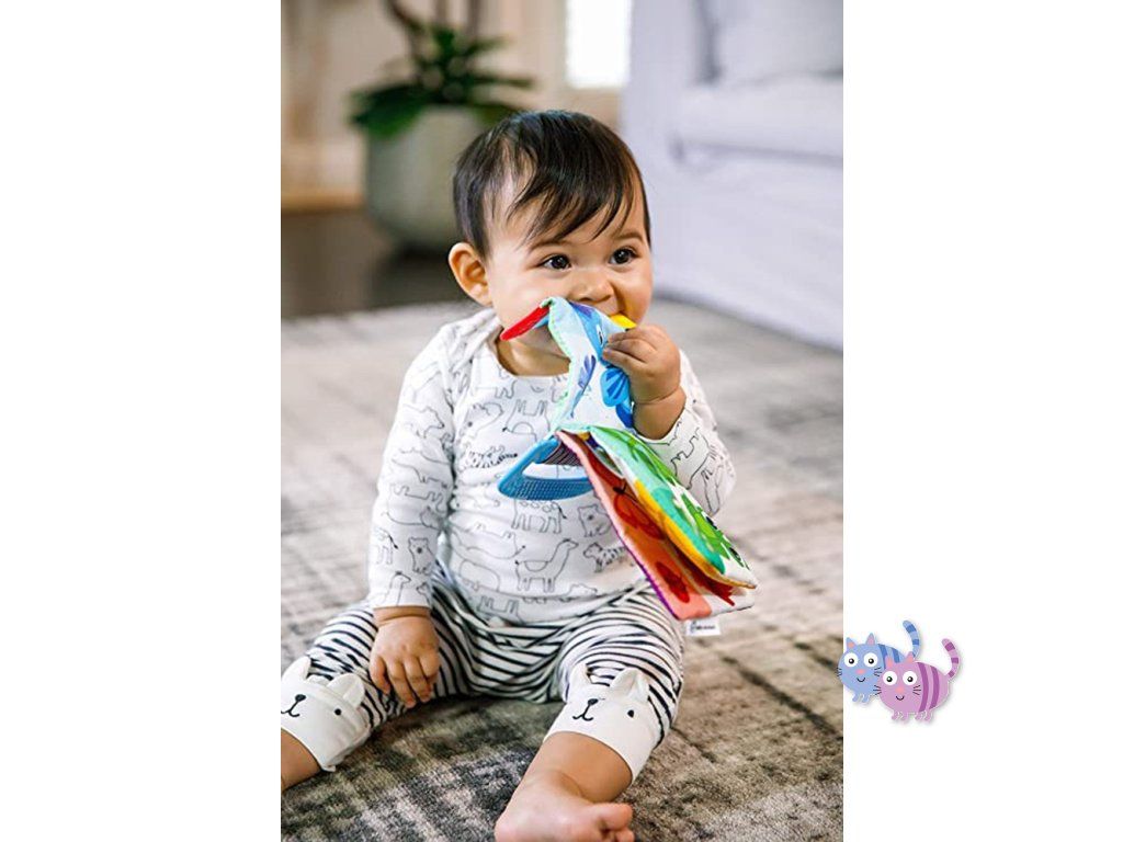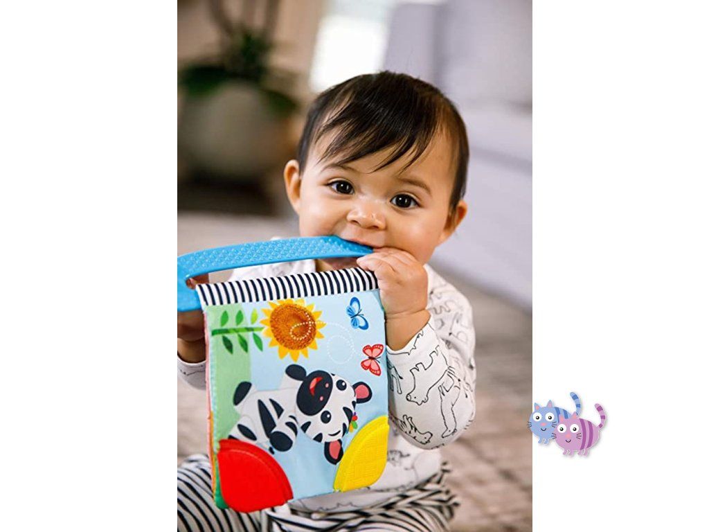 Díky měkké struktuře a tvaru se dítěti snadno drží i v malých ručičkách. Vroubkované textury na rozích sešitu jsou určeny k masáži bolavých dásní při prořezávání prvních zoubků. Díky snadno uchopitelné rukojeti si dítě může tuto barevnou knihu vzít všude s sebou.