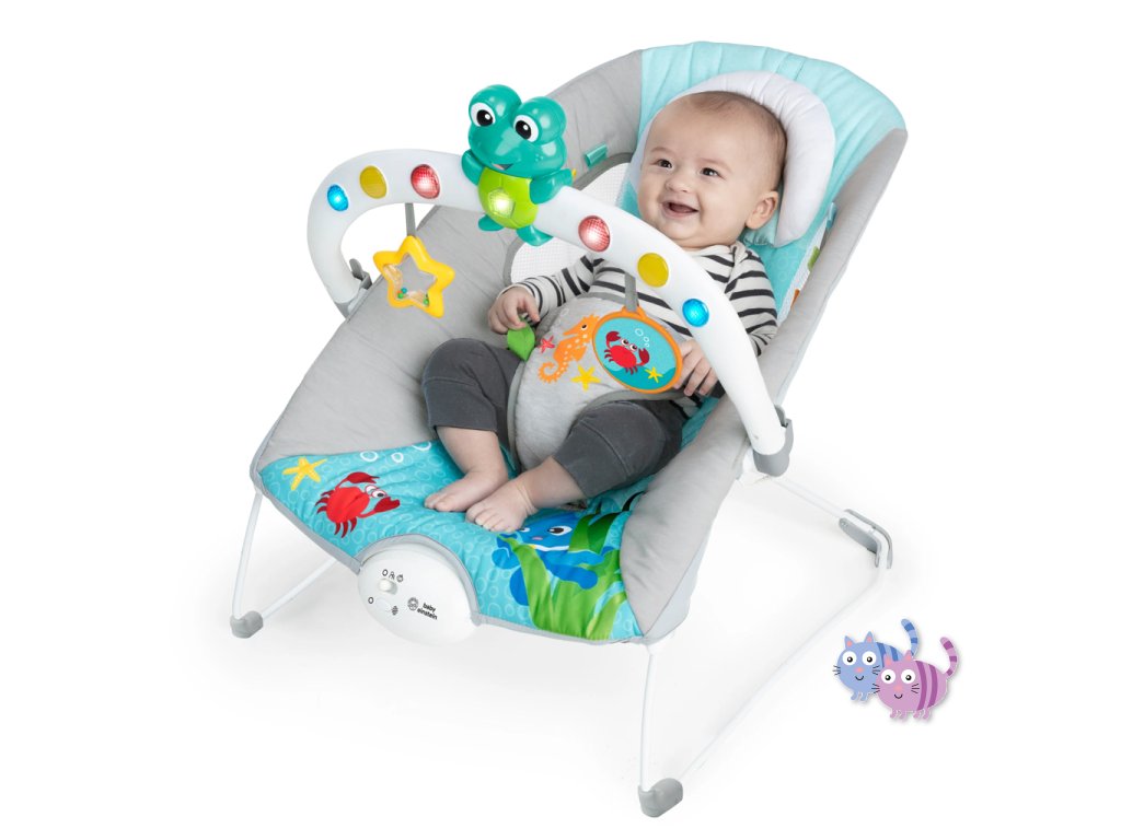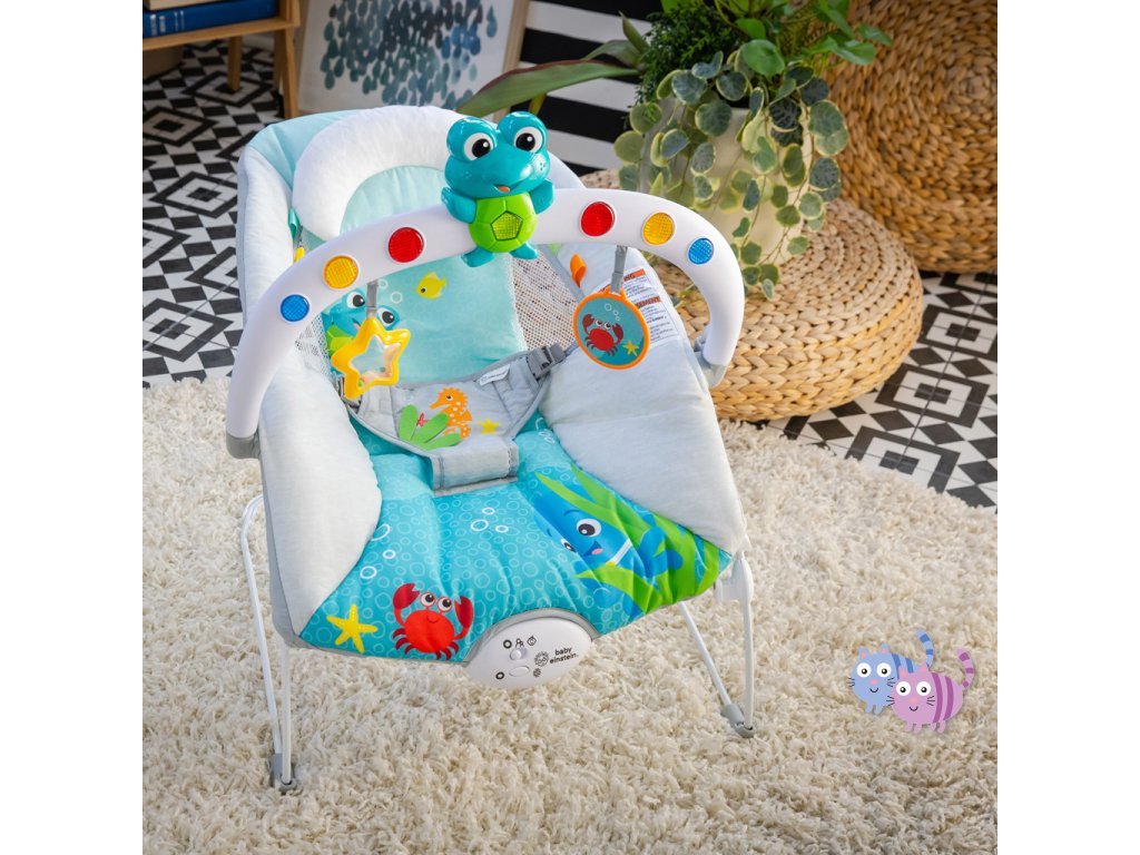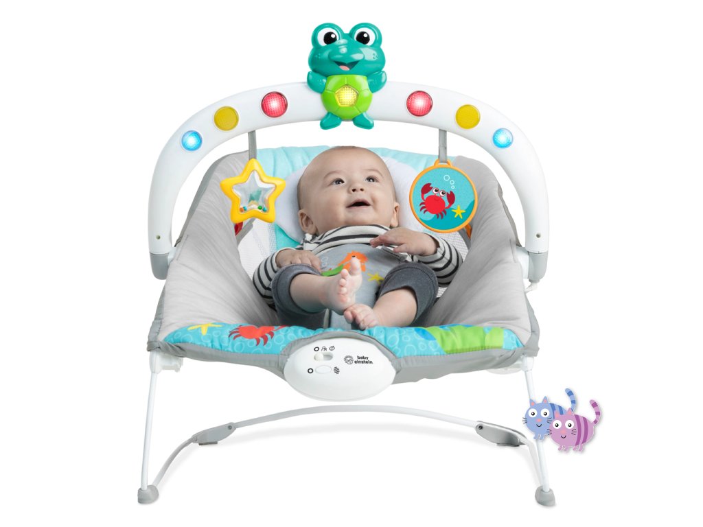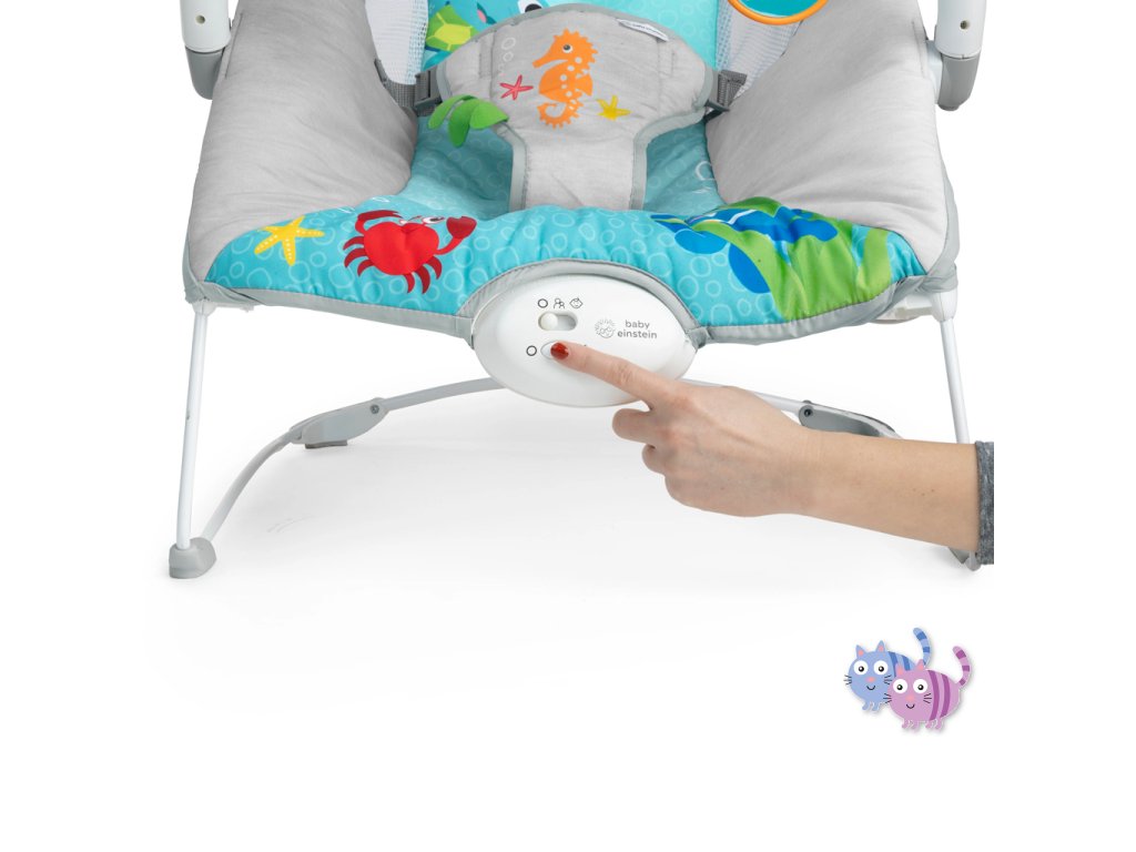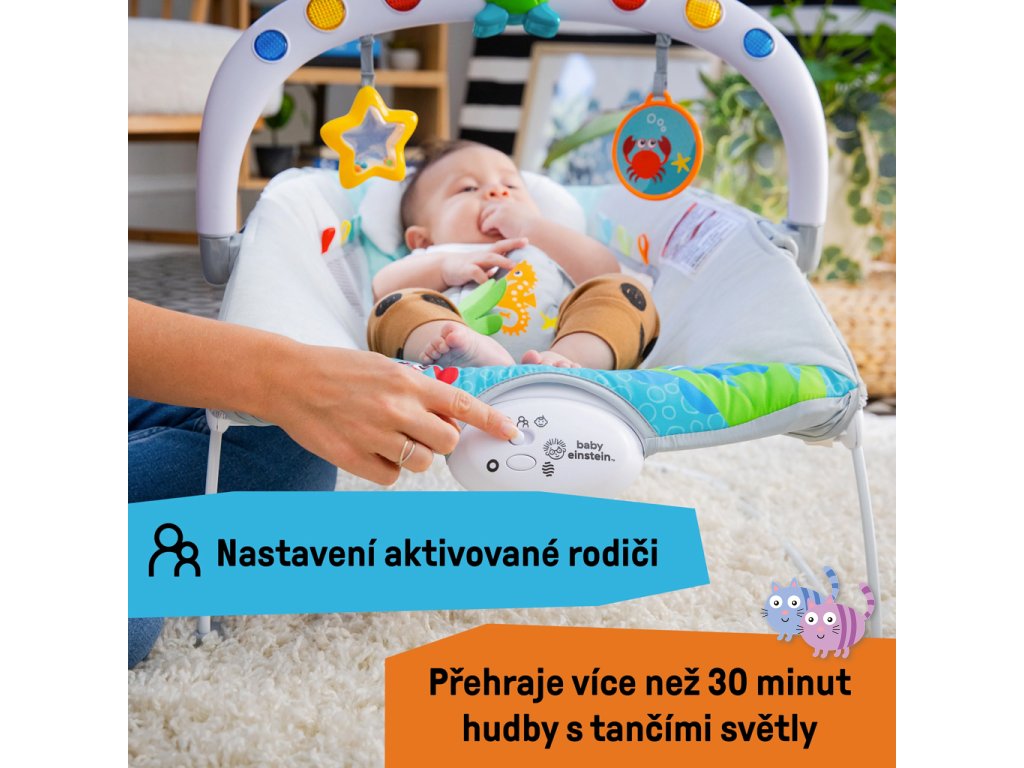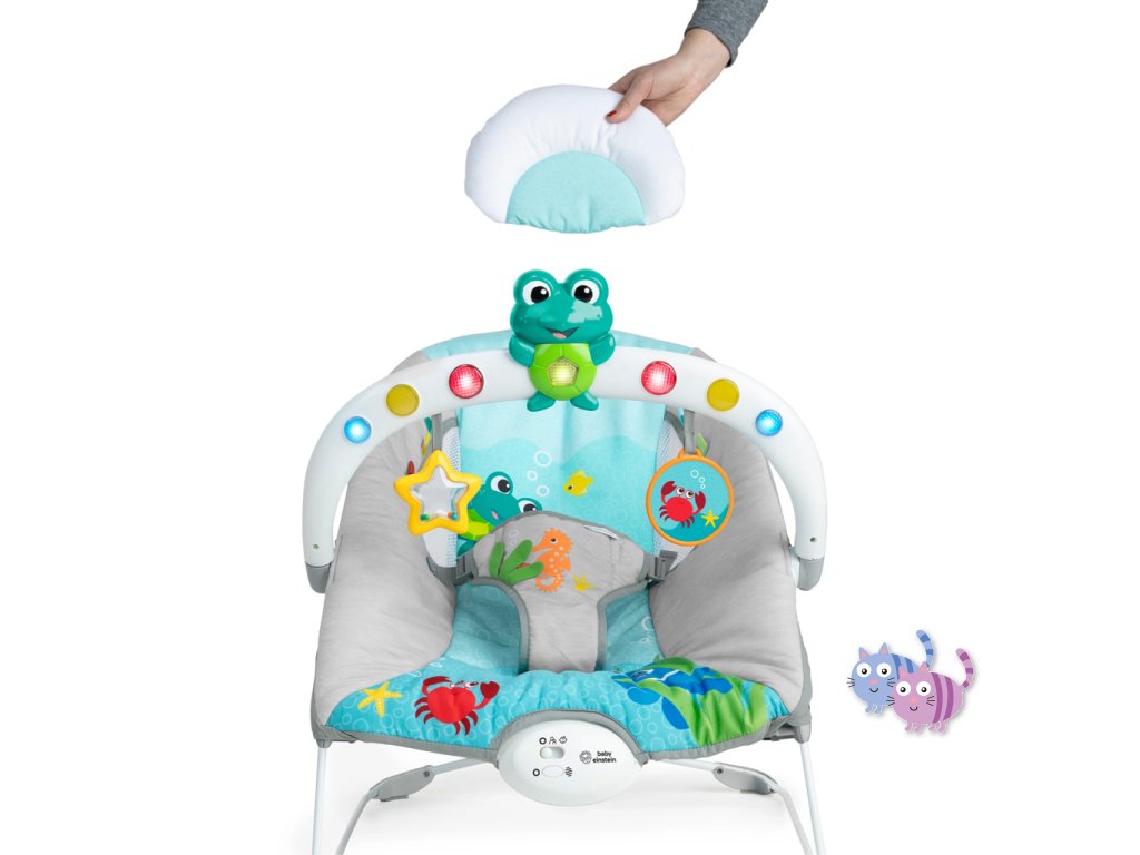 Hudební lehátko Baby Einstein Ocean Explorers Kick to It Neptune odměňuje pohyby a objevování děťátka světýlky, hudbou a zvuky oceánu. V Baby-Activated Mode, dětské kopnutí spouští světýlka a hudbu, aby se zapojily a podpořily učení příčin a následků. Rodičovský aktivovaný režim přehrává 15 klasických melodií a zvuků Baby Einstein Ocean Explorers.