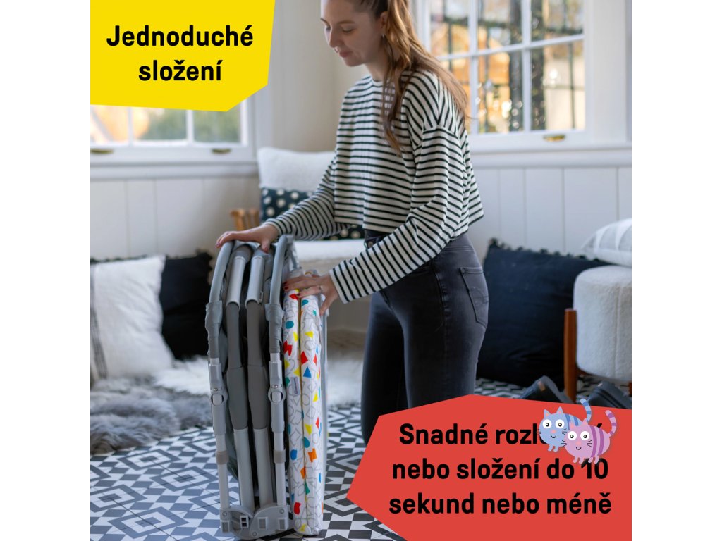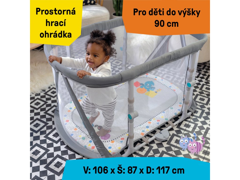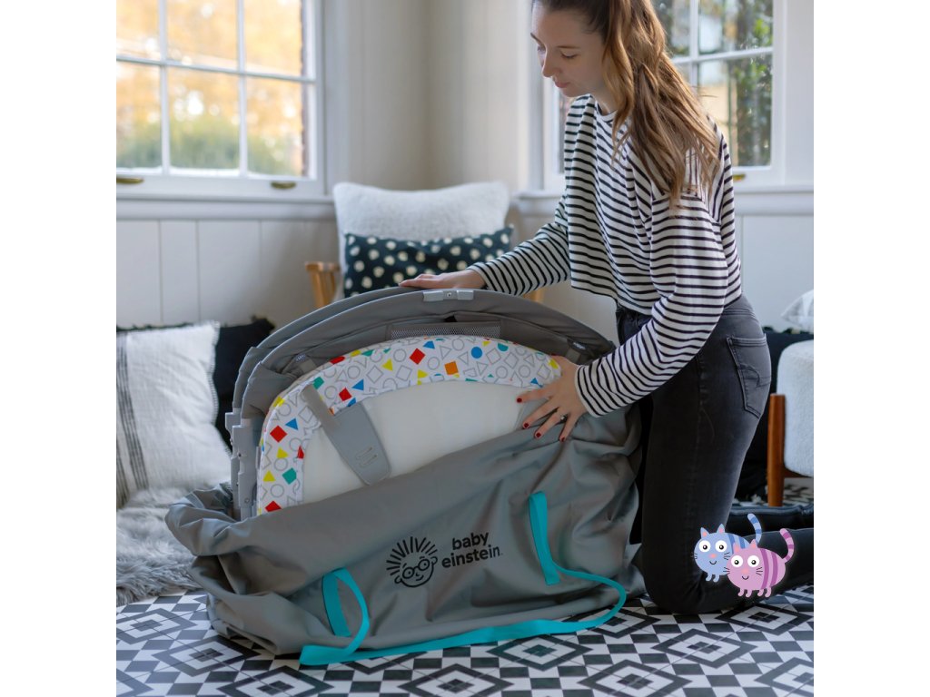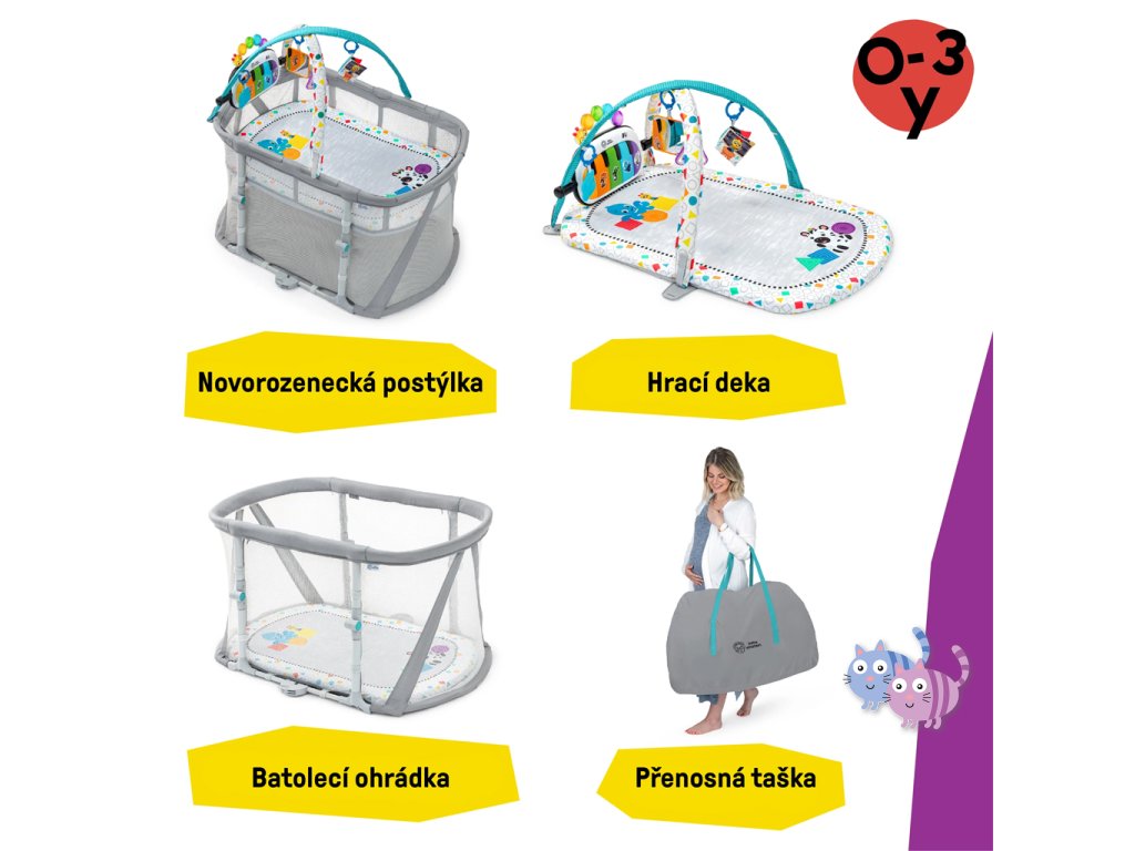V režimu Bassinet naleznete útulné místo k odpočinku. Přepínáním klavíru do režimu Melody si užijete více než 25 minut uklidňující hudby a světel, které nejen uspávají, ale také povzbuzují k natažení se po visacích hračkách. Prodyšné síťované strany umožňují vysokou viditelnost a pratelná plachta pro snadné čištění, jsou ideální pro každodenní používání. Přepněte na režim Activity Gym odstraněním matrace a hrazdičky a vychutnejte si 70+ melodií a frází ve 4 jazycích při hře na bříšku v nastavení Discovery nebo si zahrajte hudbu v režimu klavíru. Režim Playard poskytuje batolatům prostor pro hraní s oddělenými hračkami. S cestovní taškou a jednoduchým 3-krokovým skládacím designem je přenášení opravdu hračkou.