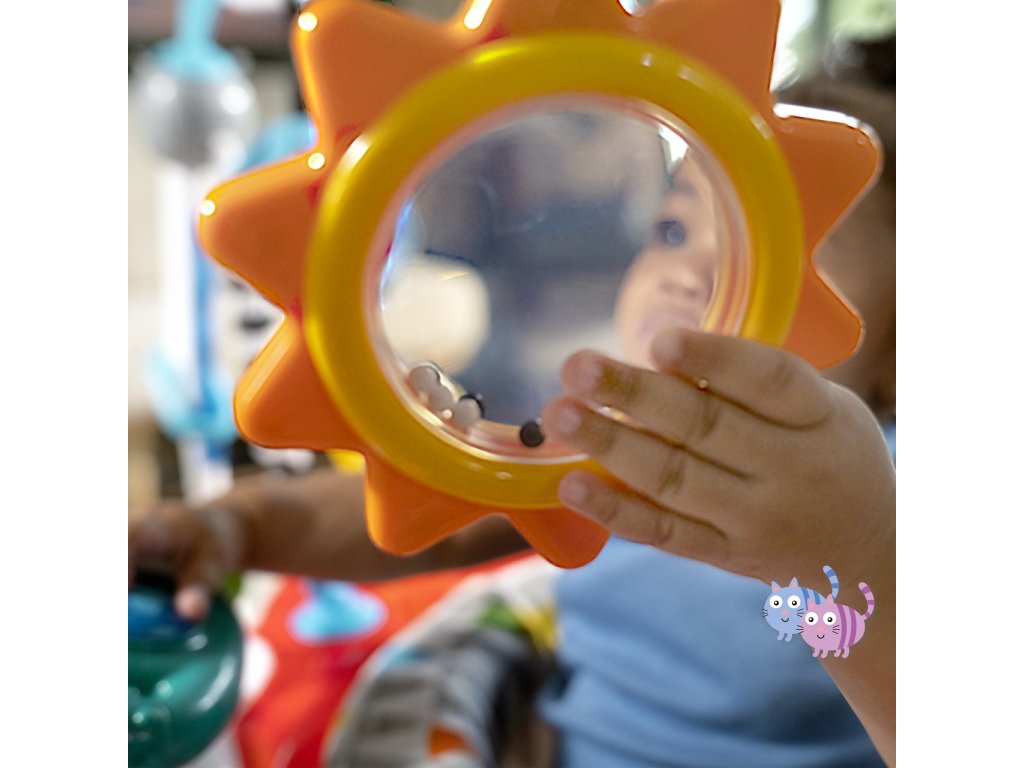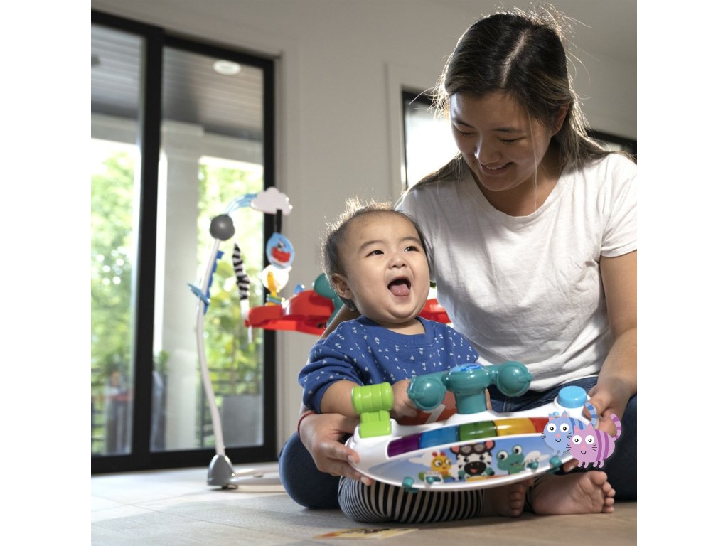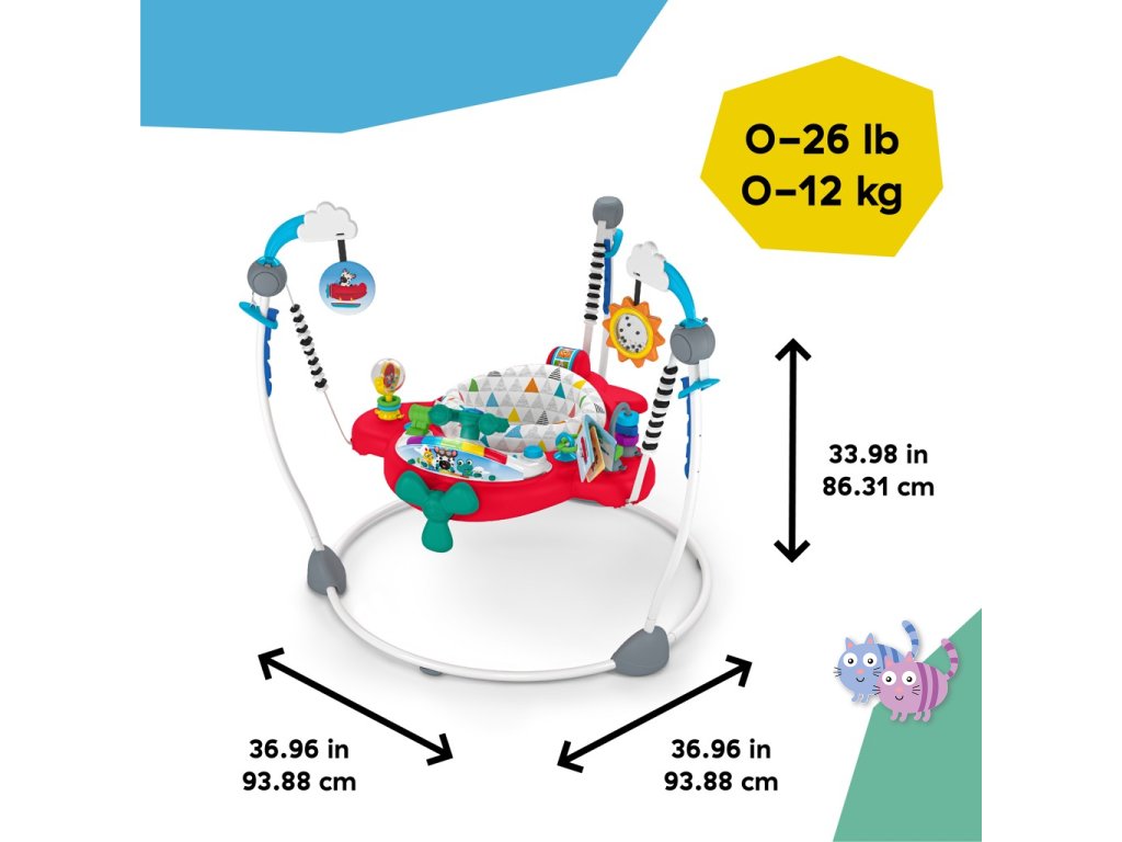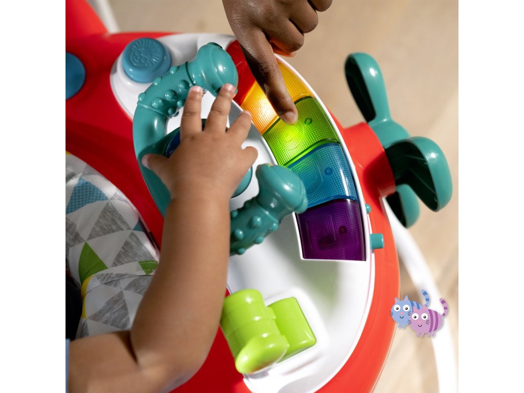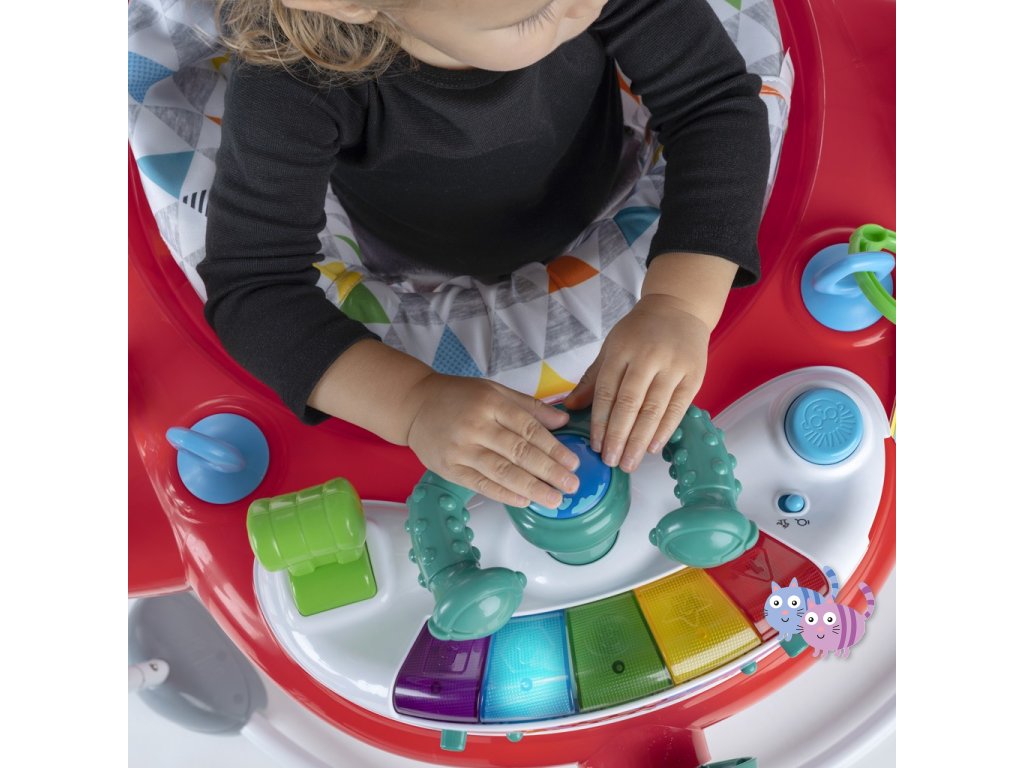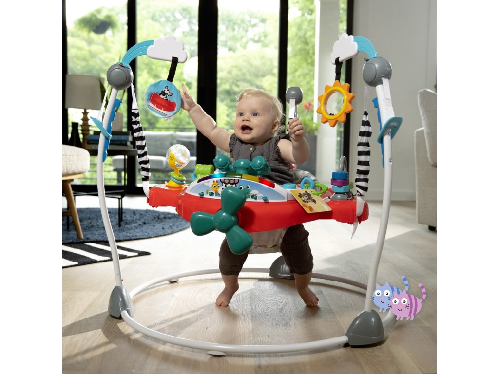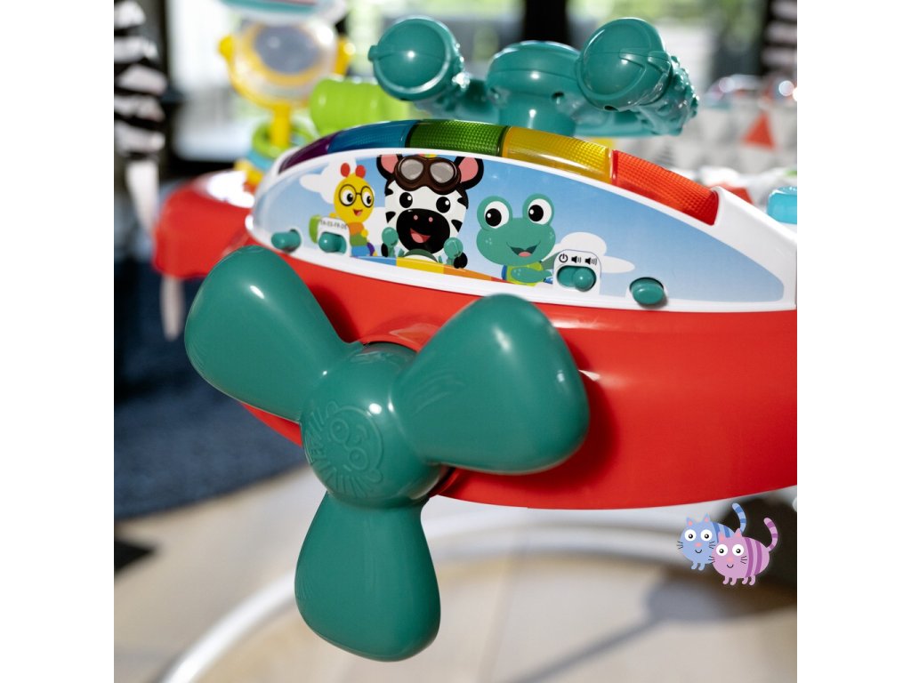 Děťátko při každém odrazu aktivuje písničky a světla, aby se dostalo do smyslově stimulujícího vzletu. Odnímatelný elektronický hrací pultík obsahuje 10 interaktivních komponent včetně 7 tlačítek, plynu a volantu, které pomáhají dítěti pilotovat. Dítě se může učit tvary, barvy a čísla ve 4 jazycích - angličtině, španělštině, francouzštině a němčině. 7 multisenzorických hraček a aktivit zapojuje vývojové dovednosti, jako jsou příčina a následek a dovednost. Oblíbené postavičky Baby Einstein Ocean Explorers, jako Cal, Zen a Neptun, slouží dítěti jako kopiloti.