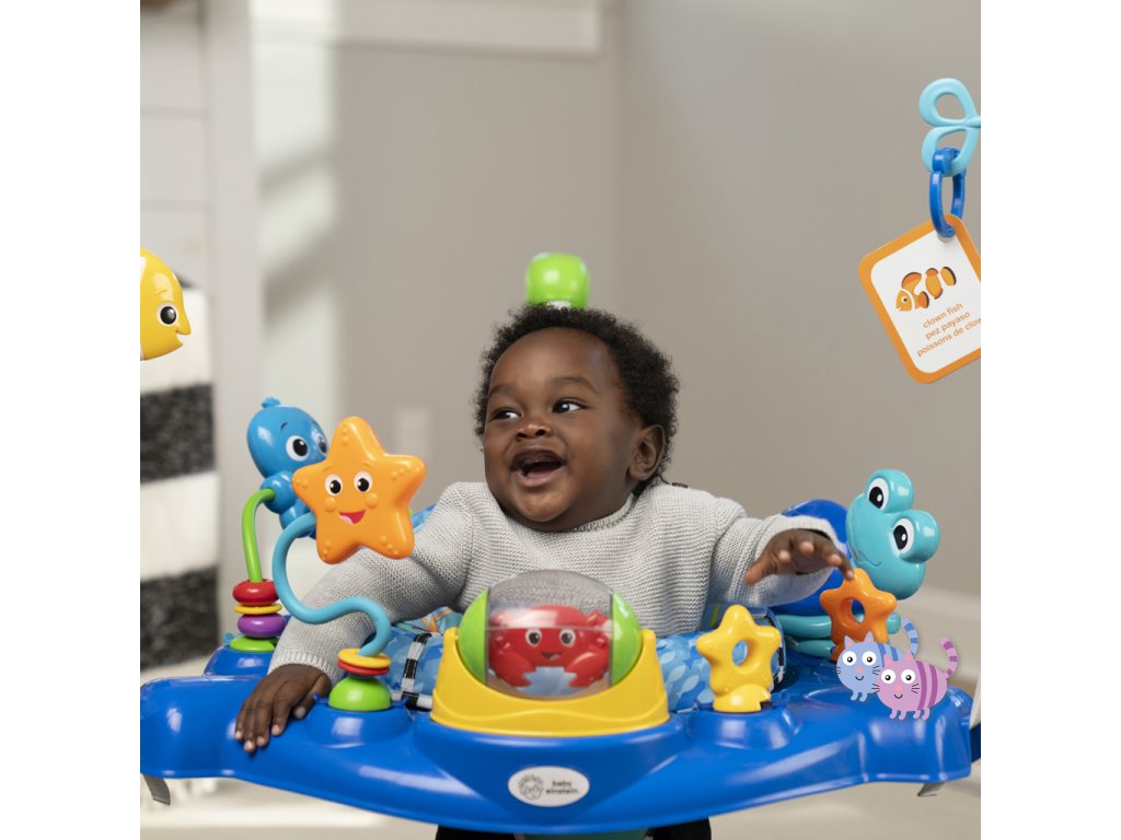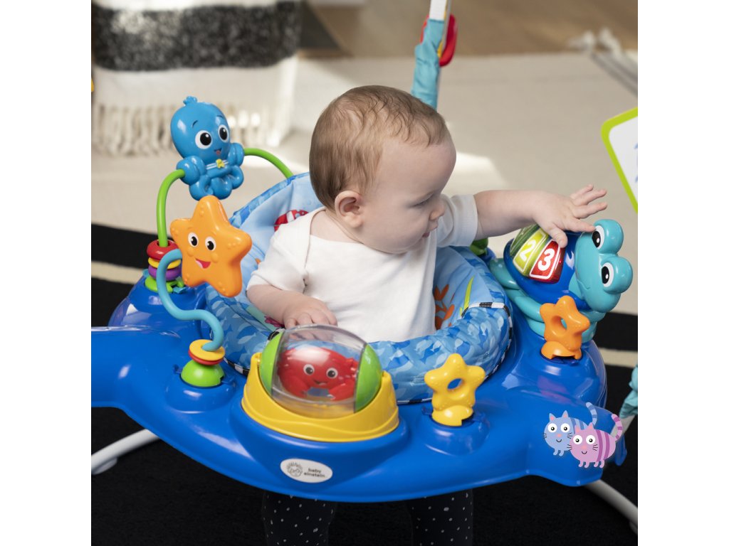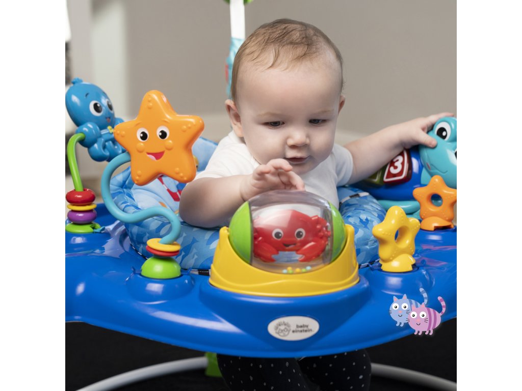 Podpořte učení s Baby Einstein skákadlem Neptune’s Ocean. Sedačka se otáčí o 360°, takže dítě může zažít pohledy a zvuky oceánu ze všech stran, zatímco skáče, objevuje mořský svět a hraje si. Více než 15 aktivit a 3 herní režimy pomáhají dítěti objevovat melodie, stimulovat smysly, rozvíjet motoriku a učit se barvy a čísla ve třech jazycích – angličtině, španělštině a francouzštině. Písně a světla zabaví dítě během skákání a odnímatelná elektronická hračka želva Neptune umožňuje dítěti objevovat svět učení i při hře na podložce nebo na cestách. Skákadlo lze snadno nastavit do 4 různých výšek podle vývoje dítěte a poskytuje bezpečný prostor pro hraní a objevování pro děti od 6 měsíců do 1 roku nebo do hmotnosti 11 kg.