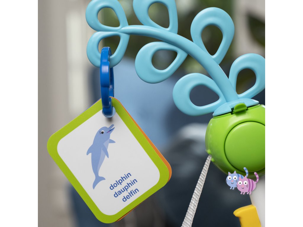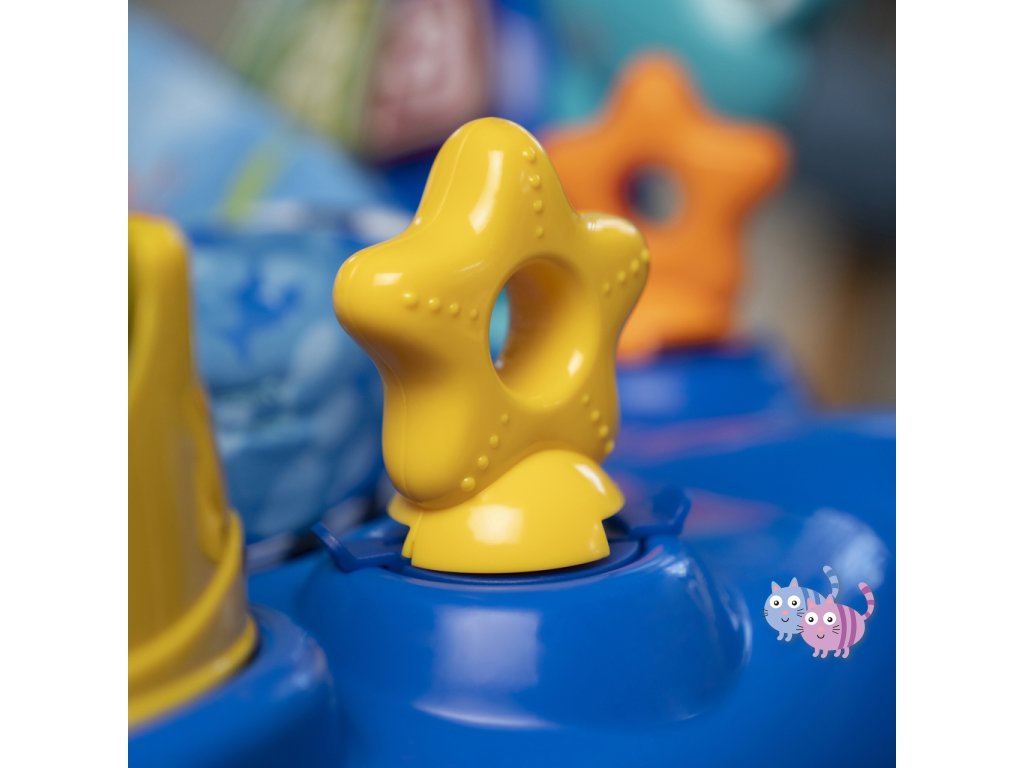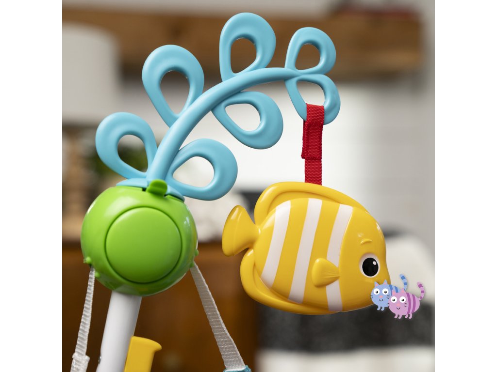 - 6 interaktivních hraček pro zapojení dítěte: elektronická hračka Neptune, hračka rybička, sada kartiček, chobotnicová hračka s korálky, krabí točící se prvek a hvězdice se zrcadlem; 3 poutka pro připevnění dalších hraček.