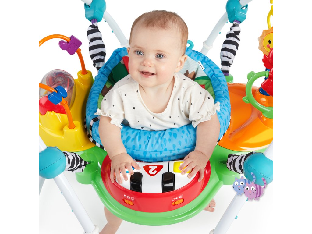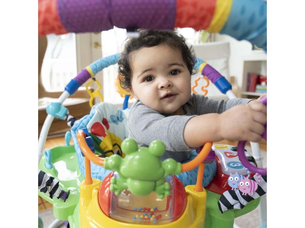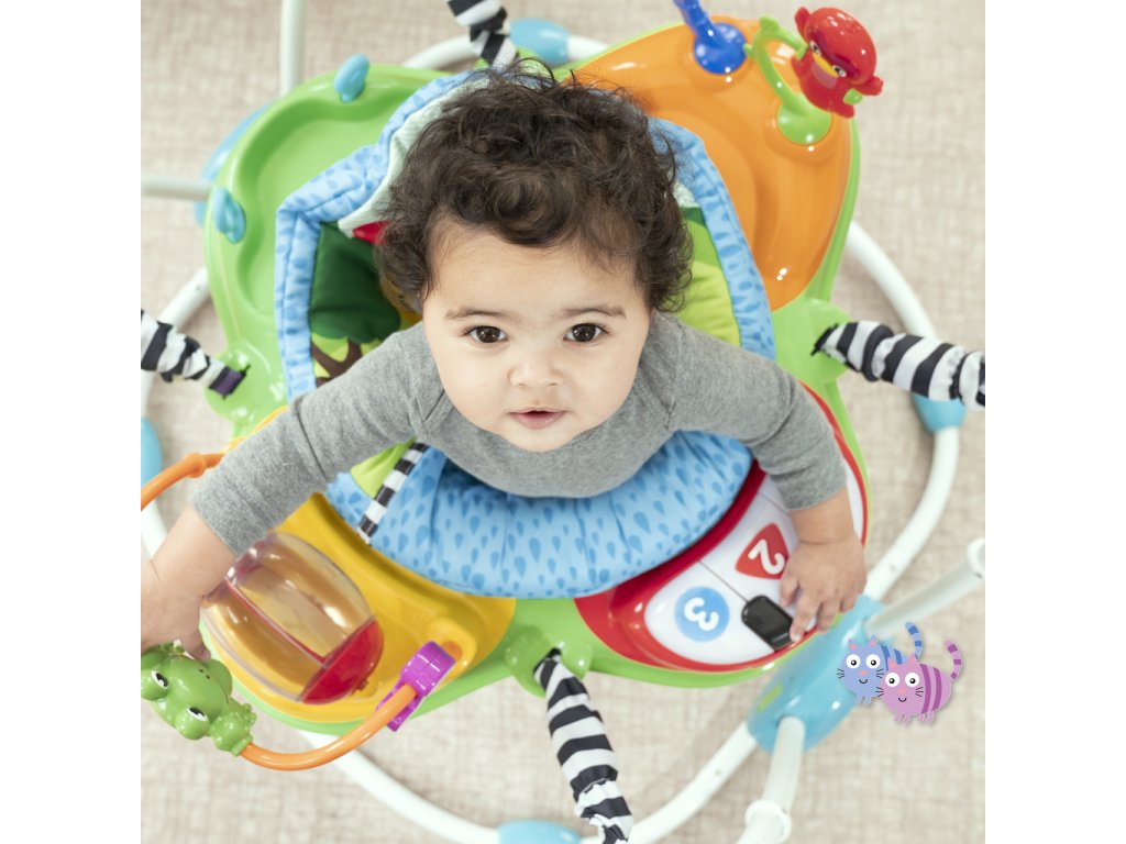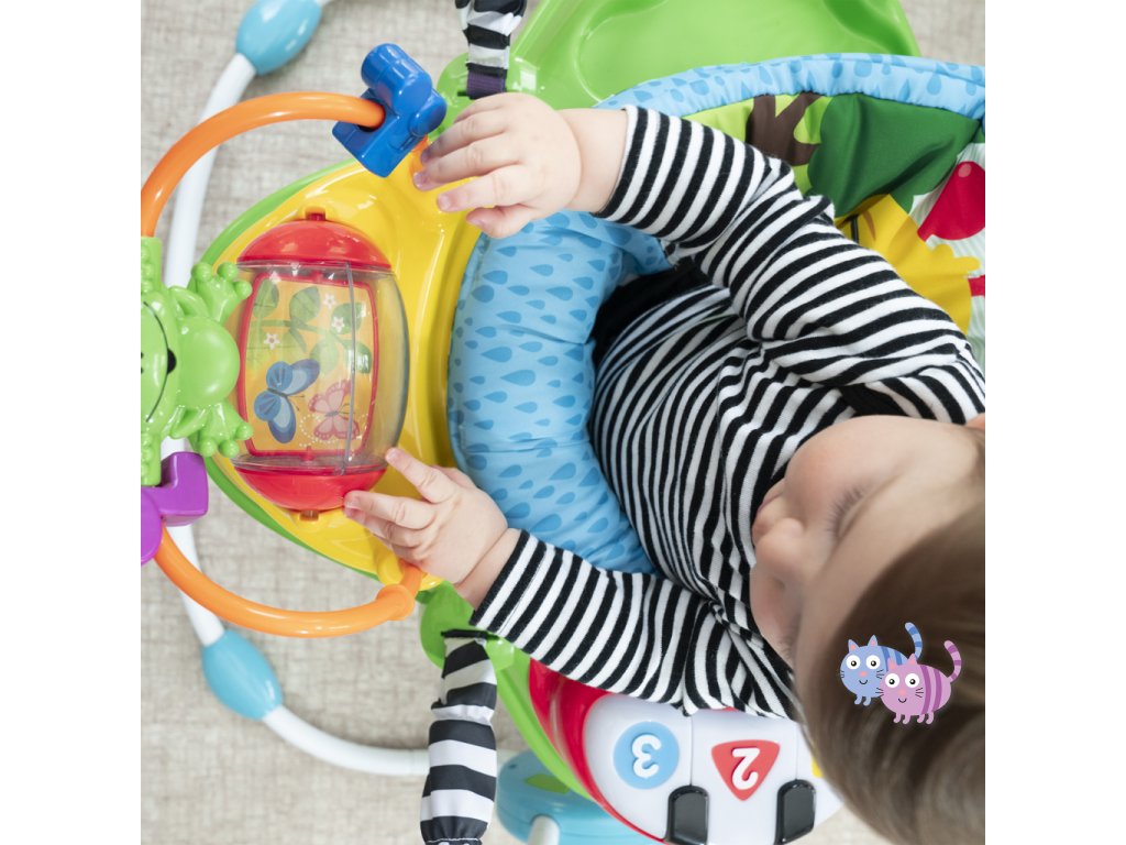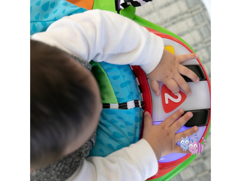 Zábava, pohyb a učení v jednom! S interaktivním skákadlem se každé hraní mění ve vzrušující dobrodružství. Toto oceňované centrum aktivit nabízí více než 12 různých podnětů pro rozvoj smyslů, motoriky a řeči – a to vše v bezpečí otočného sedadla s 360-stupňovým výhledem. Dítě může skákat, otáčet se, objevovat a tvořit – například hrát na světelné piano, chytat korálky na žabce nebo zkoumat nové zvuky. Skákadlo podporuje vývoj nohou, koordinaci oko-ruka a zvědavost. Jazykové prvky představují slova v angličtině, španělštině a francouzštině, což podporuje raný jazykový rozvoj. Dopřejte svému děťátku svět plný hudby, objevování a pohybu – vše na jednom místě.