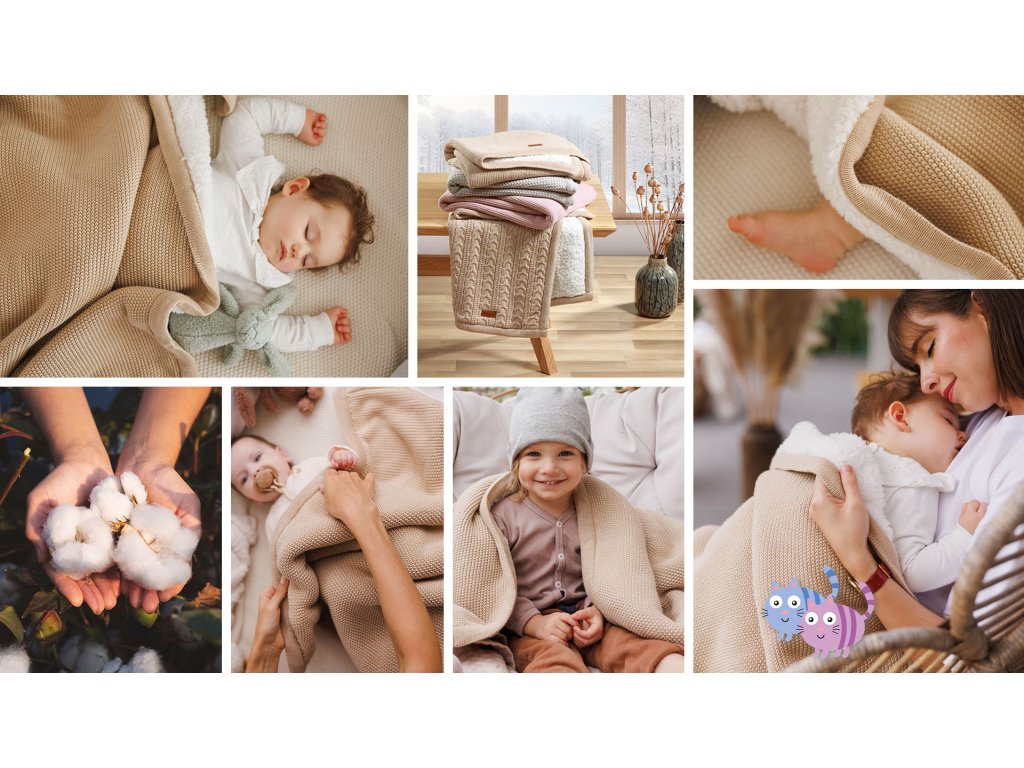 Tato dvouvrstvá deka je ideální volbou pro chladnější dny. Vrchní vrstva je vyrobena z přírodní bavlny - jemné a bezpečné pro citlivou pokožku dítěte. Spodní strana je podšita hustou sherpa látkou (flísem), která připomíná jehněčí kožešinu a výborně izoluje teplo. Deka nedráždí pokožku, vytváří pocit bezpečí a pohodlí, takže vaše dítě se bude cítit jako v měkkém, teplém obláčku. Ideální pro novorozence, kojence i starší děti – doma, na procházkách či na cestách.