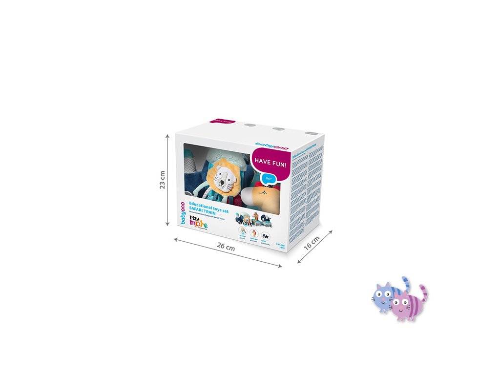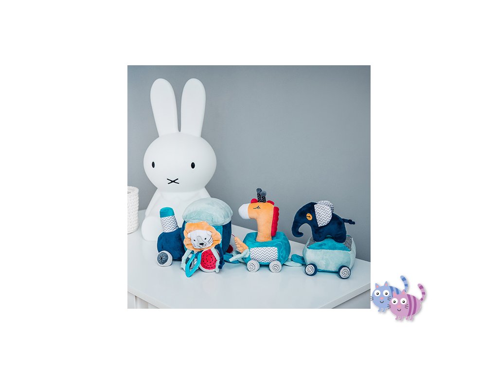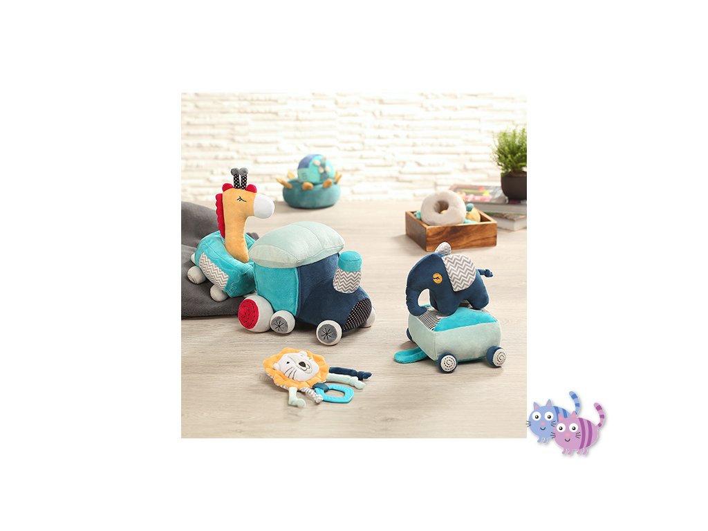 - Prvky soupravy: vláček se dvěma vagóny, šustící kousátko ve tvaru lva, pískací hračka ve tvaru žirafy, chrastítko ve tvaru slona