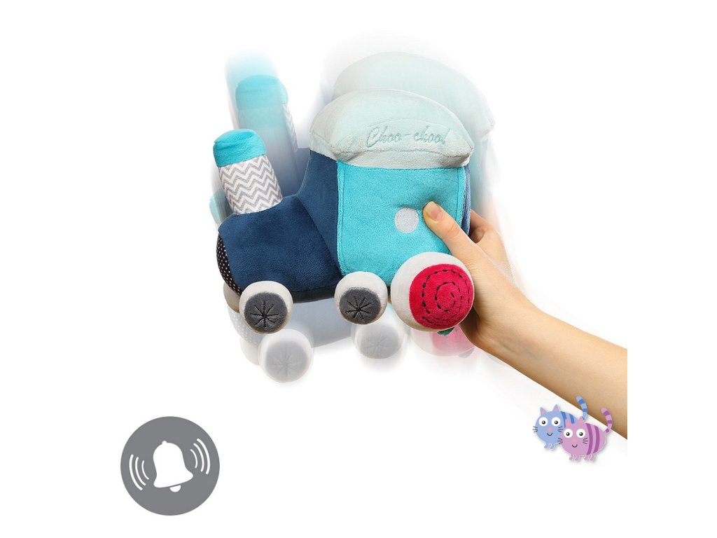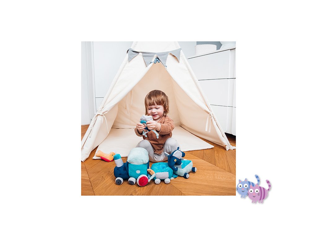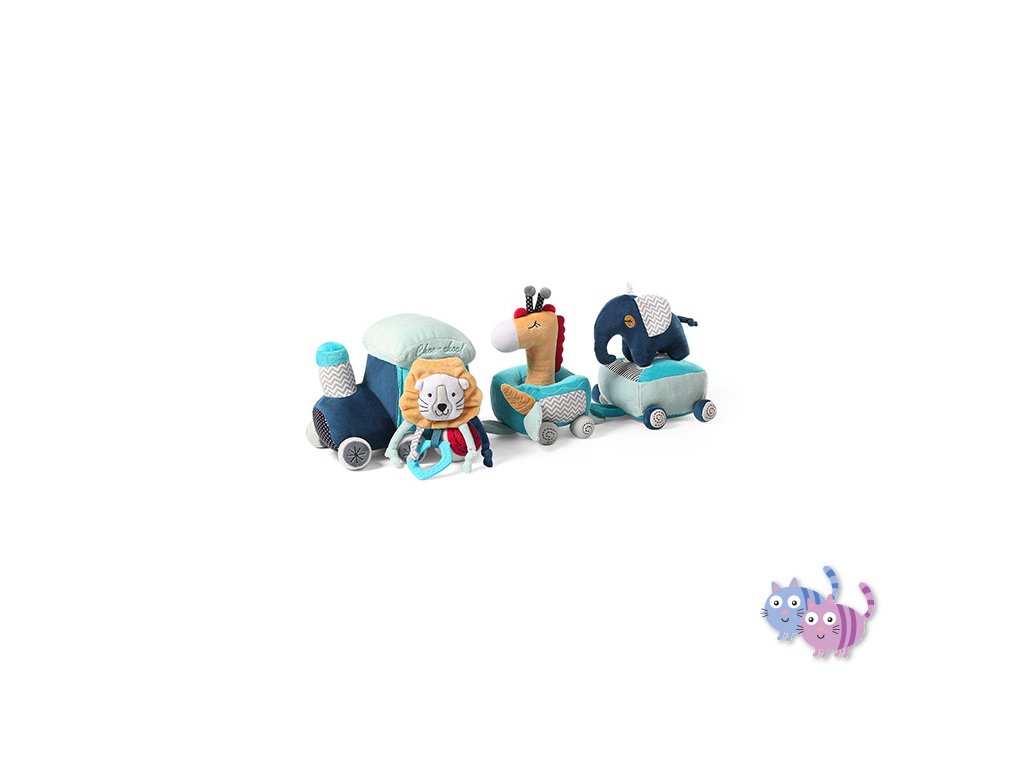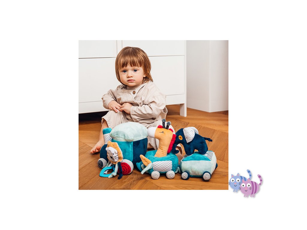 Vláčková sada vzdělávacích hraček Safari train se skládá z lokomotivy se dvěma vagóny a připojenými plyšovými hračkami: pískajícími, chrastícími a šustícími. Hračka seznamuje dítě s rozmanitým světem barev, zvuků a tvarů. Díky přichycení na suchý zip a důmyslně navrženým prostorům pro hračky lze vytvářet zajímavé kombinace, které podněcují kreativní myšlení.
