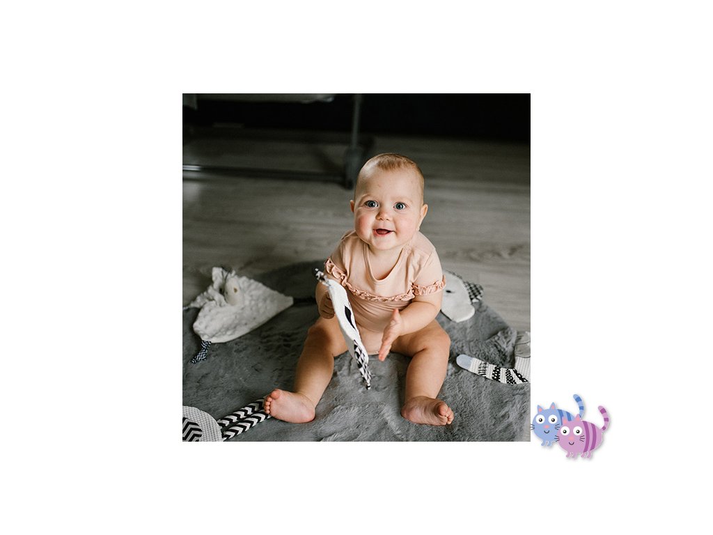 Tento plochý plyšák obsahuje prvky v kontrastních barvách. Během prvních 3 měsíců svého života vidí novorozenec černobíle. Takové barvy hračky přitahují zrak dítěte. Pomáhají soustředit se a upoutat pozornost.
