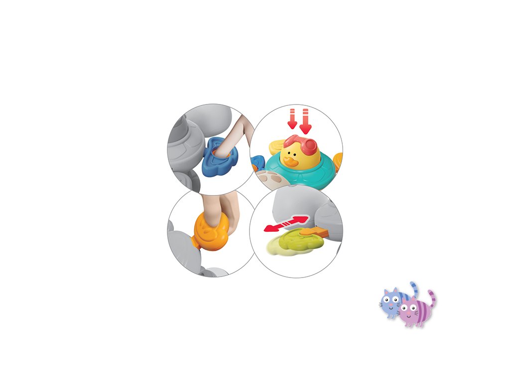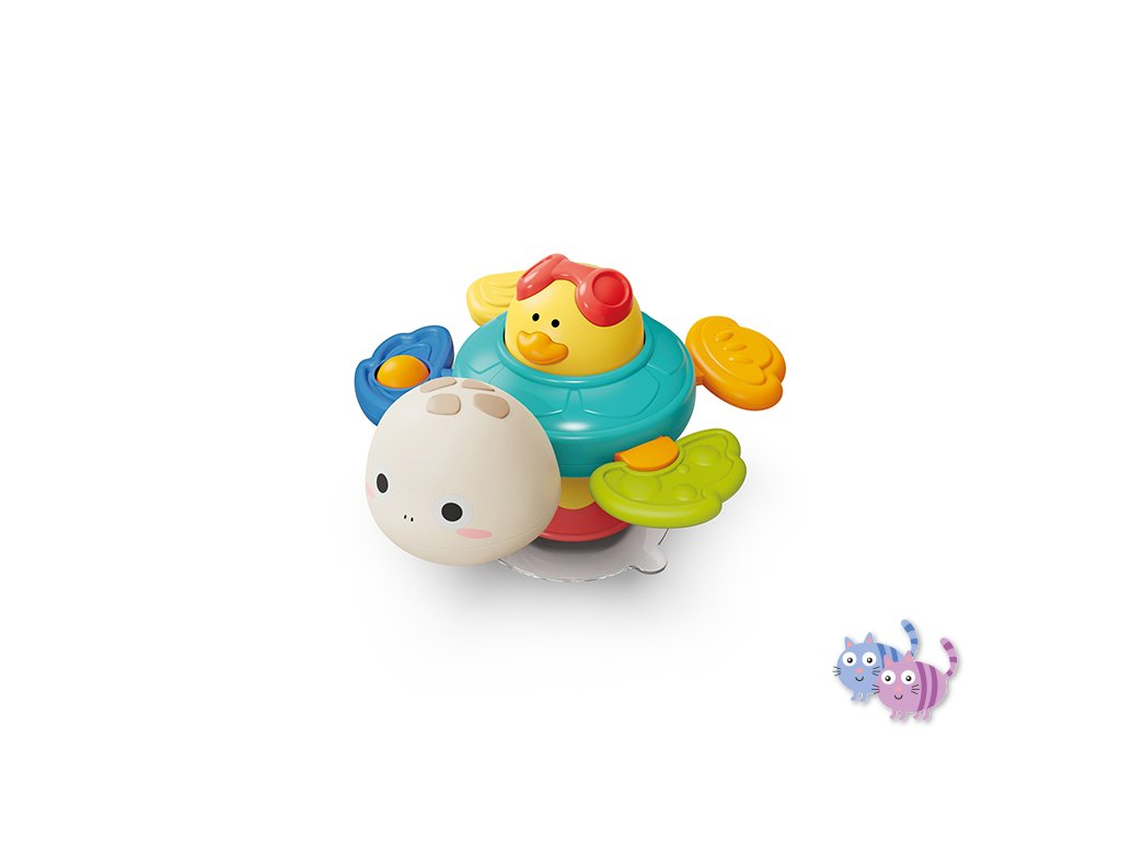 - Želva se skládá z různých prvků jako otáčející se tělo, interaktivní tlačítko, chrastítko a kousátko. Barevné a pohyblivé části rozvíjejí smysly dítěte a podněcují kreativitu při objevování.