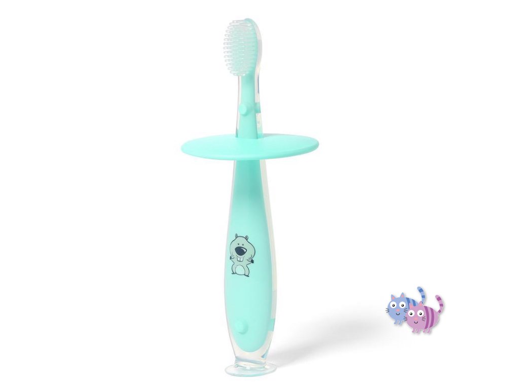 Jemný silikonový zubní kartáček se zarážkou, která zabraňuje tomu, aby si dítě vložilo kartáček příliš hluboko do úst.