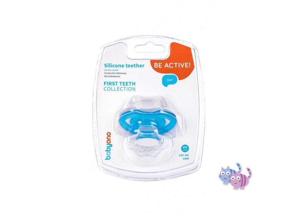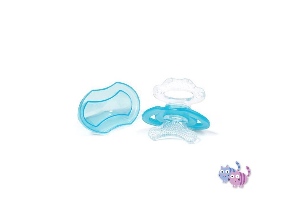 BABYONO Kousátko silikonové bez BPA ve tvaru dudlíku s krytem modrá 3m+