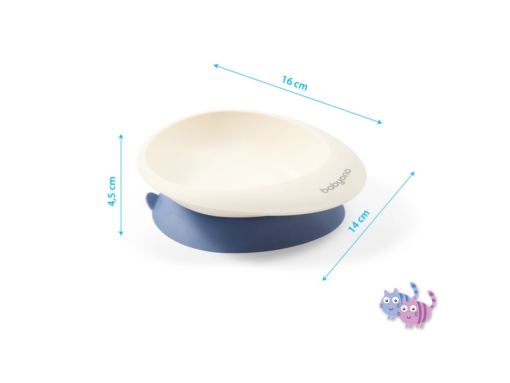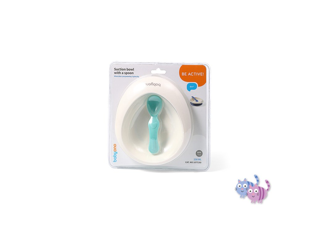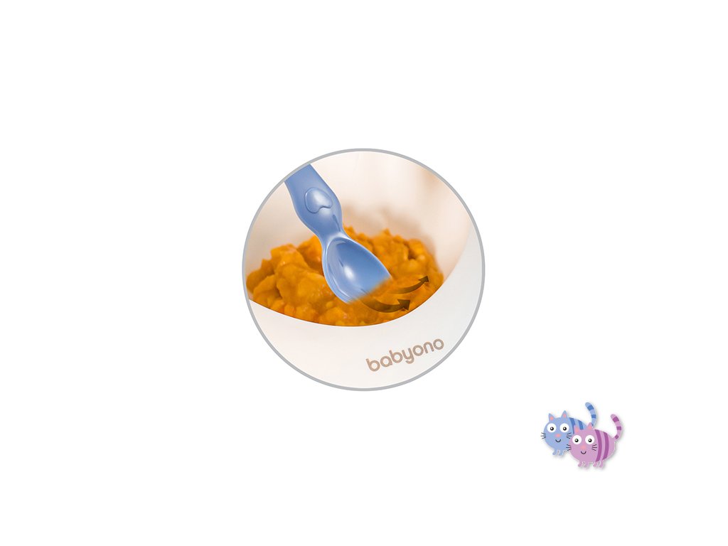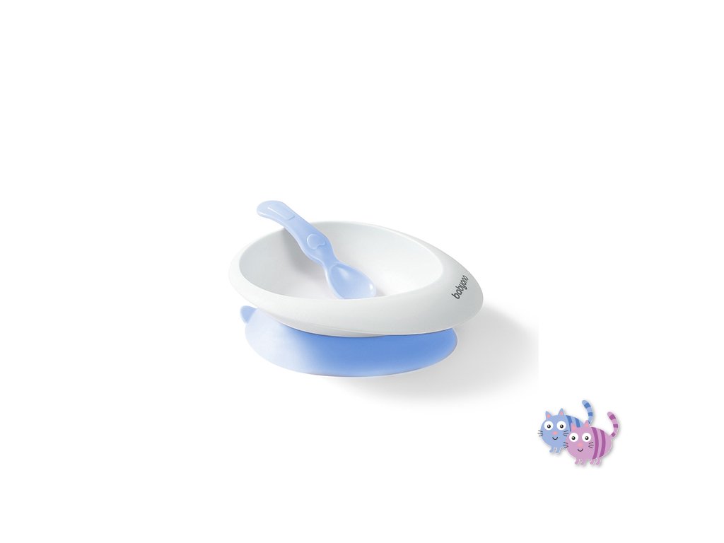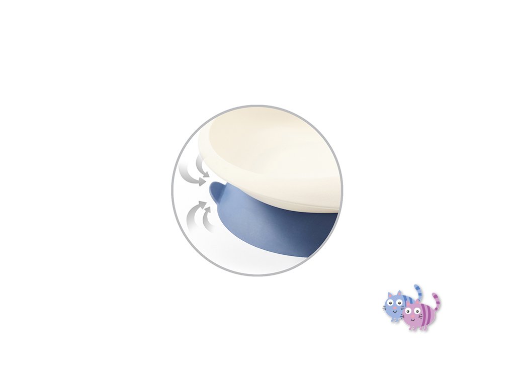 Dvoudílný set k jídlu z měkkého plastu bez BPA je velmi praktický, snadno uchopitelný a protiskluzový. Set obsahuje misku s přísavkou a lžičku. Oválný tvar misky usnadňuje nabírání jídla, zatímco přísavka na misce zabraňuje jejímu pohybu po stole a tím rozlití jídla a pomáhá udržovat věci čisté.