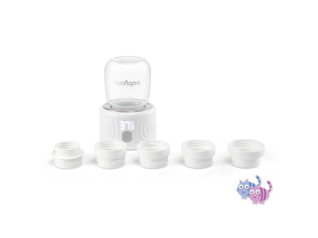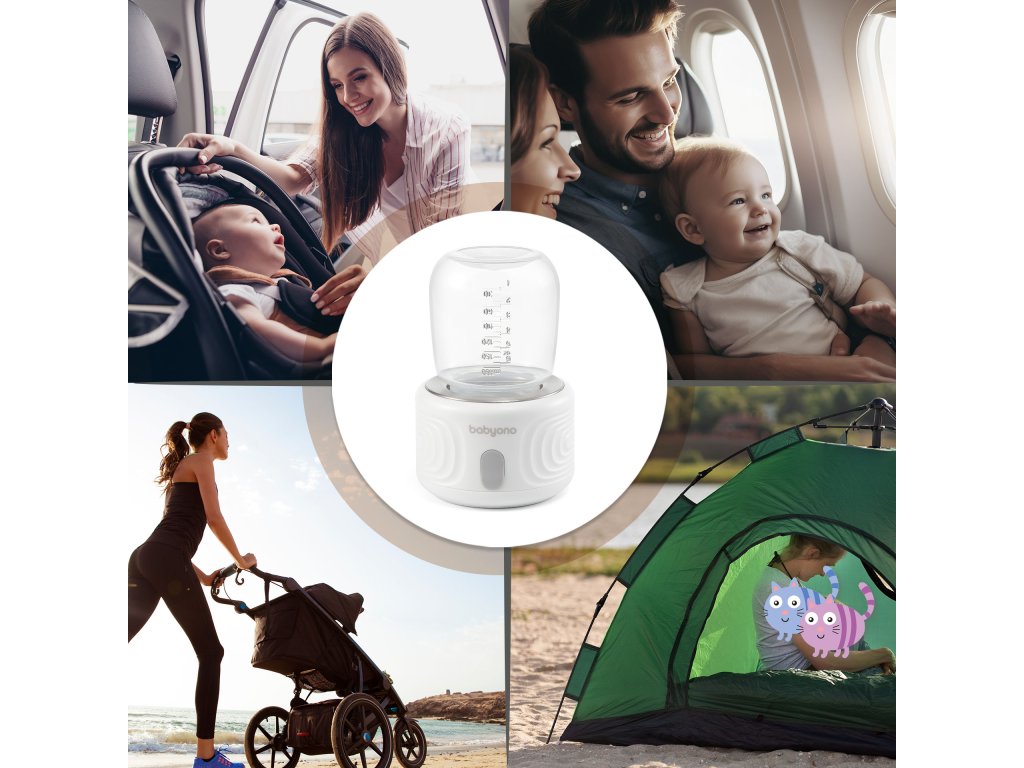 Díky své kompaktnosti jej můžete snadno vložit do kabelky a vzít s sebou na výlet. Ideální na cestu autem, letadlem nebo procházky. S integrovanou baterií může zařízení fungovat až 8 hodin. Ohřívač má 5 vyměnitelných adaptérů, což zaručuje jeho kompatibilitu s většinou kojeneckých lahví dostupných na trhu.