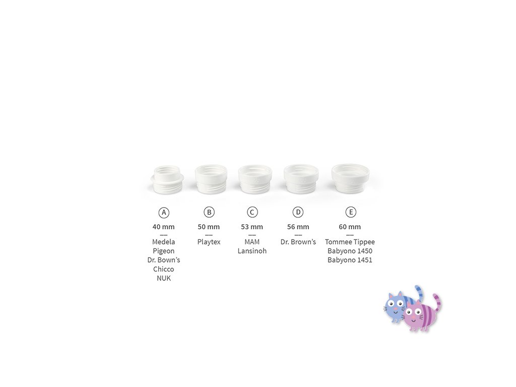 Extra adaptéry - díky pěti adaptérům v sadě je ohřívač vhodný pro většinu lahví dostupných na trhu. 40mm adaptér - láhve zn. Medela, Chicco, Nuk, Dr.Browns, Pigeon. 50mm adaptér - láhve zn. Playtex. 53mm adaptér - láhve zn. Mám, Lansinoh. 56mm adaptér - láhve zn. Dr.Browns. 60mm adaptér - láhve zn. Tommee Tippee, Babyono 1450-BO a 1451-BO.