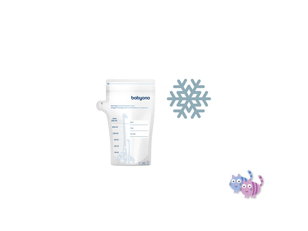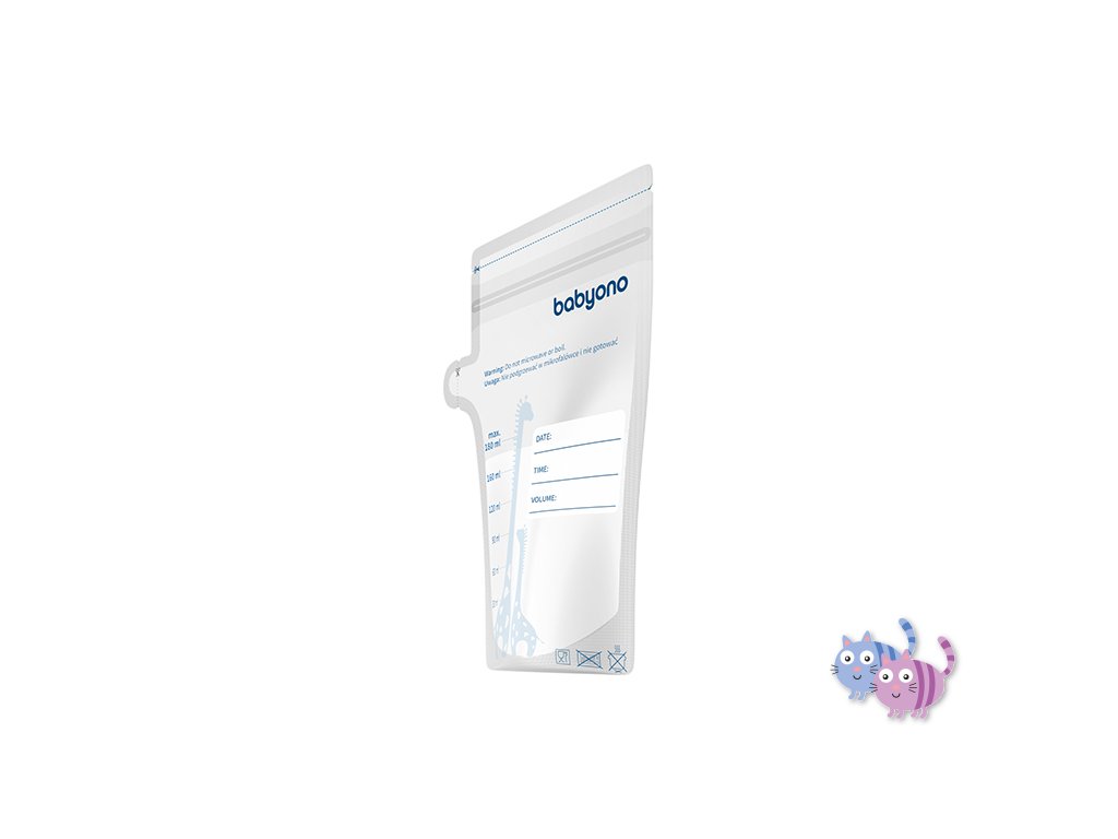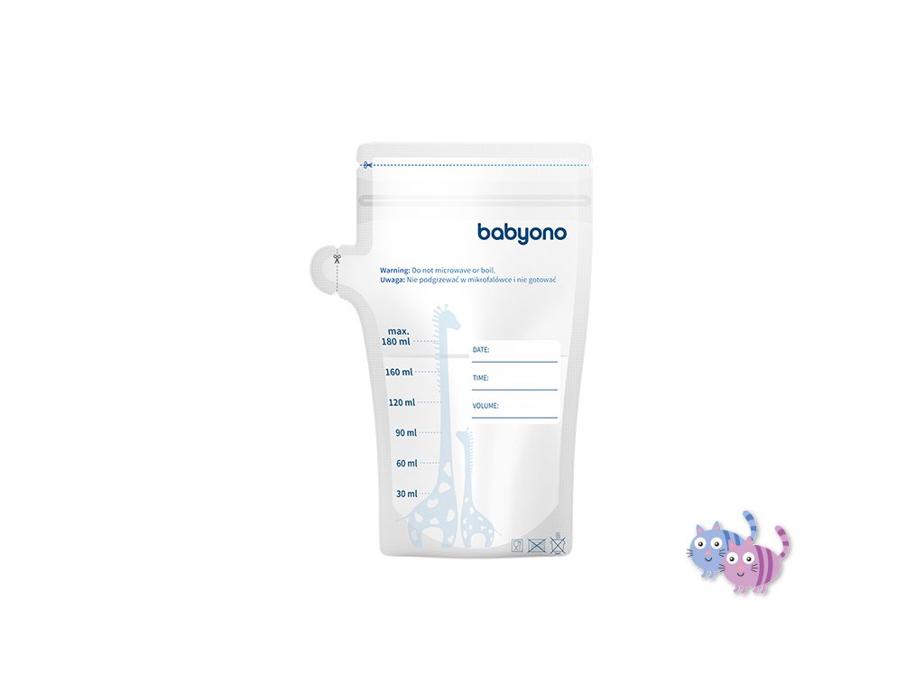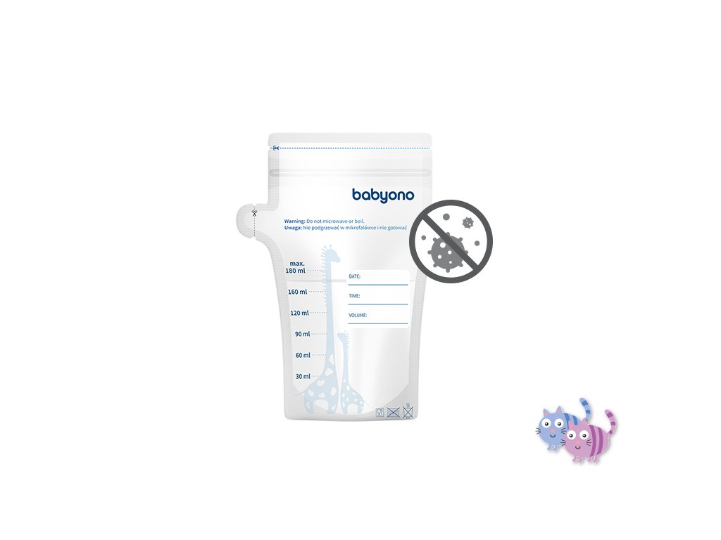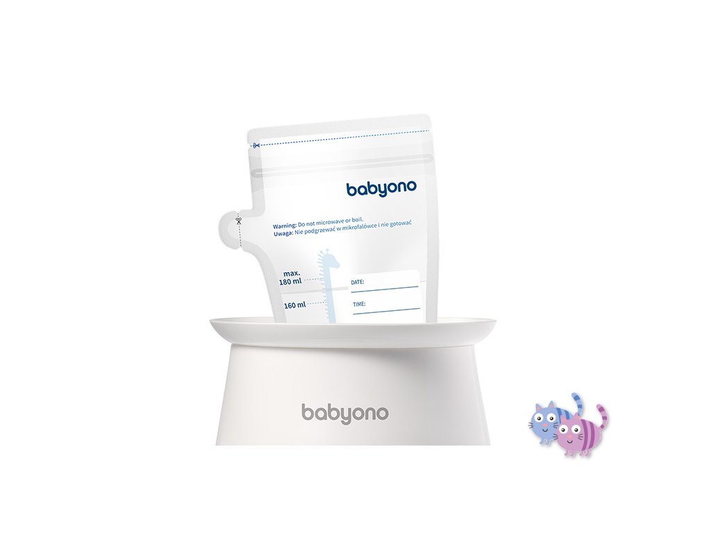 Jednorázové sáčky Babyono jsou určeny pro skladování a zmrazení mateřského mléka. Jsou bezpečné a hygienické. Zabraňují zápachu. Stabilní spodní část sáčku a pevný zip chrání mléko před rozlitím, zatímco přiměřeně tvarovaná nálevka zjednodušuje nalít mléko do láhve.