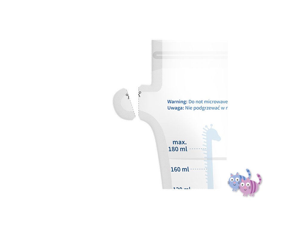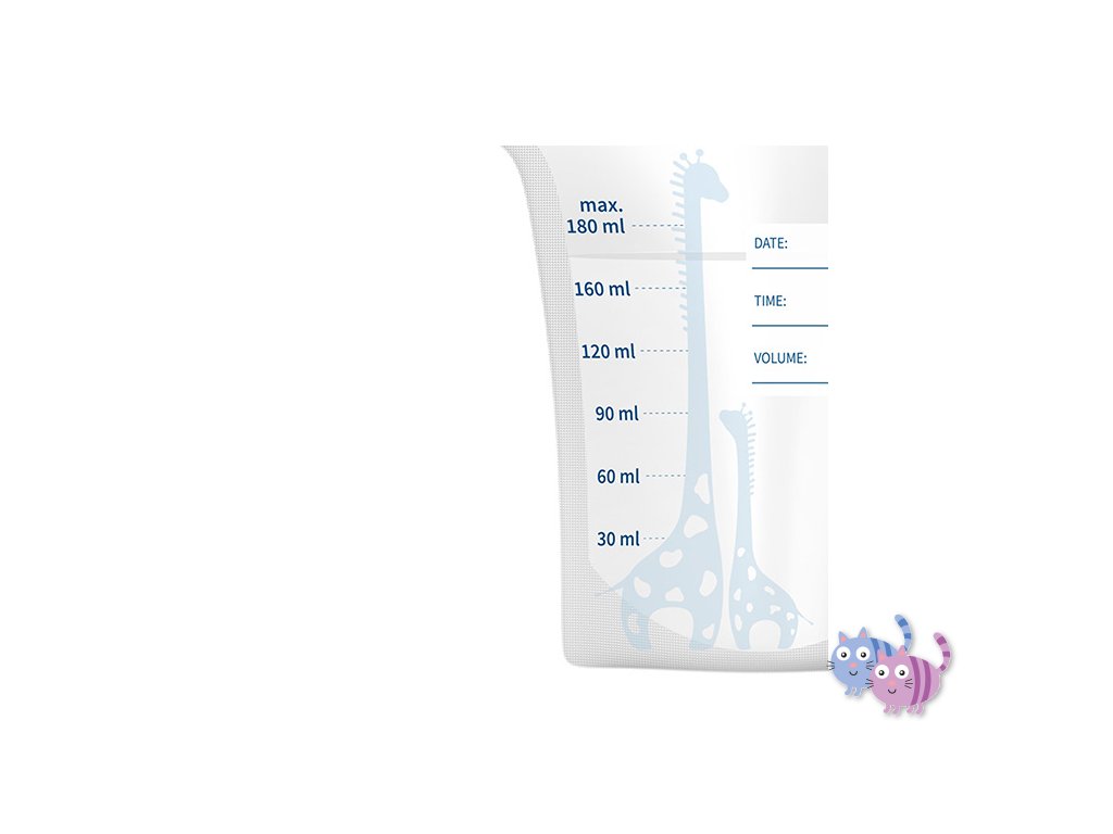 Sáček uskladní najednou velké množství mléka - až 180 ml. Přesné měřítko slouží k odměření vhodné dávky mateřského mléka.