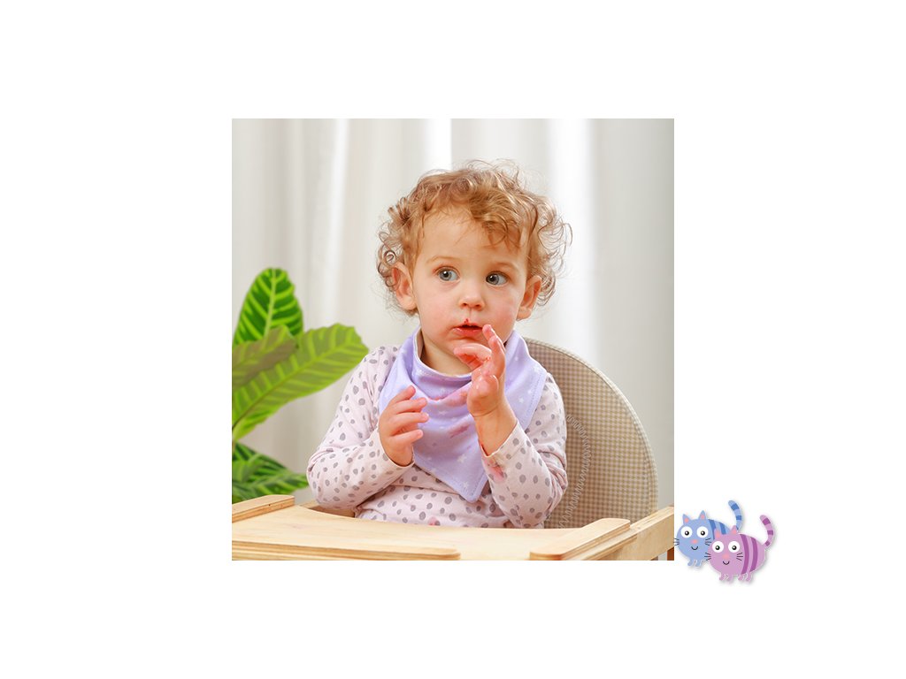 Slintáček je vyroben z dvouvrstvé 100% bavlny, takže jemně obepíná krk děťátka. Šátek je oboustranný. Snadno ji přizpůsobíte stylu oblečení Vašeho miminka.