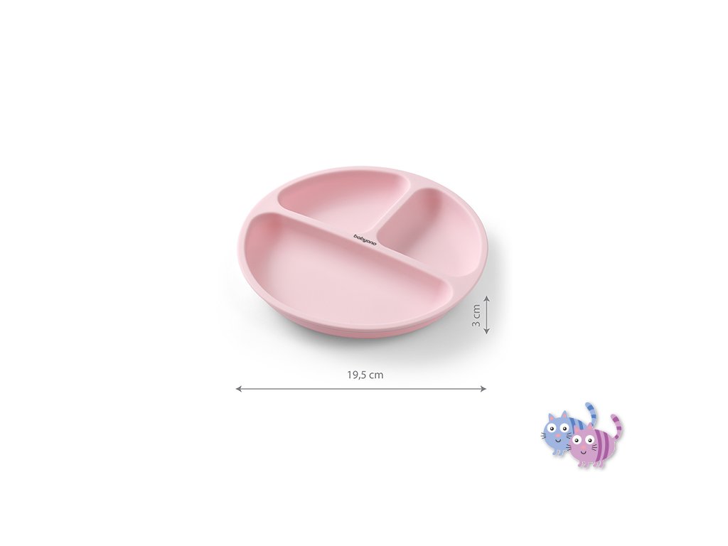 Díky přísavce na spodní části je nízké riziko rozlití nebo pádu talíře. Ergonomický tvar talíře usnadňuje dětem přijímání jídla a první kroky při stolování. Tři praktické přihrádky povzbuzují dítě, aby vyzkoušelo nové potraviny a chutě. Talíř je vyroben z vysoce kvalitního silikonu, je zdravotně nezávadný a snadno se čistí. Dá se mýt v myčce na nádobí a předehřívat v mikrovlnné troubě.
