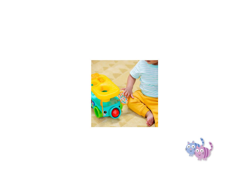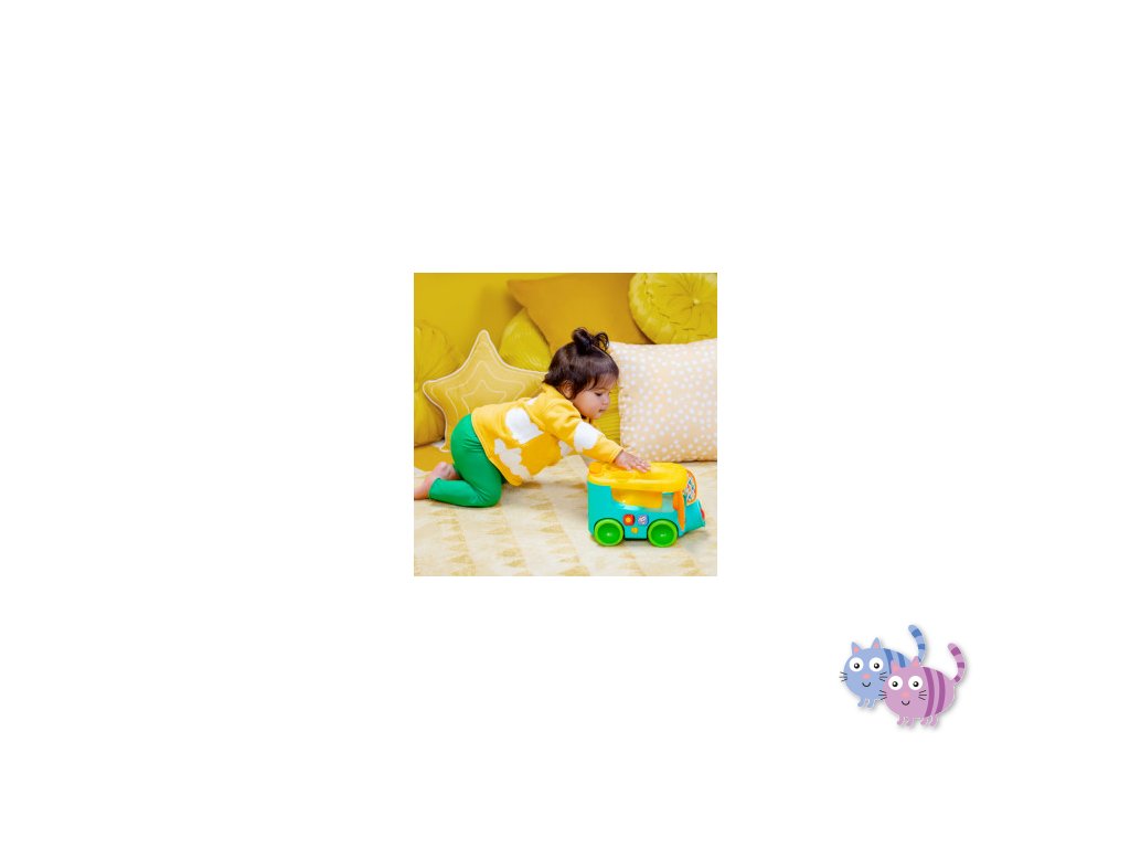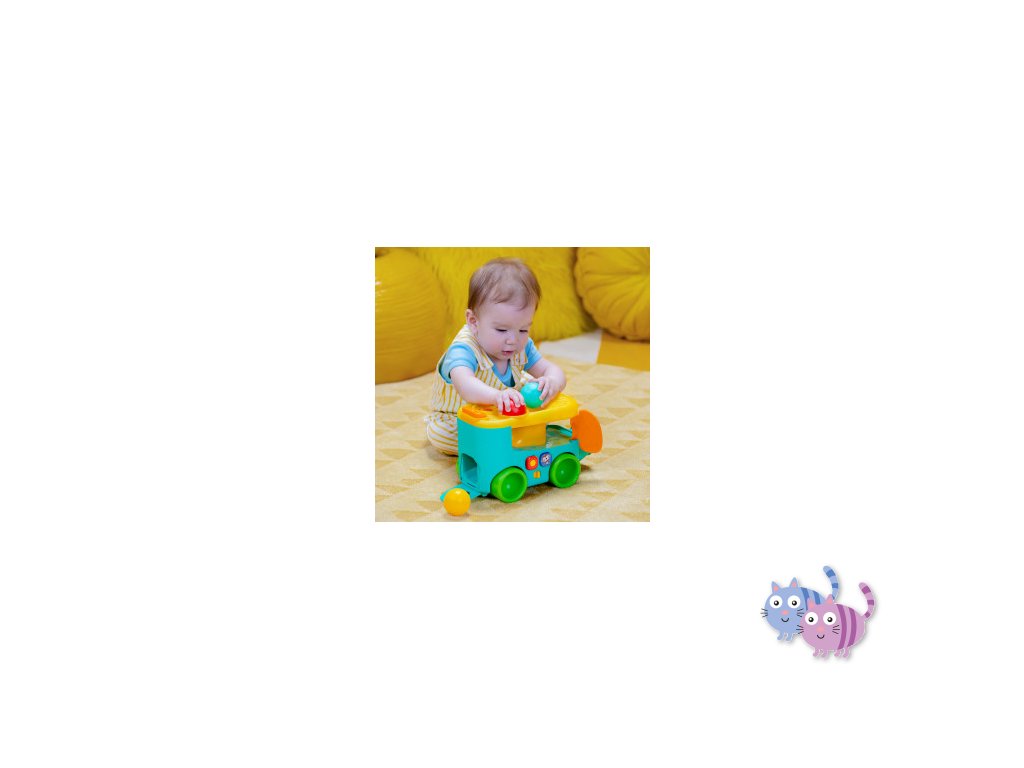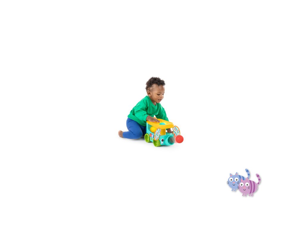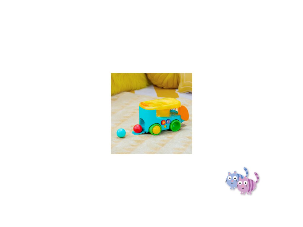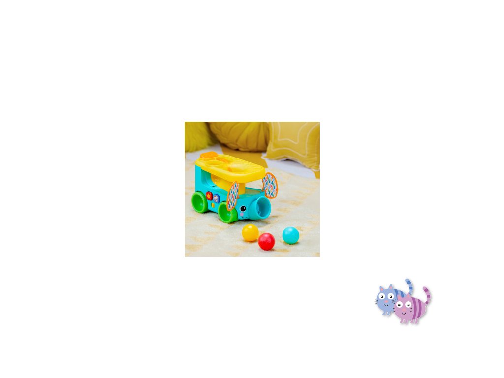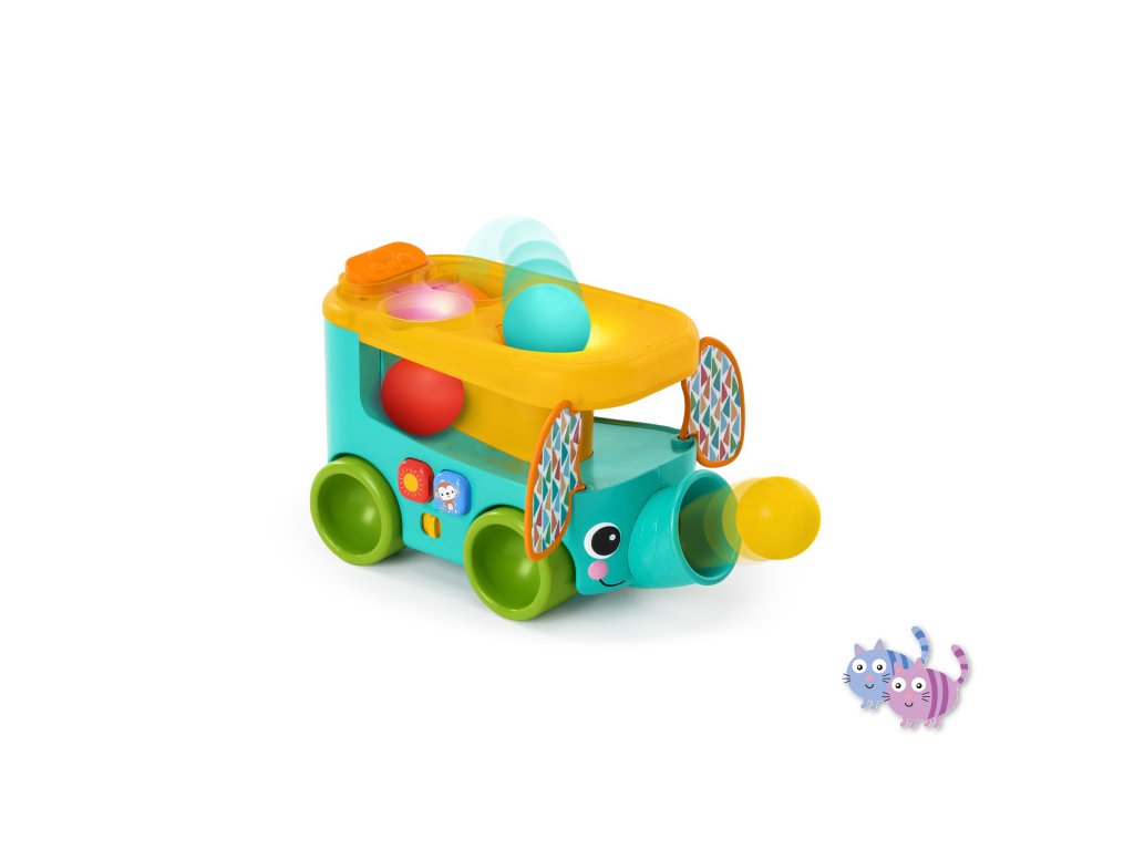 Miminko se nepřestane chichotat s tolika způsoby hraní a místy, kam umístit míčky v autobuse. Vhazujte míčky do některého z otvorů v horní části autobusu nebo stiskněte oranžovou páku, abyste míčky vpustili do otvoru pro extra zábavu. Světla, melodie a tropické zvuky odměňují miminko při nakládání míčků. Chcete-li se pobavit při plazení a honění, rolujte autobusem, aby z chobota slona vyskočil míček, nebo otevřete záda, aby se míčky vyvalily ven. Pro více zvukových efektů stiskněte tlačítko slunce a opice pro tropické melodie a zvuky zvířátek. Po skončení hracího času jednoduše uložte míčky do zadní části autobusu.