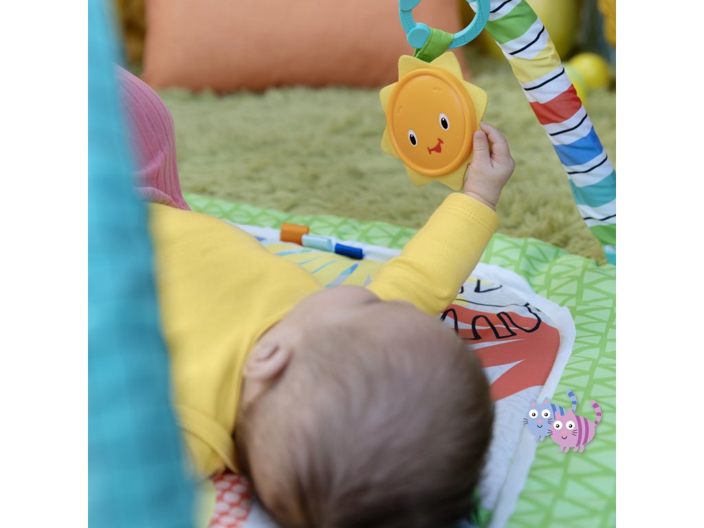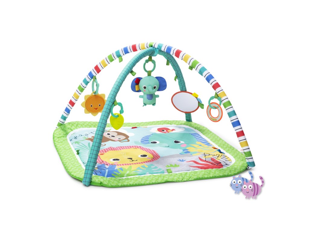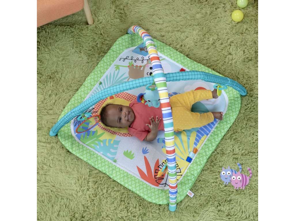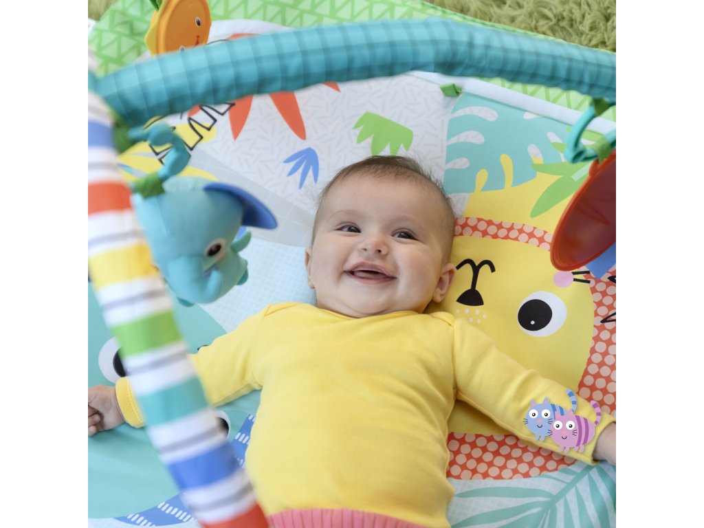 Dětská deka na bříško s tématikou džungle: Čeká vás safari plného hraní. Jasná poupata modré, zelené, oranžové, žluté a další zaujmou pohled vašeho děťátka spolu se zvířecími kamarády. Udělejte z hracího času safari s Wild Wiggles Activity Gym od Bright Starts. Vaše děťátko bude rádo ležet, kopat a hrát si na této dece. S novou, prostorově úspornou skládací hrazdičkou a 5 hračkami, které jsou součástí balení, je tolik zábavy na jednom kompaktním prostoru.