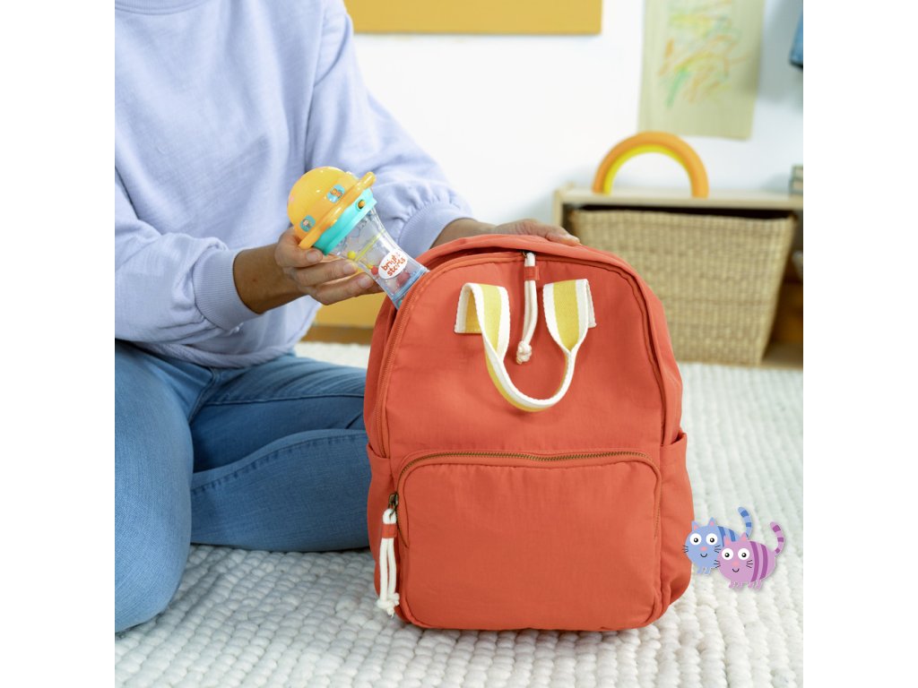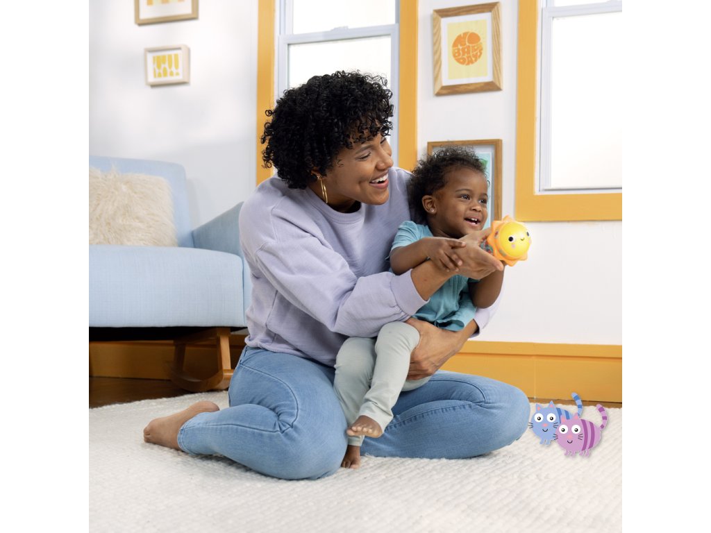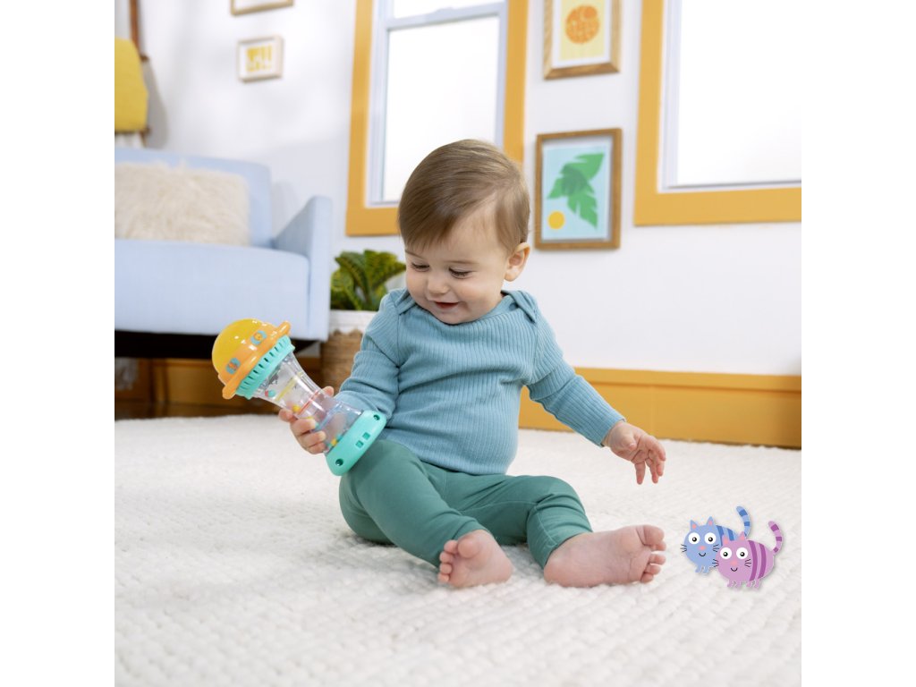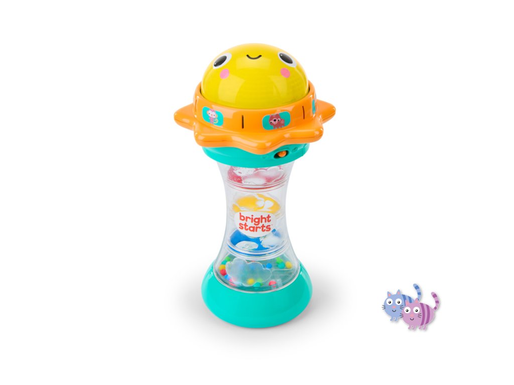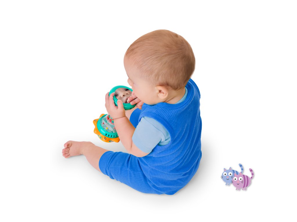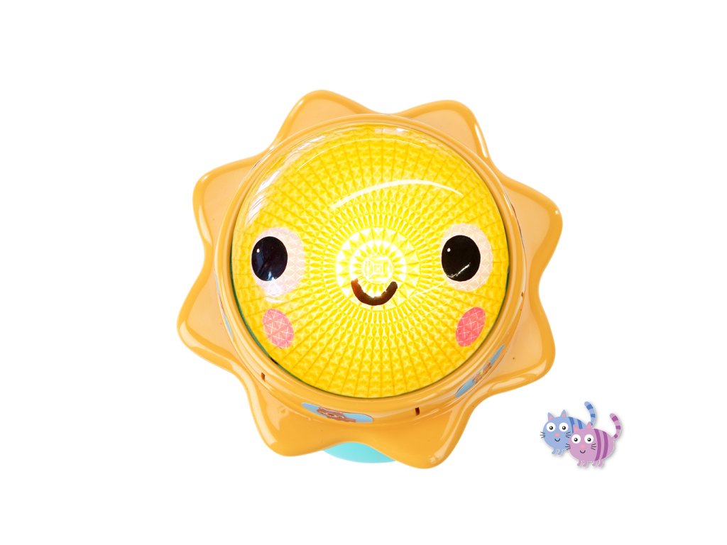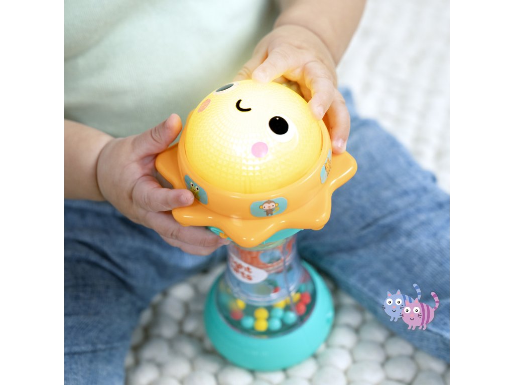 Svítící hračka zabaví miminko veselými světly, zvuky zvířátek a chrastícími kuličkami. Otáčej sluneční kopuli, která svítí, a objev více než 30 melodií a zvuků – od mňoukání, přes rýlení až po kvákání a další. Při potřesení se kuličky uvnitř rozkutálejí jako kapky deště, čímž dítě získává další vizuální i zvukovou stimulaci. Spodní strana hračky skrývá zrcátko, které podporuje vnímání vlastního odrazu a sebeobjevování. Tato interaktivní hračka pomáhá dětem pochopit princip příčiny a následku a je ideálním společníkem na doma i na cesty.