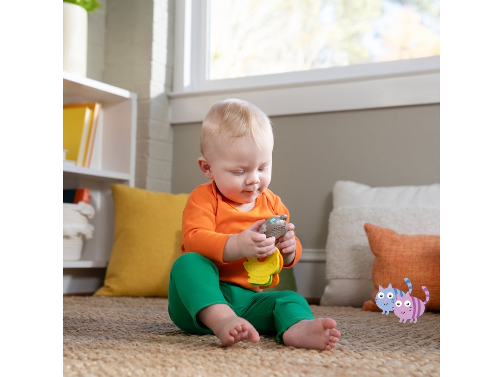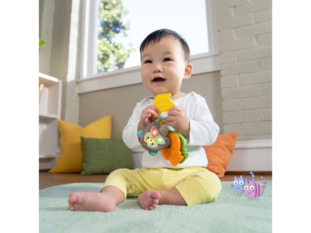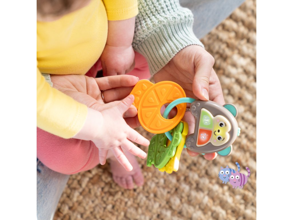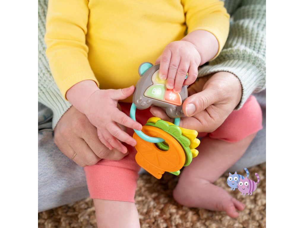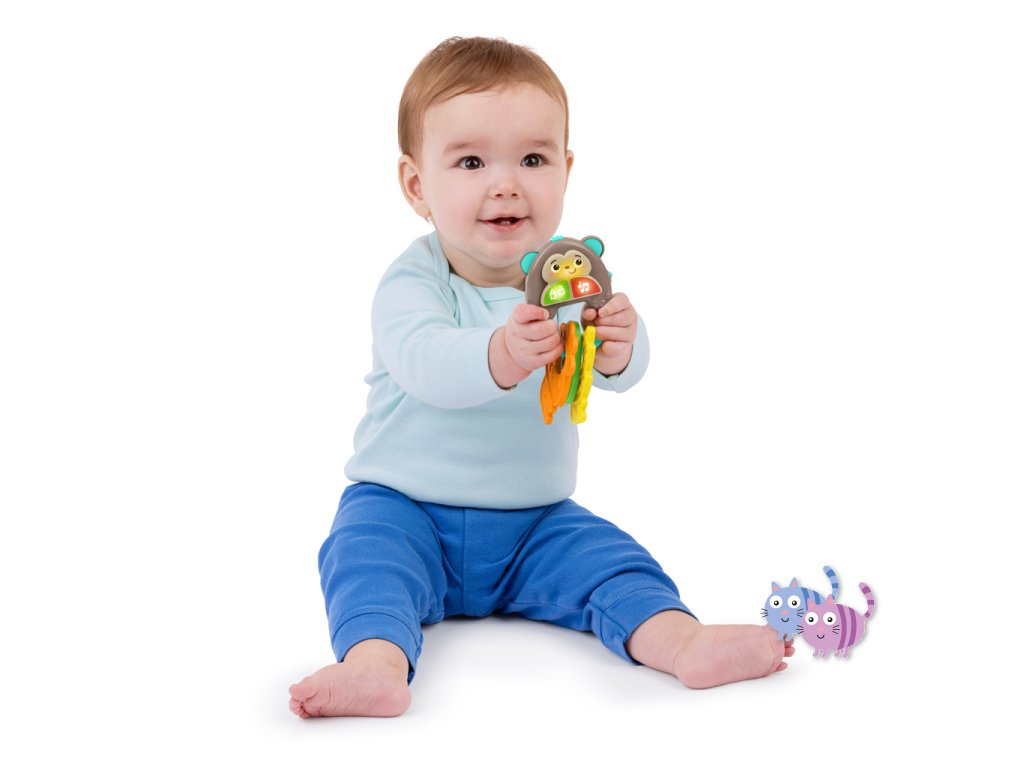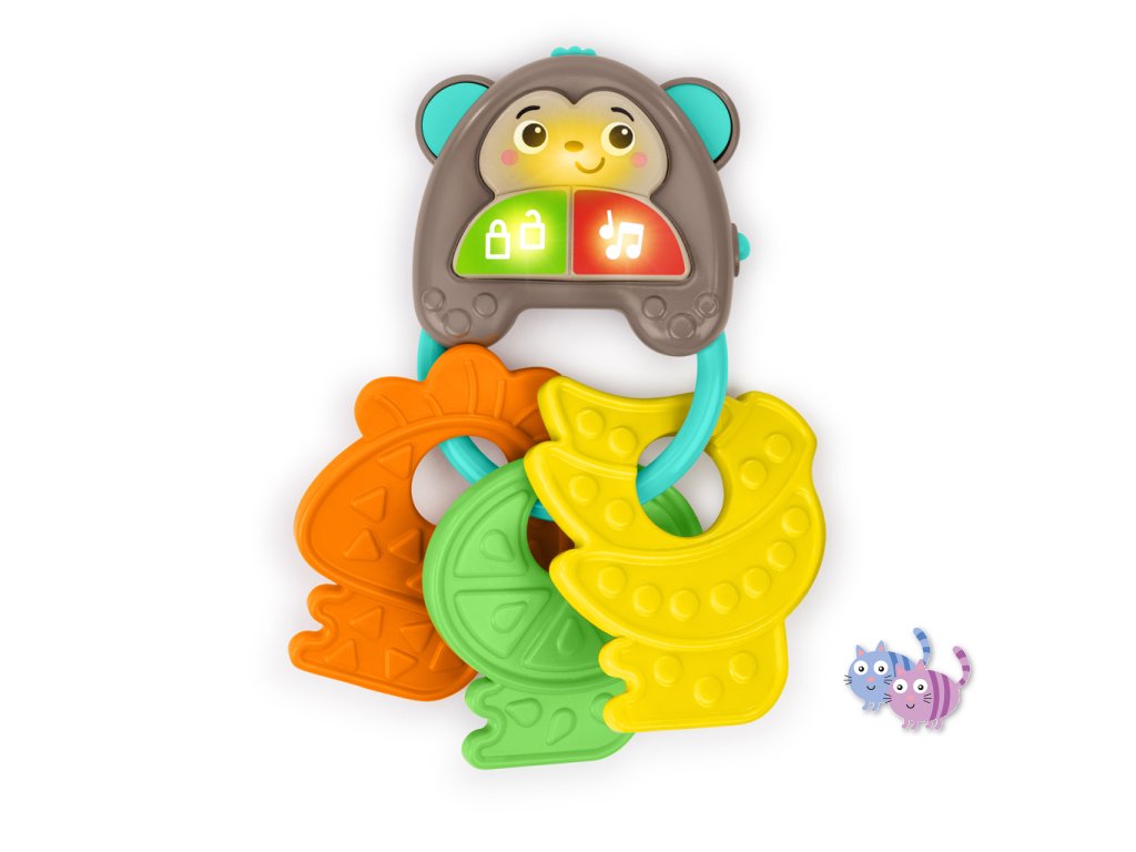 Zábavná hračka umožní děťátku cítit se a dělat věci jako máma a táta s vlastní sadou klíčů. Obsahuje více než 10 veselých zvuků aut, světel a melodií, které podněcují smysly a rozvíjejí motorické schopnosti. Tato interaktivní hračka je ideální pro doma i na cesty. Obsahuje milého opičího kamaráda, tři barevná tlačítka a texturované klíče ve tvaru ovoce. Pomáhá rozvíjet hmat, sluch a zrak miminka a podporuje učení se příčiny a následku. Hračka je lehká, přenosná a vejde se do většiny tašek na pleny.
