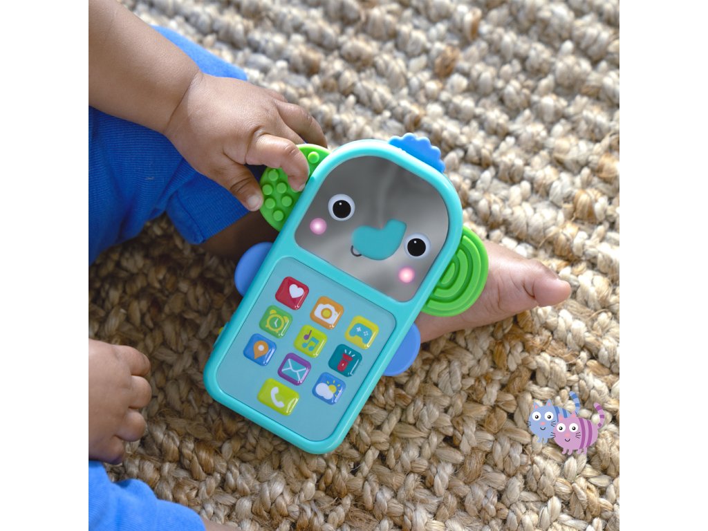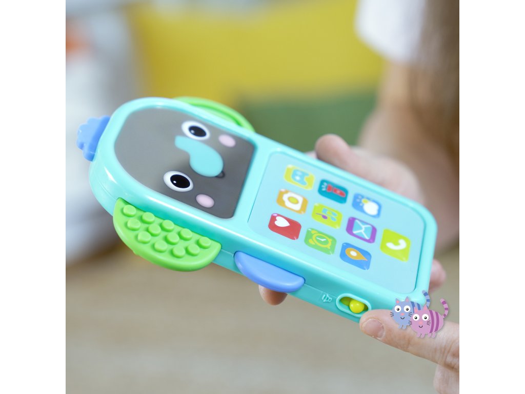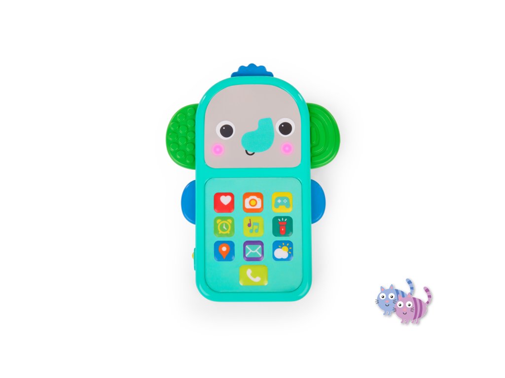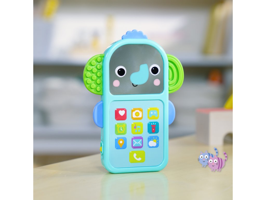 Tento veselý sloníkový telefon je jako stvořený pro malé ručičky a přináší spoustu zábavy a interakce. Interaktivní klávesnice je plná známých ikonek aplikací a zvuků, díky čemuž se děťátko bude cítit jako máma nebo táta. Každým stisknutím tlačítka se aktivují světýlka a melodie. Rozkošná sloníkova tvářička má svítící líčka a zrcátko pro objevování sebe sama. Jeho ouška jsou texturována pro dodatečnou senzorickou hru a hmatovou stimulaci! Hračka obsahuje více než 20 zvuků a melodií a funguje na 2 AAA baterie (nejsou součástí balení). Díky lehkému a přenosnému designu je ideální pro zábavu na cestách. Jednoduše se vejde do většiny přebalovacích tašek a skvěle doplní sbírku hraček na kočárek. Vhodné pro děti od 6 měsíců. Výborný dárek na křtiny, narozeniny či Vánoce.