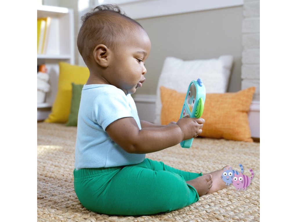 - Podpoř senzorické objevování s texturovanými oušky sloníka a rozpoznávání sebe sama přes zrcátko s rozkošnými svítícími líčky