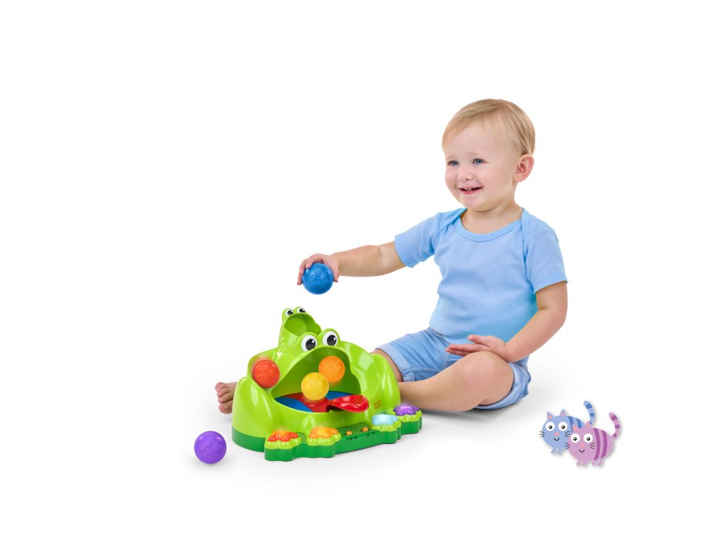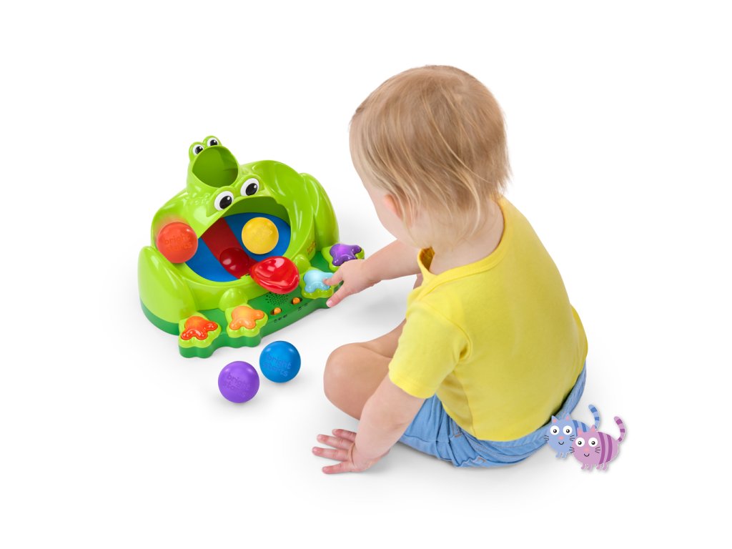 Hračka Poppin' Ball Frog přináší nekonečný smích a zábavu se svými skákajícími míči, hravými světly a zábavnými zvuky. Podporuje plazení, když se dítě snaží dohnat míčky! Nakrmte přátelského žabáka jedním z 5 míčků a sledujte jak skáčou na zabudované trampolíně v jeho ústech. Žabák baví děti čtyřmi způsoby hry – házení, vystřelování, kutálení a mačkání – tato interaktivní hračka podporuje učení příčiny a následku, přičemž zabaví dítě na celé hodiny. Navržena pro děti od 6 měsíců je ideálním doplňkem do vaší sbírky dětských hraček. Hra s míči je osvědčený způsob jak děti a batolata rozvíjejí své schopnosti, zatímco se skvěle baví. Skvělá hračka na darování při příležitostech jako narozeniny, svátky nebo jen tak – tento žabí kamarád si jistě získá srdce vašeho dítěte! Snadno se udržuje v čistotě pomocí vlhkého hadříku a jemného mýdla.