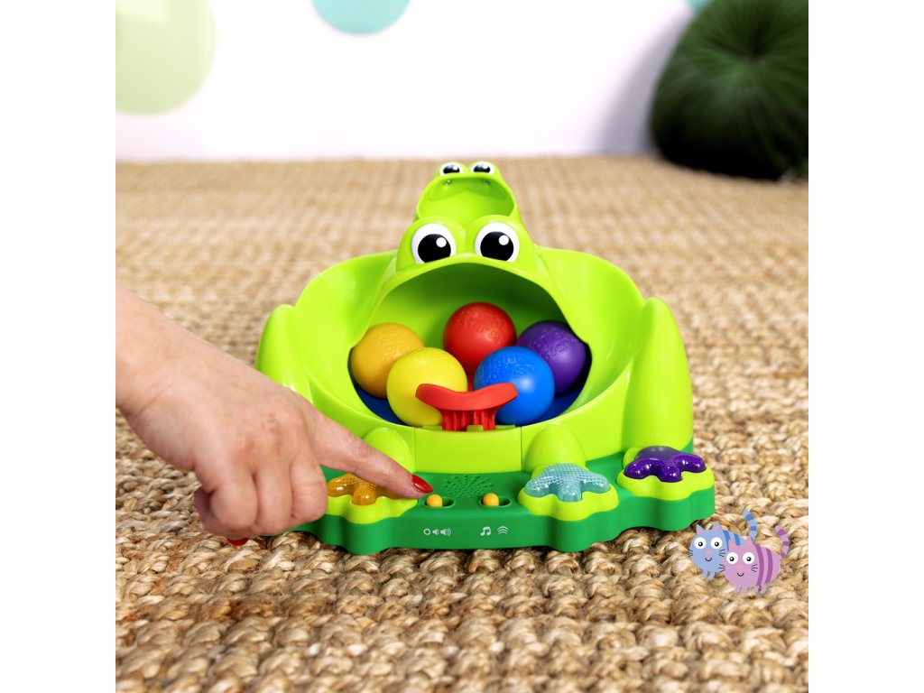- Stiskněte jednu ze 4 barevných nohou žabky a aktivujte světla a 50+ melodií/zvuků; žabí ústa mají zabudovaný trampolínový mechanismus, který zachycuje skákající míčky během hry