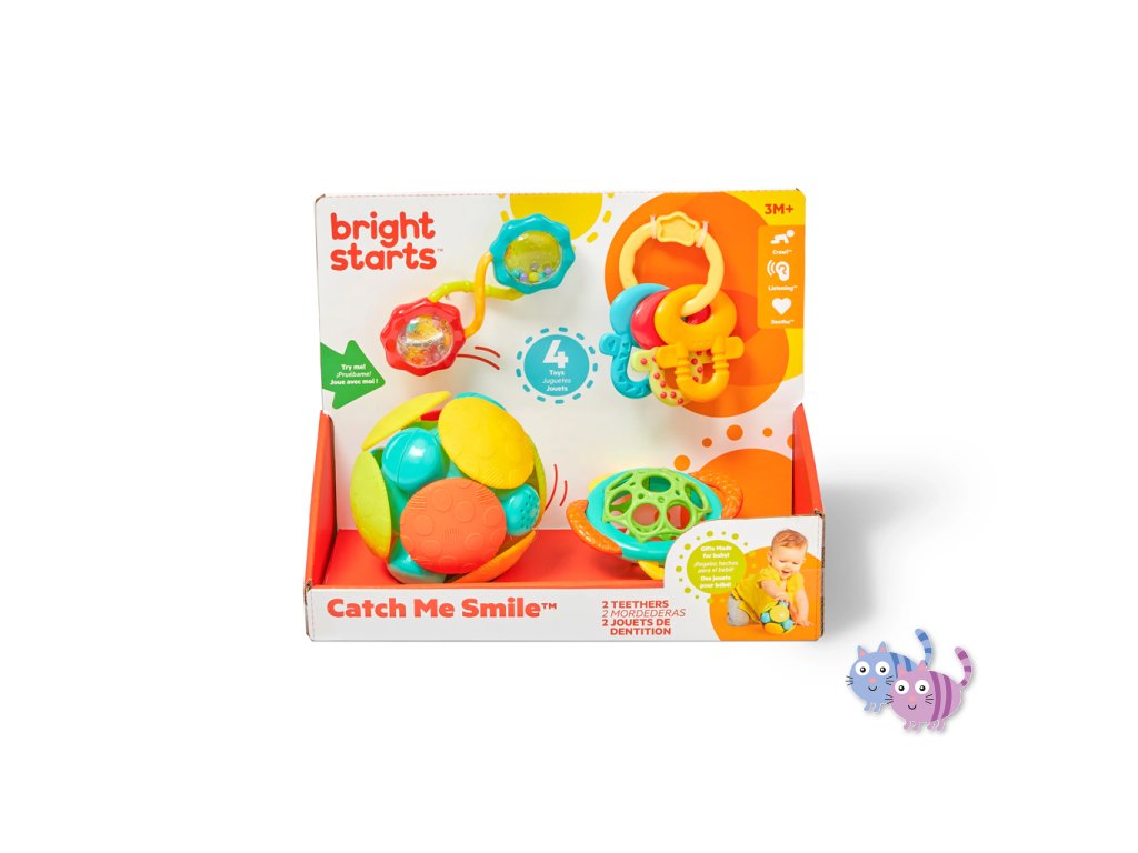 Balíček radosti s dárkovou sadou Catch Me Smile je set hraček plný nezbytností pro rodiče a oblíbených dětských hraček. Lehce uchopitelné rukojeti, chrastící korálky a zrcadlové povrchy dělají z chrastítka Rattle & Shake Barbell perfektní doplněk do hracího boxu nebo přebalovací tašky na cesty. Když se začnou prořezávat první zoubky, dvě přiložené kousátka zachrání situaci! Různé výstupky a textury na kousátku Grasp & Teethe pomáhají uklidnit bolavé dásně, a díky uchopitelnému materiálu Oball a otvorům na prsty si jej miminko snadno udrží samo. Tři barevné klíče License to Drool nabízejí spoustu ploch ke kousání. Jak miminko roste, elektronická lezící hračka Wobble Bobble se kutálí a motivuje ho k pohybu! Vaše miminko v období prvního plazení si tuto hračku k honění zamiluje.