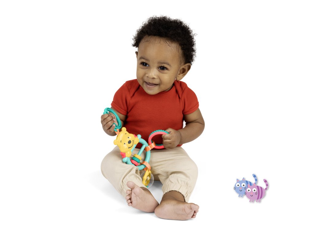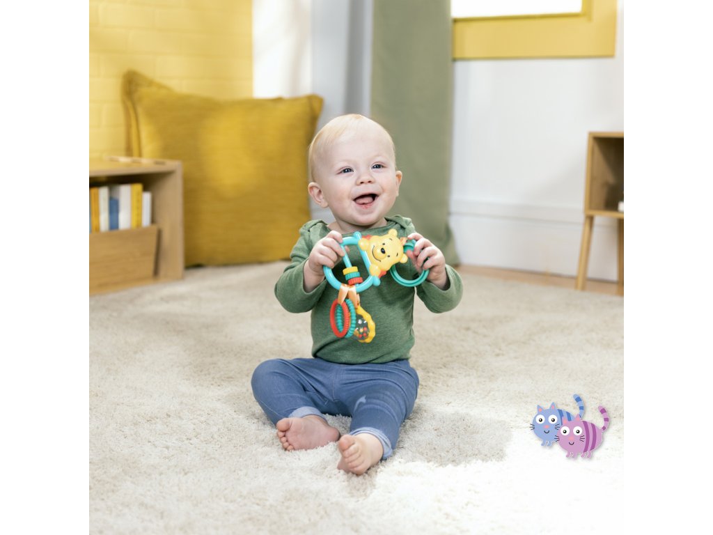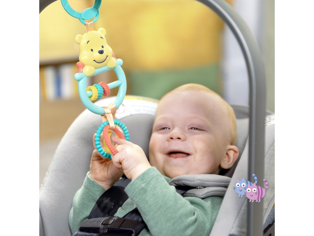 Nechte své malé zvídavé „včelky“ bzučet radostí s touto roztomilou hračkou s motivem medvídka Pú! Tato všestranná a smyslově podnětná hračka poskytuje až 3 způsoby hry, které podporují vývoj jemné motoriky a smyslové vnímání. Ideální společník na doma i na cesty díky praktickému C-kroužku pro uchycení ke kočárku či autosedačce. Hračka je vyrobena z bezpečných materiálů, certifikovaných pro nejmenší děti. Jemné barvy jsou inspirovány Stoakrovým lesem, který představuje bezpečné, dětské a kouzelné prostředí, kde se dějí všechna dobrodružství. Pro děti je to symbol přátelství, fantazie a hravosti a žijí v něm všechna zvířátka z pohádky Medvídek Pú.