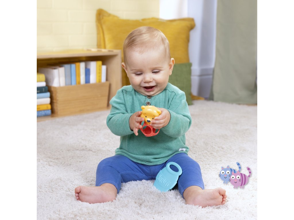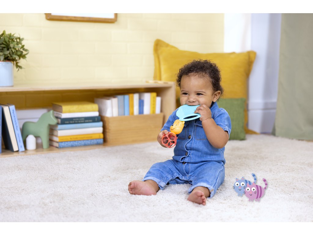 - Chrastítko Oball - lehká, pružná a ideální pro drobné ručičky – podporuje jemnou motoriku, sluchové vnímání a hmatové objevování.