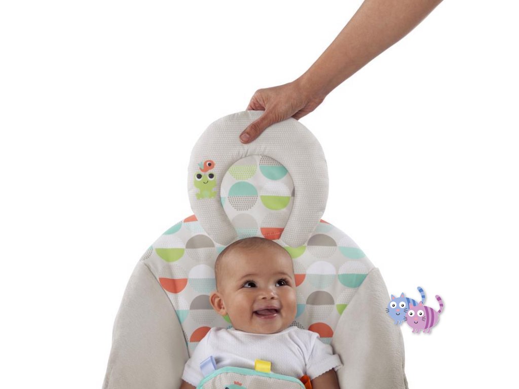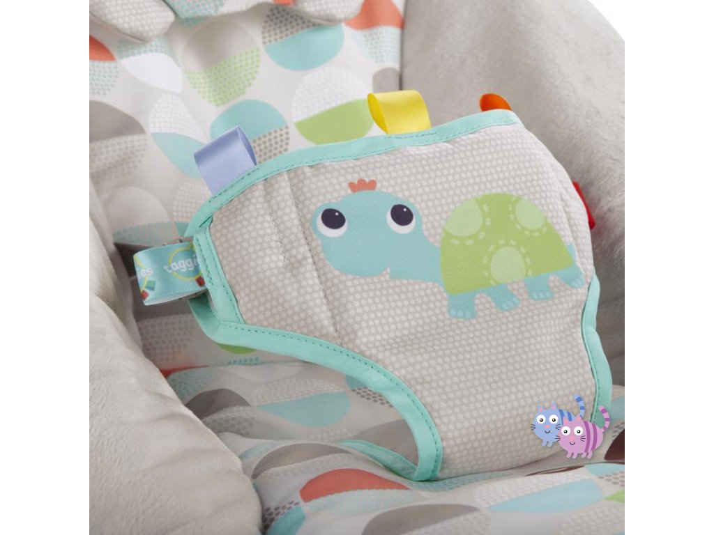 Lehátko Happy Safari bude děťátko rozmazlovat a bavit usmívajícími se zvířátky, ze kterých se stanou jeho nejlepší přátelé. Pozorujte, jak se dítě cítí v lehátku pohodlně a bezpečně, čímž bude nápomocné i rodičům. Snadno jednou rukou odepněte hrazdičku, zatímco ve druhé držíte děťátko. Uklidňující vibrace a příjemné melodie napomáhají děťátku odpočinout si a užít si čas strávený v lehátku naplno. Plyšový potah a oblíbené saténové stužky Taggies podporují hmatový rozvoj děťátka. Lehátko má tříbodový bezpečnostní pás a protiskluzové nožičky.