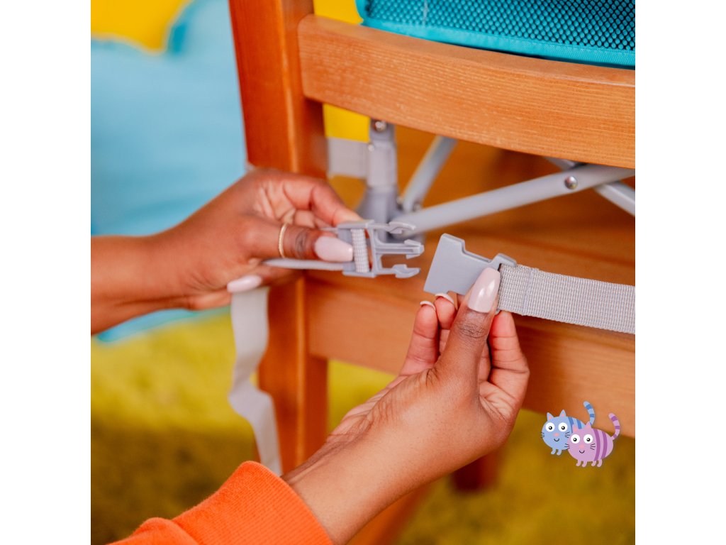 - Neutrální šedé barevné provedení; obsahuje 3-bodový bezpečnostní pás, pultík a bezpečnostní popruhy pro upevnění ke židli pro dospělé
