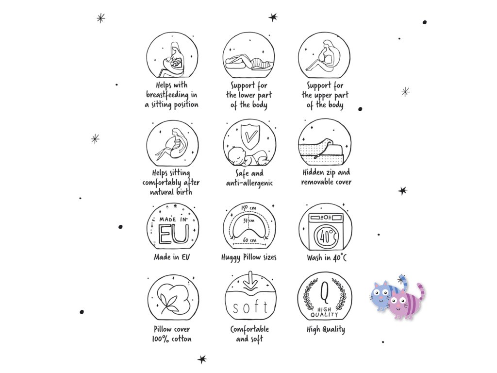 - Polštář Huggy pomáhá v době odpočinku a při spaní s velkým bříškem. Když už je děťátko na světě, usnadní krmení, uleví zádům a umožňuje zaujmout pohodlnou pozici při kojení.