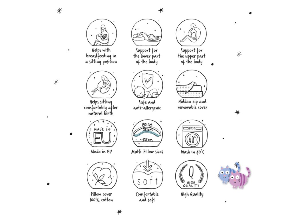 Důležité: Před každým použitím vždy zkontrolujte stav polštáře, aby byla zajištěna maximální bezpečnost a pohodlí pro vás i vaše dítě.