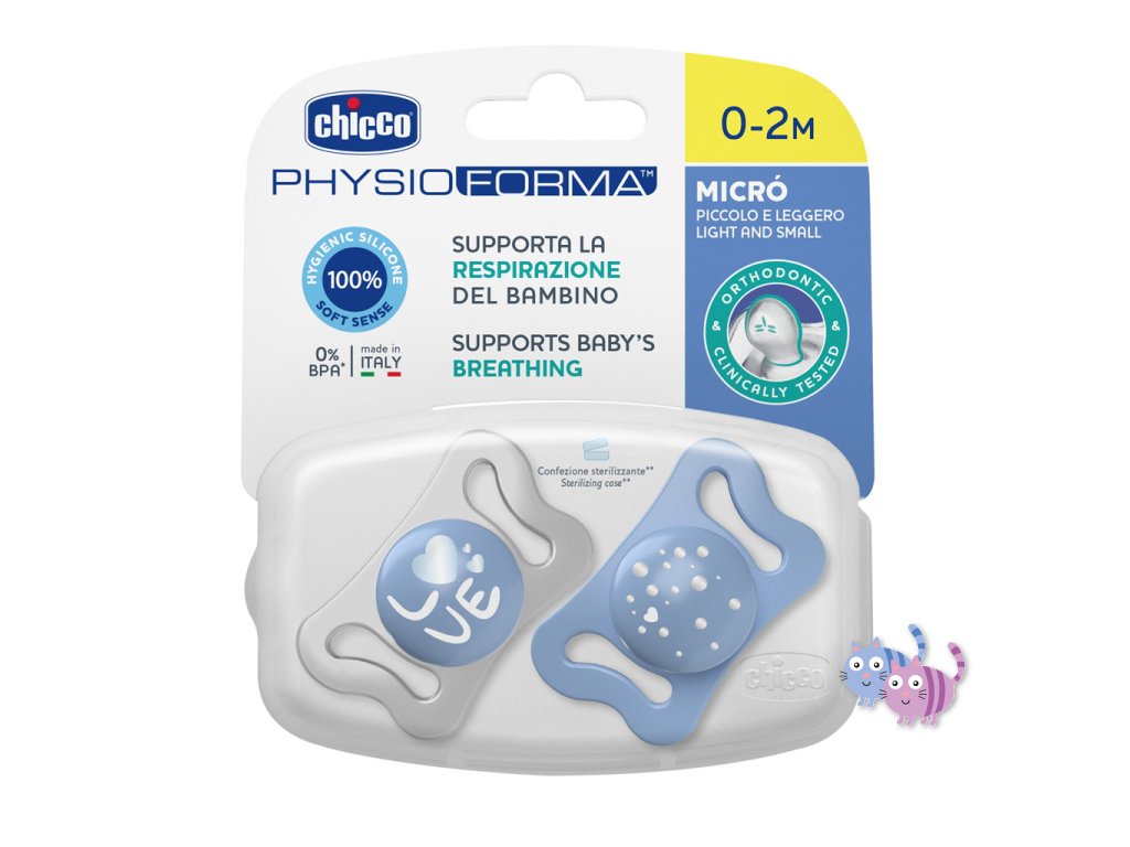 Vyrobeno ze silikonu což je hygienický, praktický materiál, který se nedeformuje. Díky exkluzivní povrchové úpravě SOFT SENSE je měkký a sametový. Dudlík Chicco PhysioForma Micrò 0-2m díky svému exkluzivnímu tvaru podporuje správný vývoj úst a pomáhá umístit jazyk dopředu, čímž podporuje fyziologické dýchání.