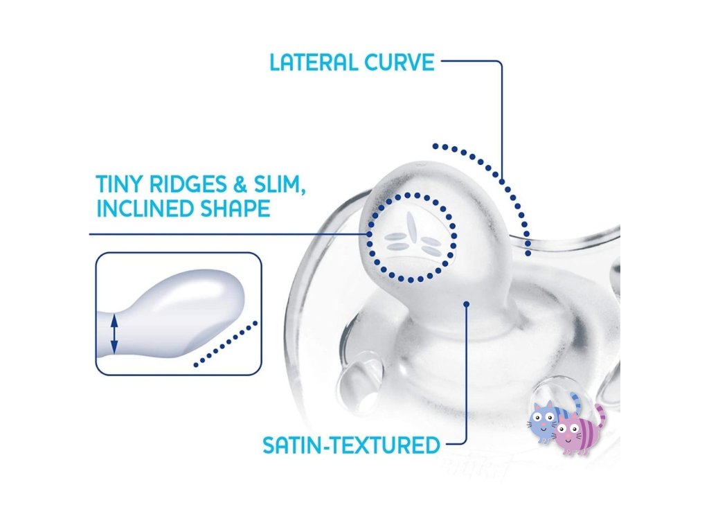 - extrémně měkká zúžená patička dudlíku umožňuje dítěti zavřít ústa a redukuje riziko nerovnoměrných zubních oblouků (je ortodonticky korektní)
