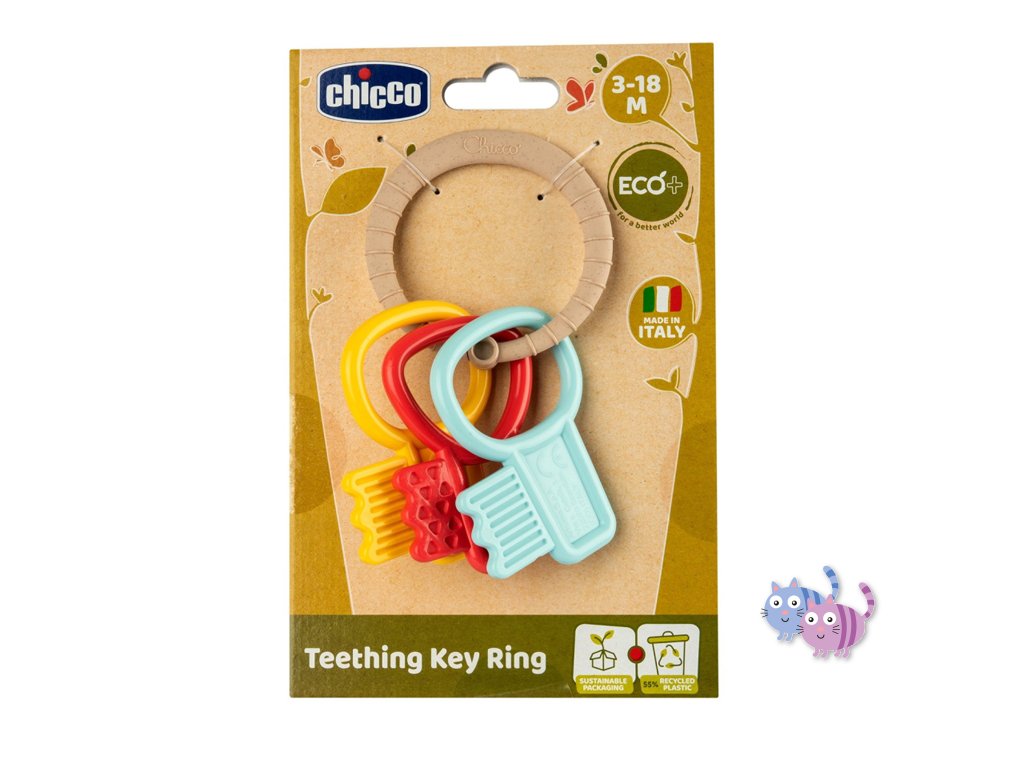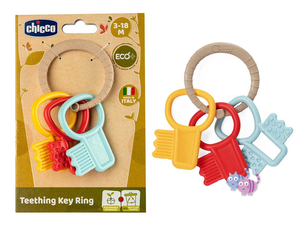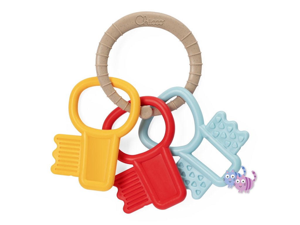Ikonická kousátka Chicco ve tvaru klíčků z kolekce Eco+ je vyrobena z recyklovaného plastu. Kousátko stimuluje koordinaci, chrastí při třesení a zklidňuje dásně při růstu zoubků.
